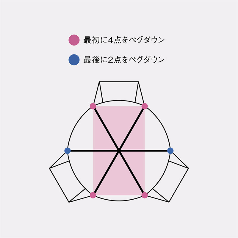 サークル形状(六角形)は引っ張りあう力の配分が難しく、変形しやすいため自ずと設営しにくくなることが欠点でした。四角形の場合は、直感的に形状をつくりやすいため設営しやすい反面、空間の広さと快適性を損なわれてしまいます。そこで、まずは4コーナーをビルディングテープで結び、テンションをかけながらペグダウン。次に、センターにポールを入れて自立させ、最後に残りの2コーナーをペグダウンすることで簡単かつ奇麗に設営することが可能になりました。