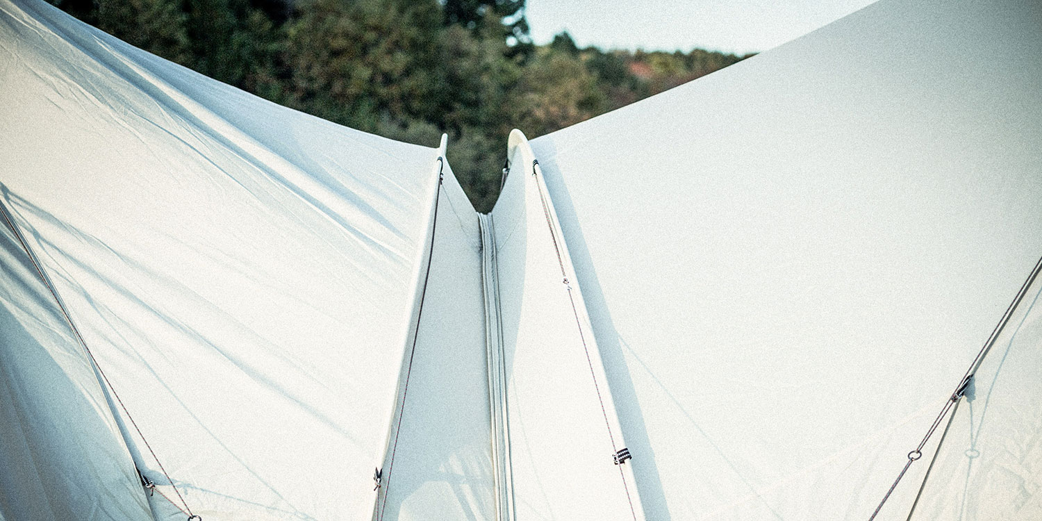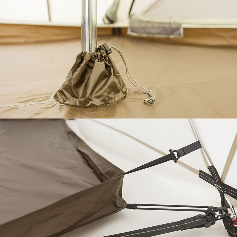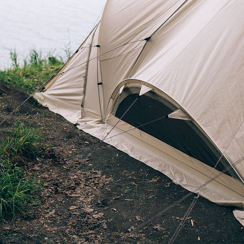 ワンポールシェルター構造の強みである上から下に押さえつける力を最大限活かすため、縫製ラインが地面につながるように設計。その上でフレームを活かしワンポールシェルターのポテンシャルを向上させました。