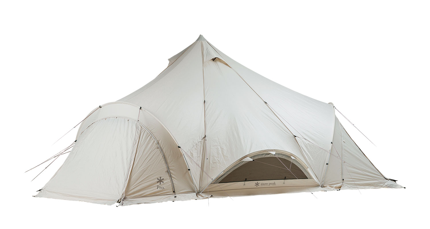ティピやゲル、パオといった乾燥地帯や砂漠などで利用される移動式住居のワンポールシェルター。その歴史は古い。過去の文献からもみてとれるように、生活に密接に関係した歴史や、その構造物としての美しさからも、テントの開発を生業とするメーカーとして非常に興味のある分野だった。しかし、スノーピークが提案する「快適性」を求めたオートキャンプというカテゴリーにあてはめた際、既存のワンポールシェルターが「快適性」に優れているかというと決してそうではなく、また、ワンポールシェルターの歴史や文化を尊重する意味においても、快適性を求めるべきではないと判断し、開発は長年控えられていた。近年、各社が こぞってワンポールシェルターをリリースする中、スノーピークが開発に踏み切った理由は3つ。1つはグランピングのスタイルを追求し始めていた時期だったということ。もう1つは、ユーザーの皆様からいただいた開発を熱望する多くの声。そして最後の理由は、ワンポールの美しいシルエットを生かしつつ、ワンポールの最大のデメリットである「乏しい居住性」を飛躍的に向上させる構造と、スノーピークらしいドッキングのアイデアが浮かんだからだ。