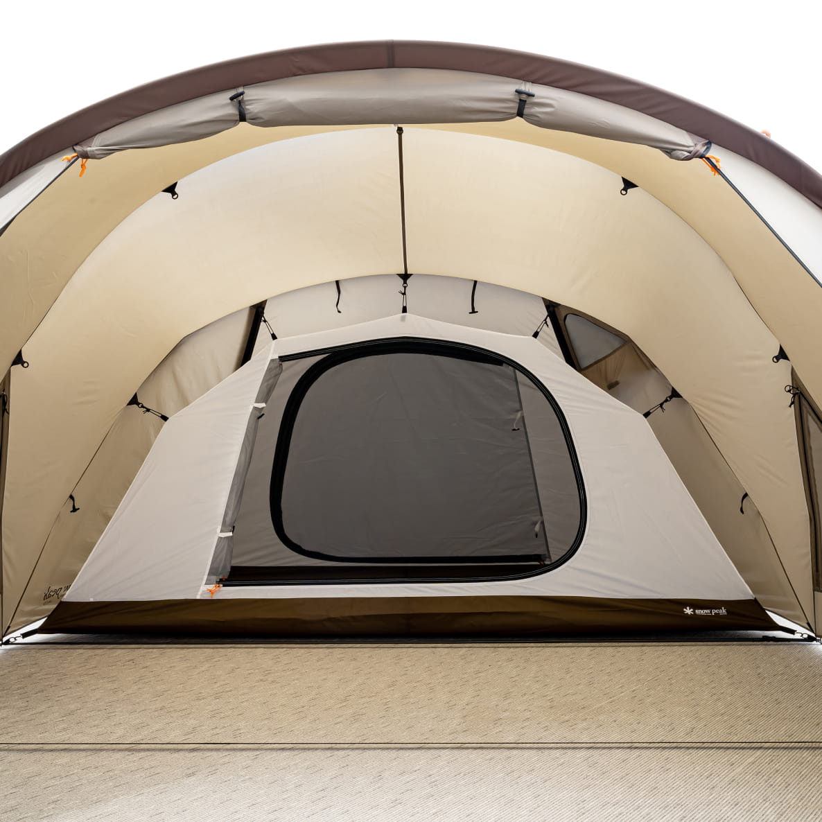 付属のインナールームは4方向にメッシュを備えています。スノーピークのエントリーラインのテントの中では唯一の仕様で、快適性が大きく向上しています。
