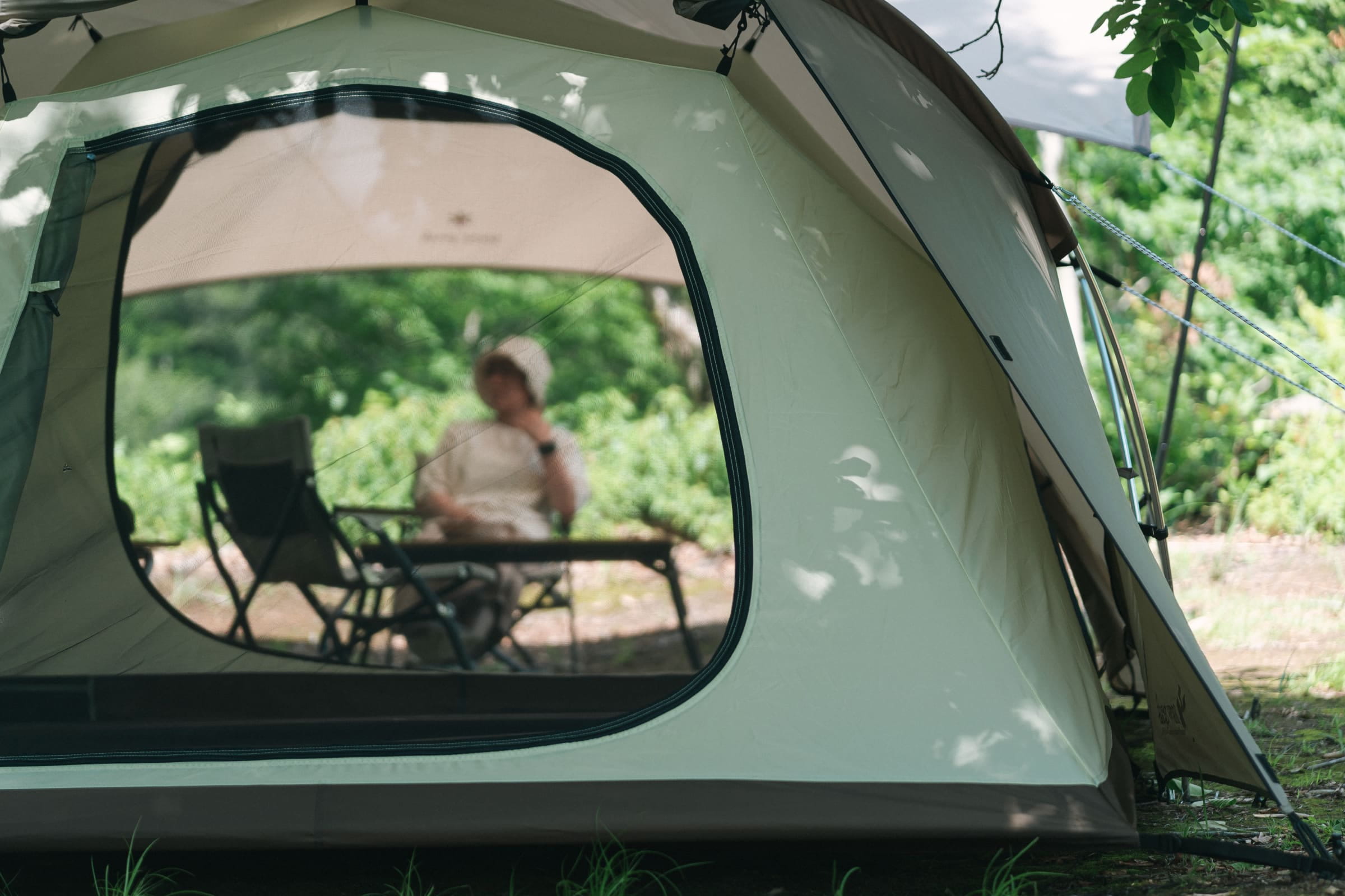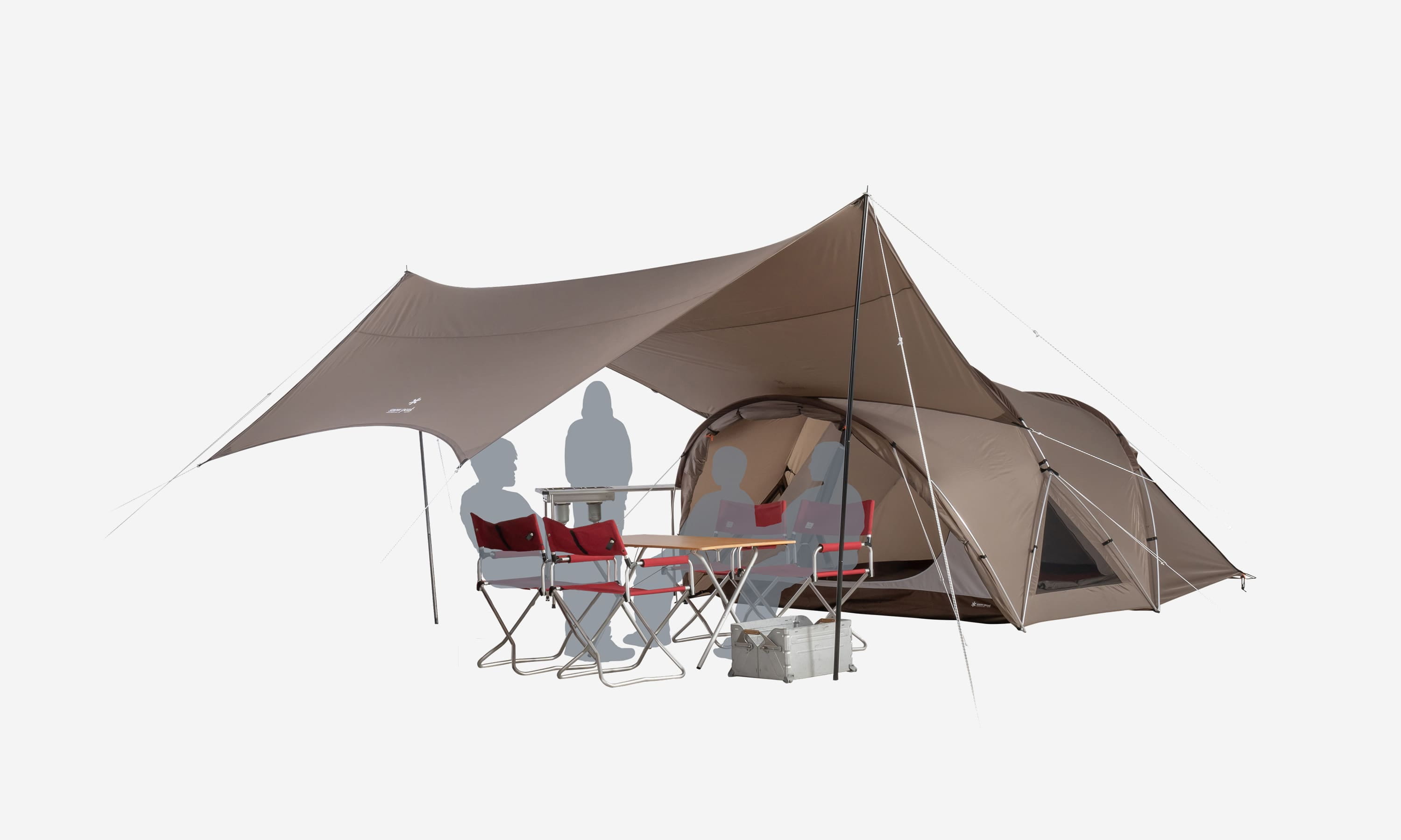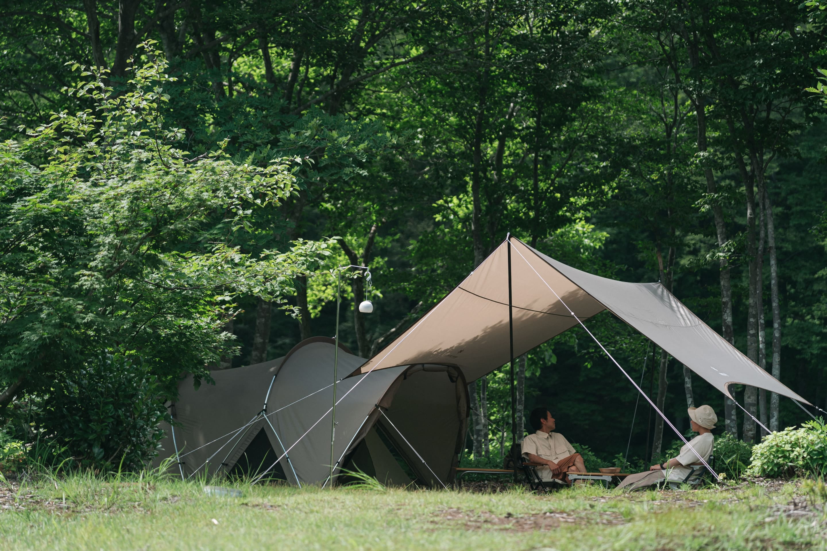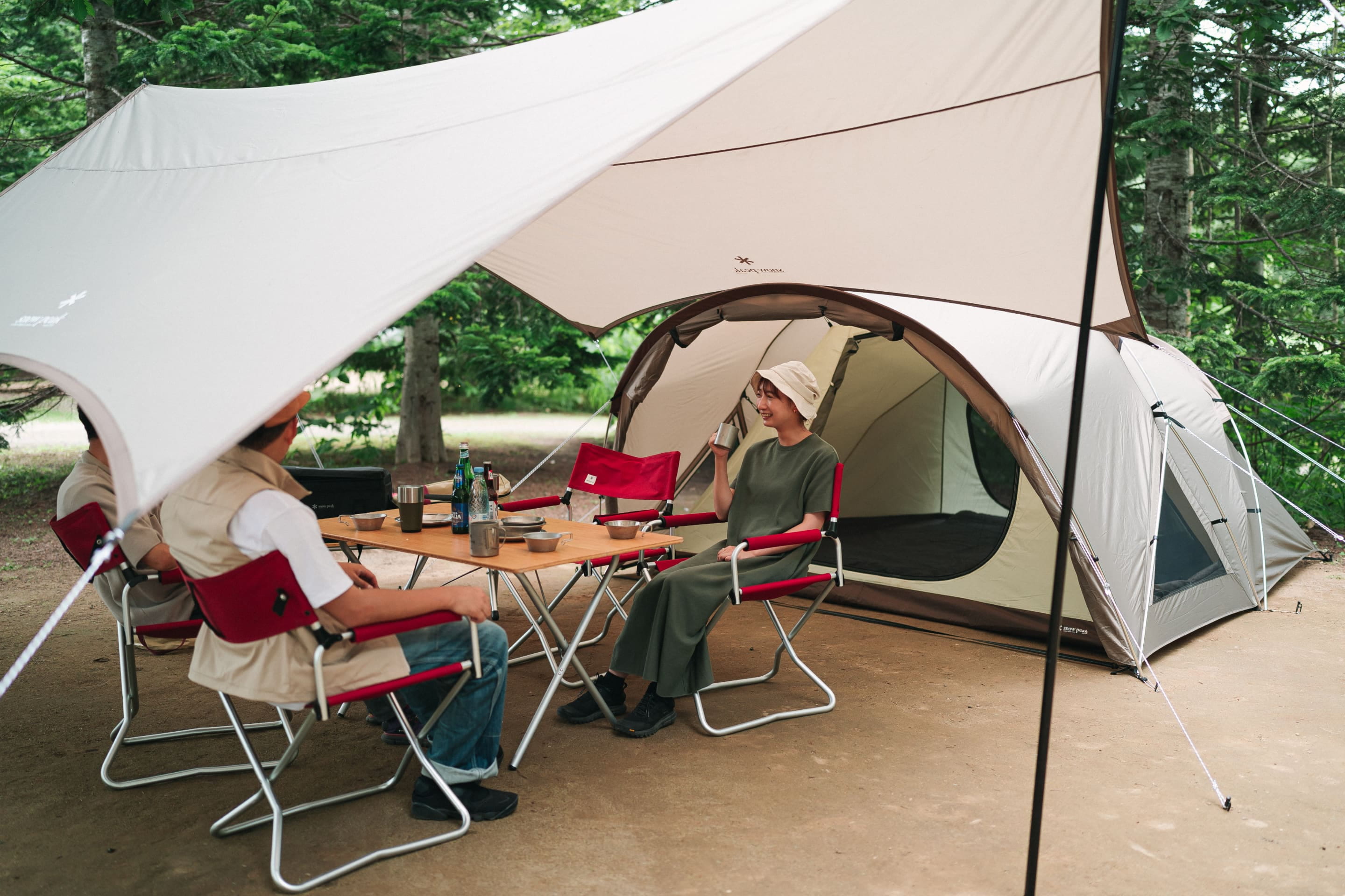 キャンプ未経験の方でもストレスなく使えるよう、細部まで工夫を施したテントとタープをセットにしました。立てやすさと強度を両立したテントは、フライシートとインナーテントの両方にメッシュパネルがあり、風通しが抜群。日差しを遮って影をつくるタープは、快適なリビング空間として活用できます。多目的に使える汎用性の高さも魅力のモデルです。