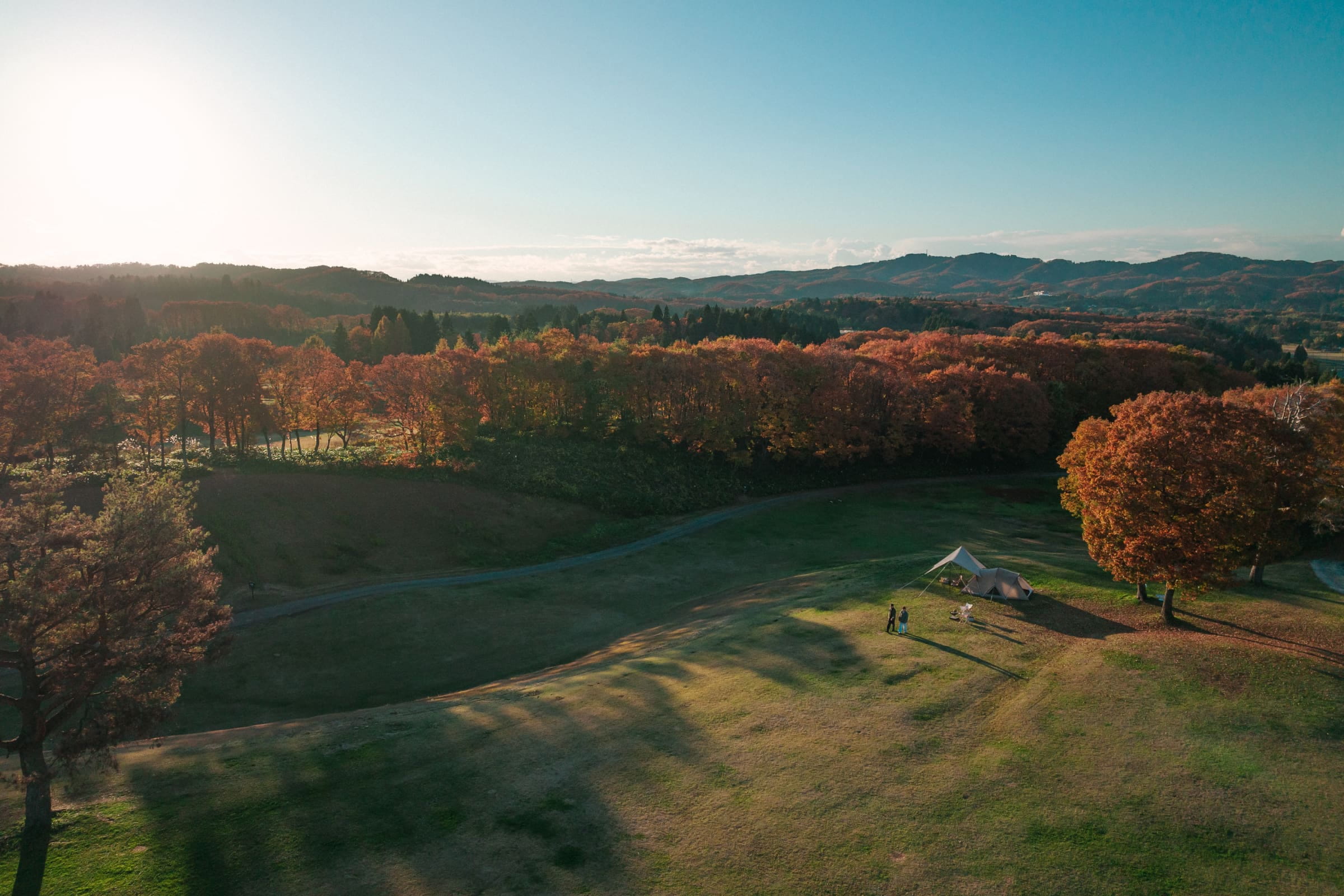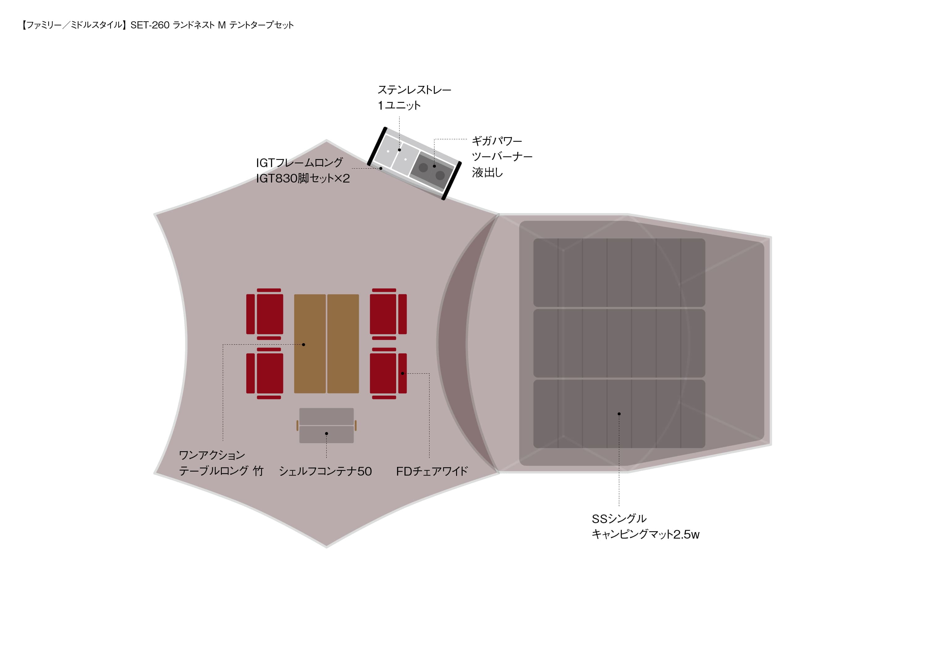 タープの長辺にテントの入口が直角に交わる基本のレイアウトで、最大9×9m。一般的な区画サイト(10×10m)に、余裕をもって収まるよう設計しています。