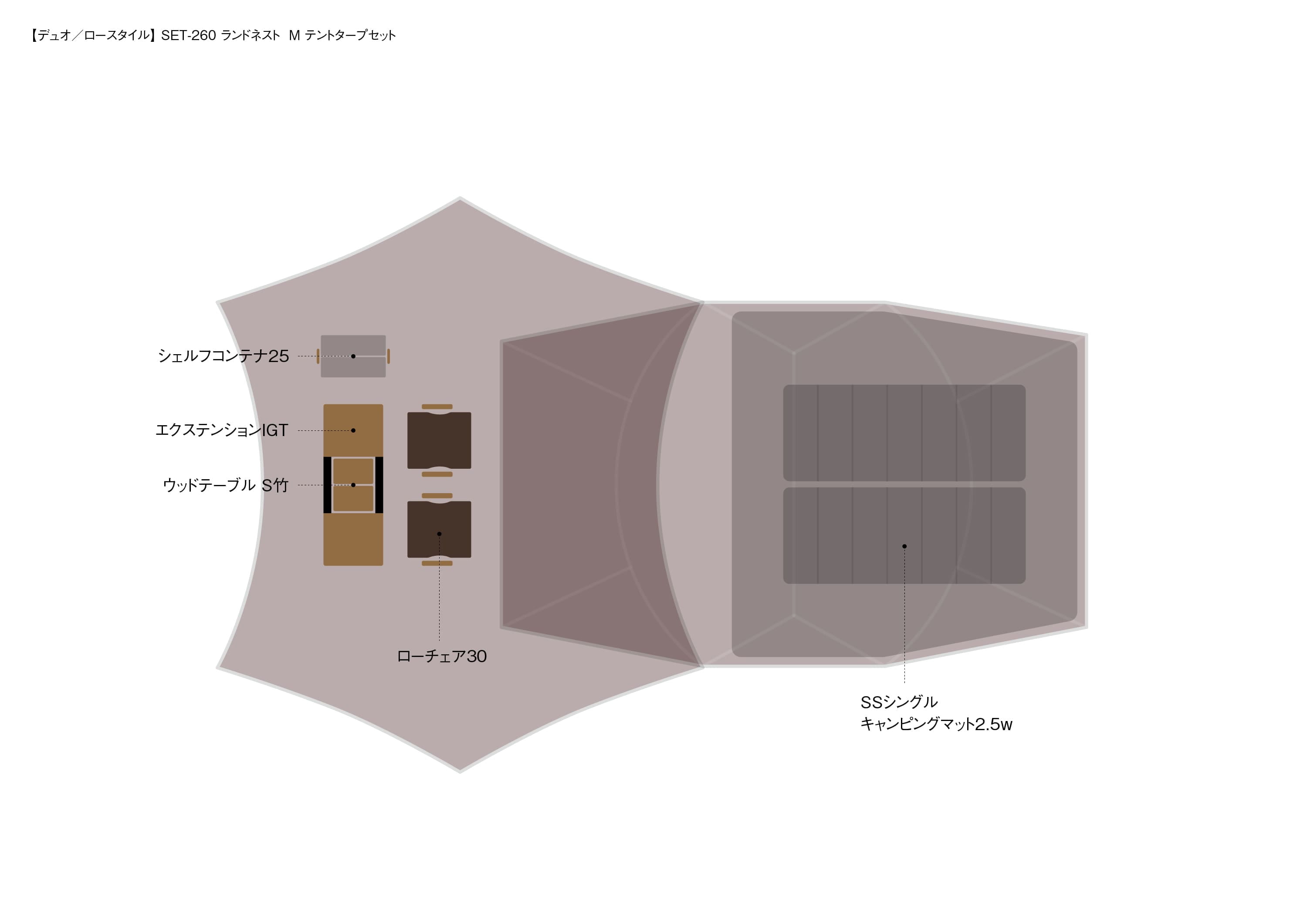 | セット内容 | テント本体、インナーテント、センターフレーム(×1)、Aフレーム(×2)、Cフレーム(×2)、ジュラルミンペグ(21cm×14)、自在付ロープ(3m×6)、キャリーバッグ、フレームケース、ペグケース |