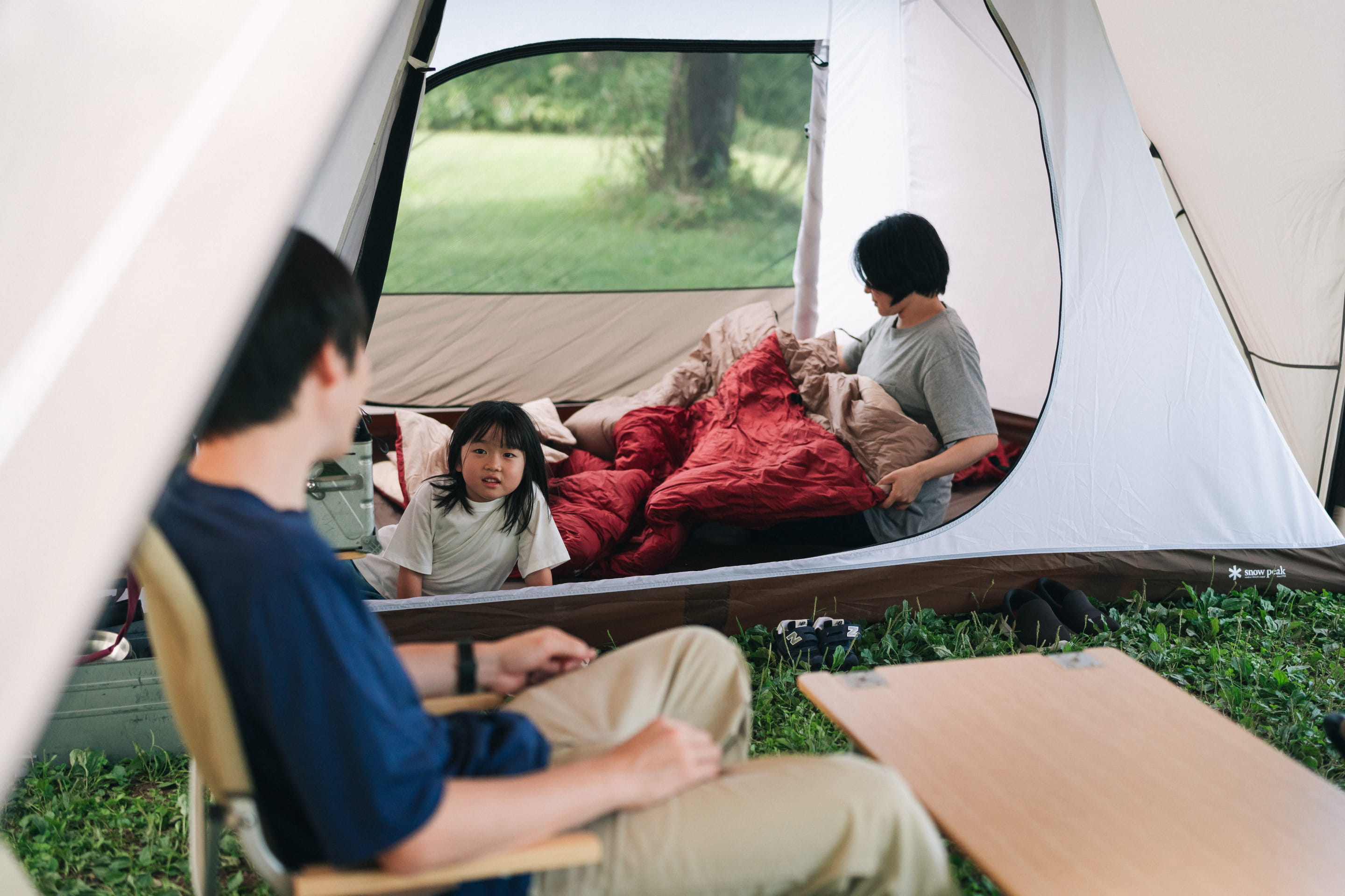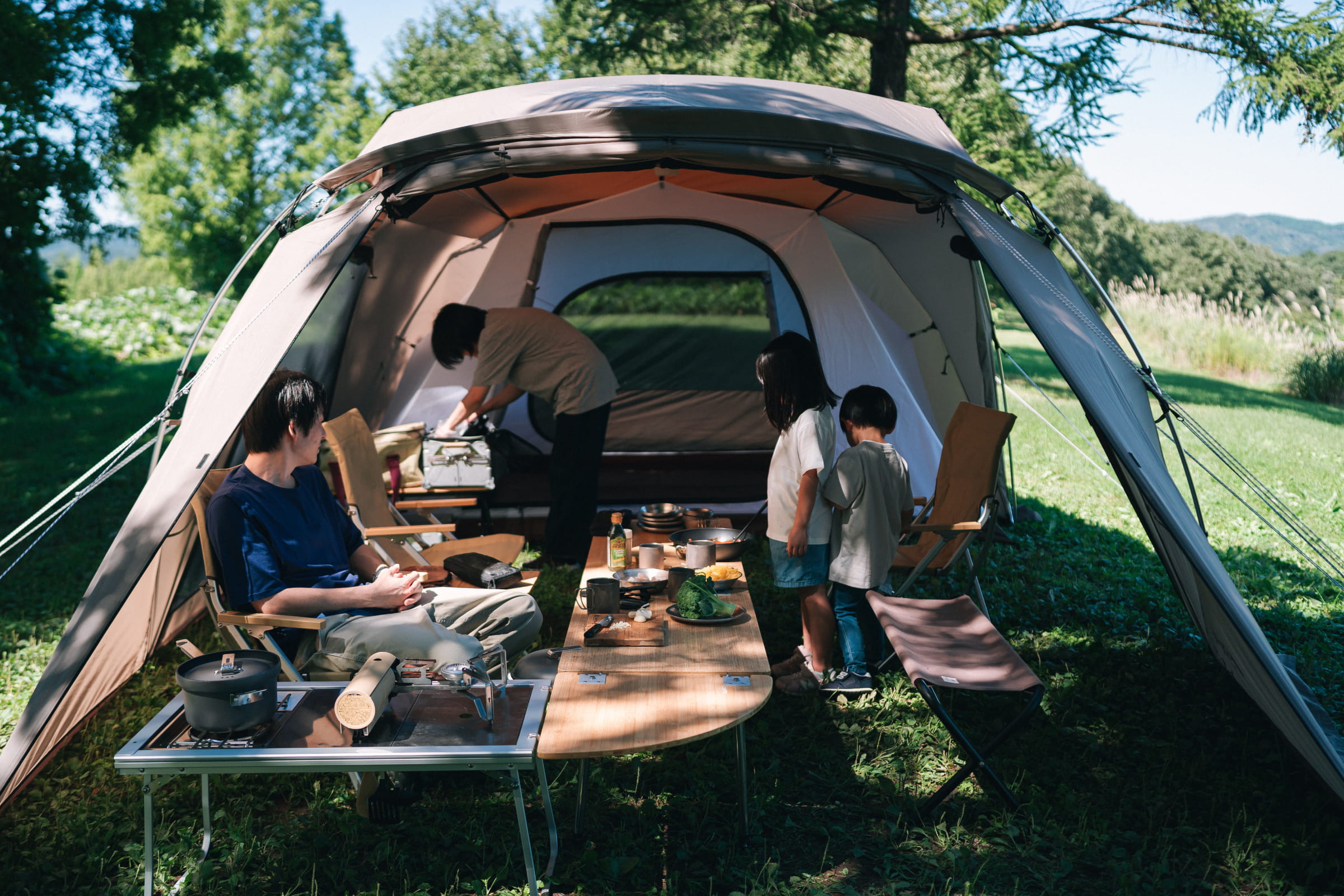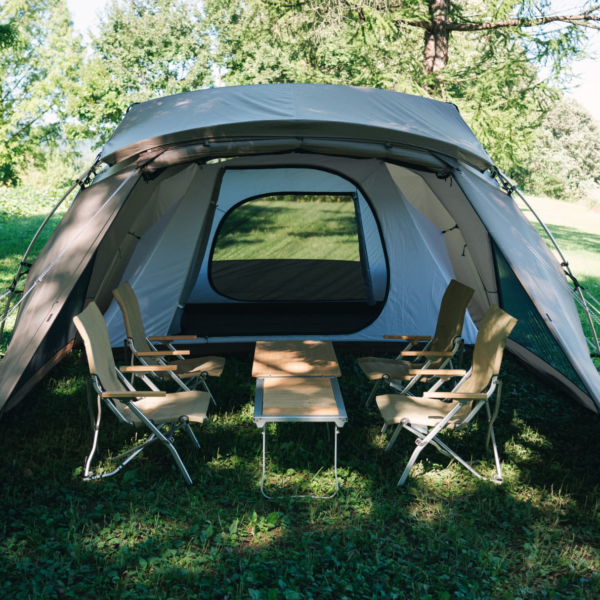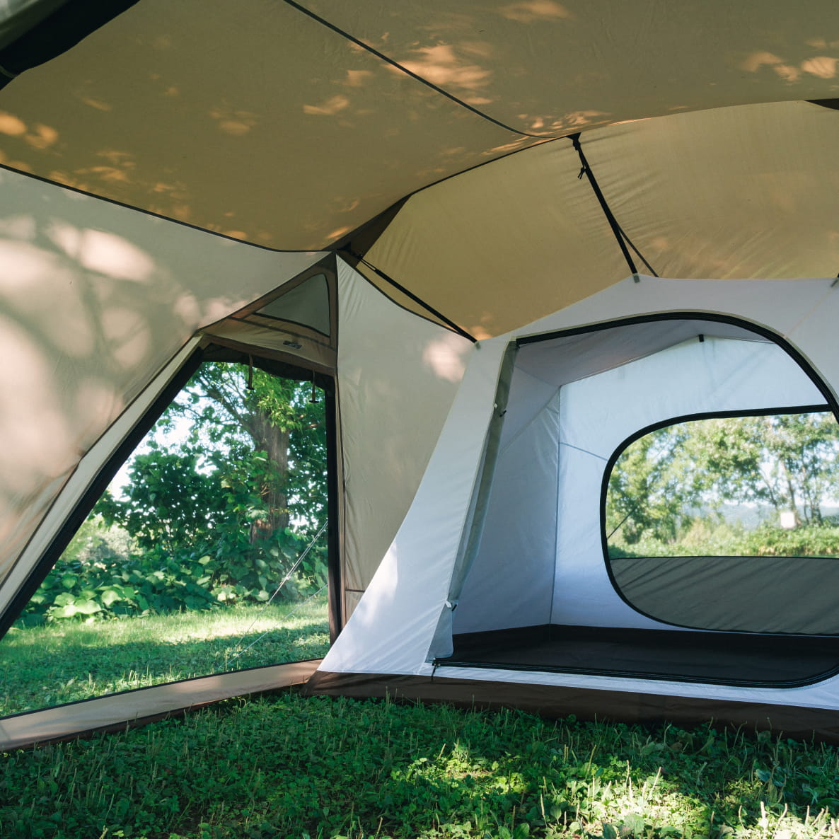 リビングと寝室が一体化した2ルームシェルターは、一度の設営で完了。家族4人で快適に過ごせます。付属の吊り下げ式インナールームを外せば大型シェルターとしても活用できます。