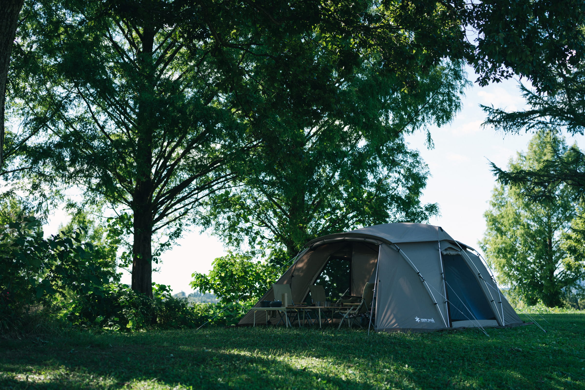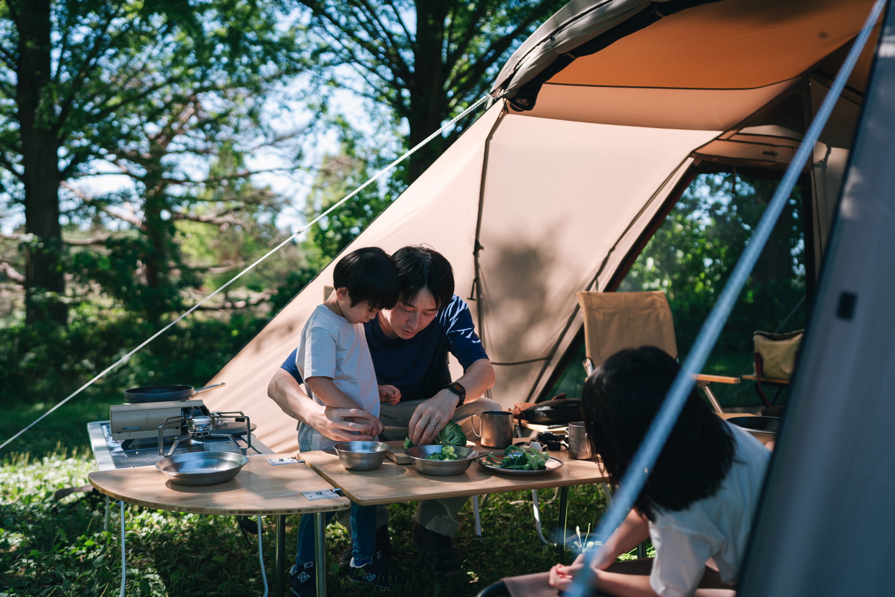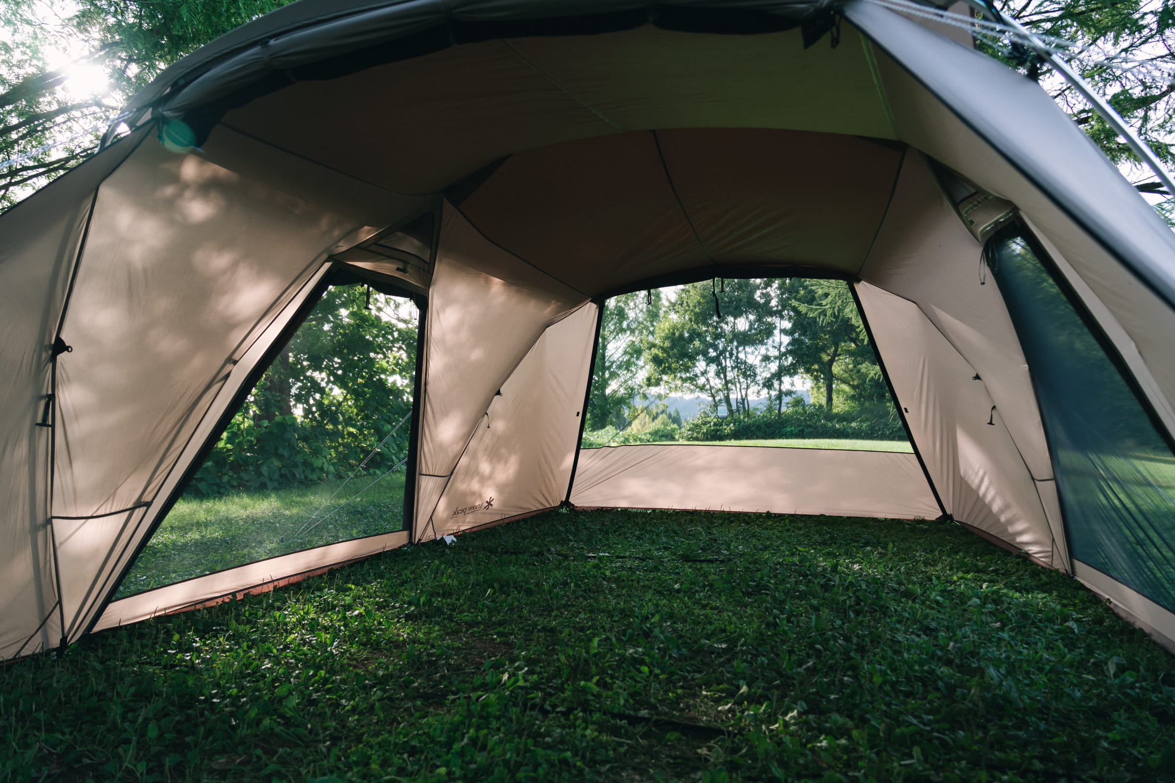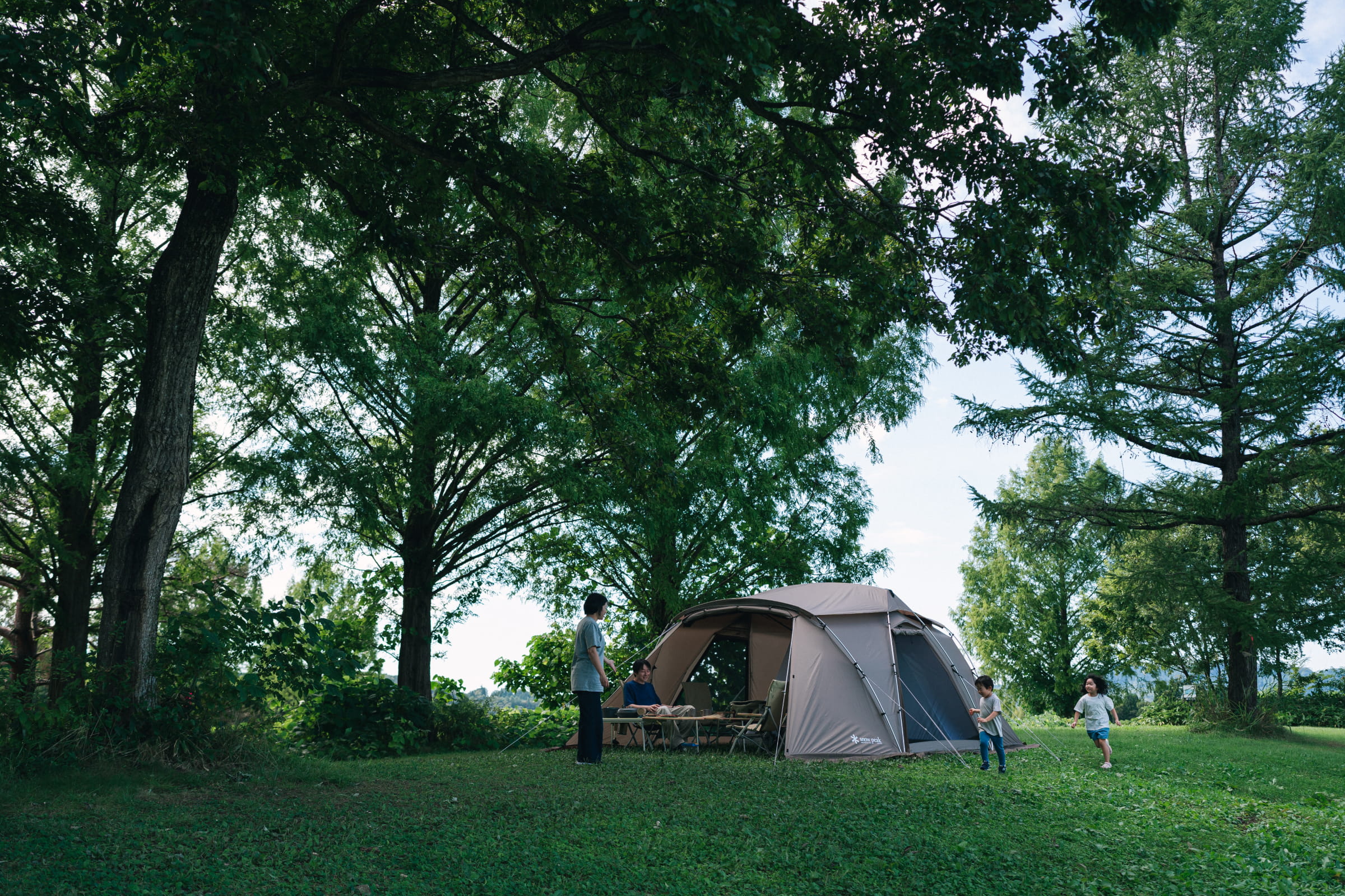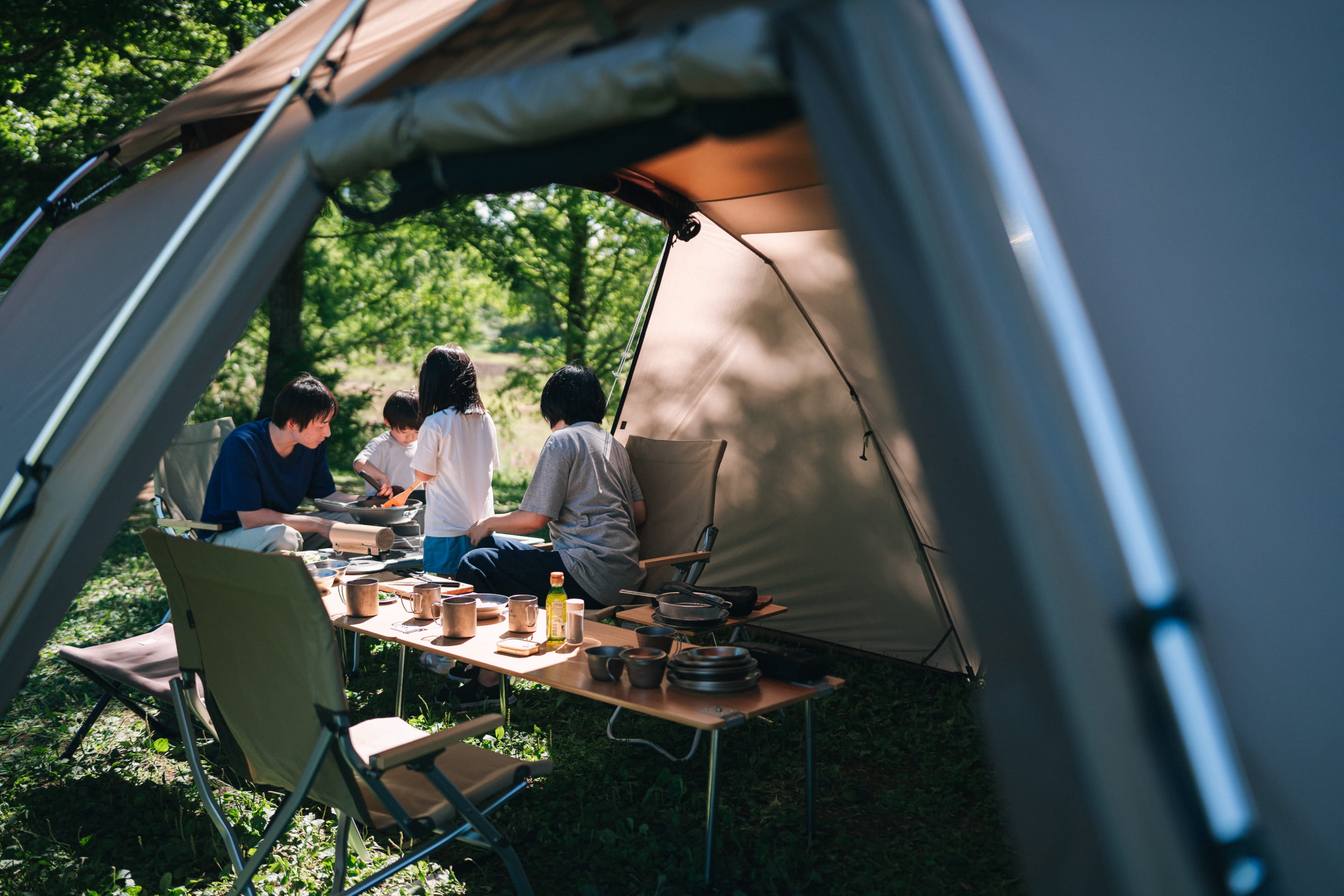 キャンプ初心者にも最適な「ランドネストシェルター」は、簡単な設営と快適な居住性を両立させた、家族4人で広々と使える2ルームシェルターです。リビングと寝室が一体となっている2ルームシェルターは設営が一度で済むうえ、寝室である吊り下げ式のインナールームを外せば大型シェルターとしても活用できます。
