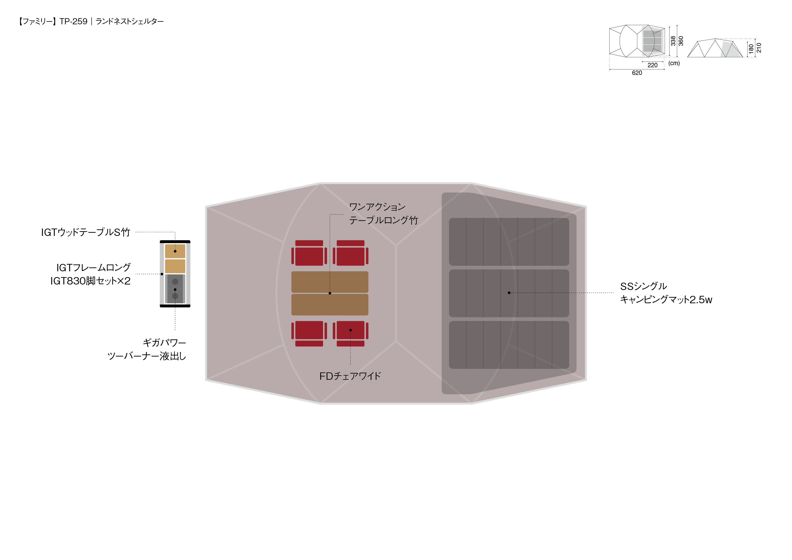 | セット内容 | インナールーム、フライシート、リッジポール(×1)、Aフレーム(×2)、Cフレーム(×2)、ジェラルミンペグ(21cm×18)、自在付ロープ(3.5m×4、2.5m×8)、キャリーバッグ、フレームケース、ペグケース |