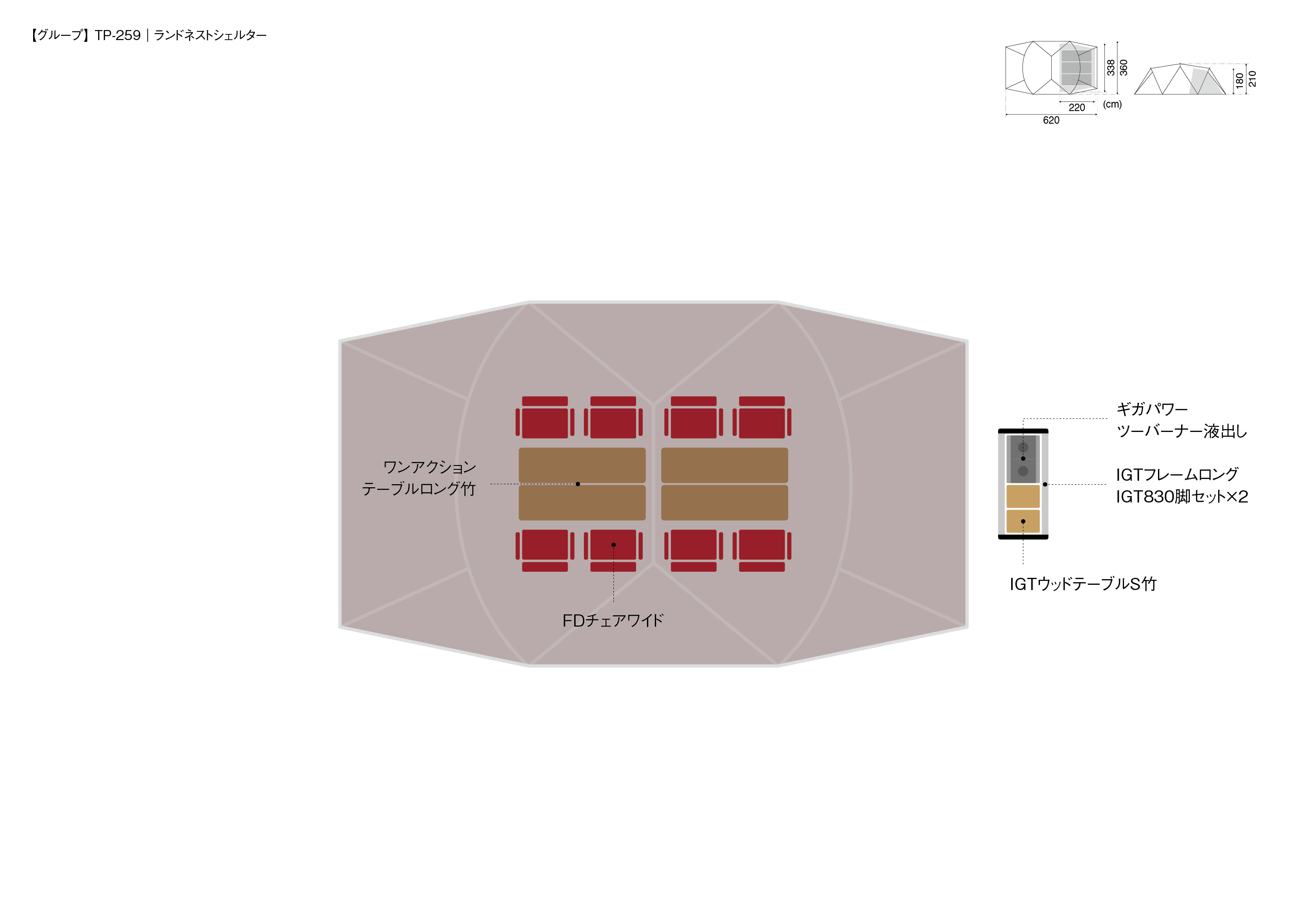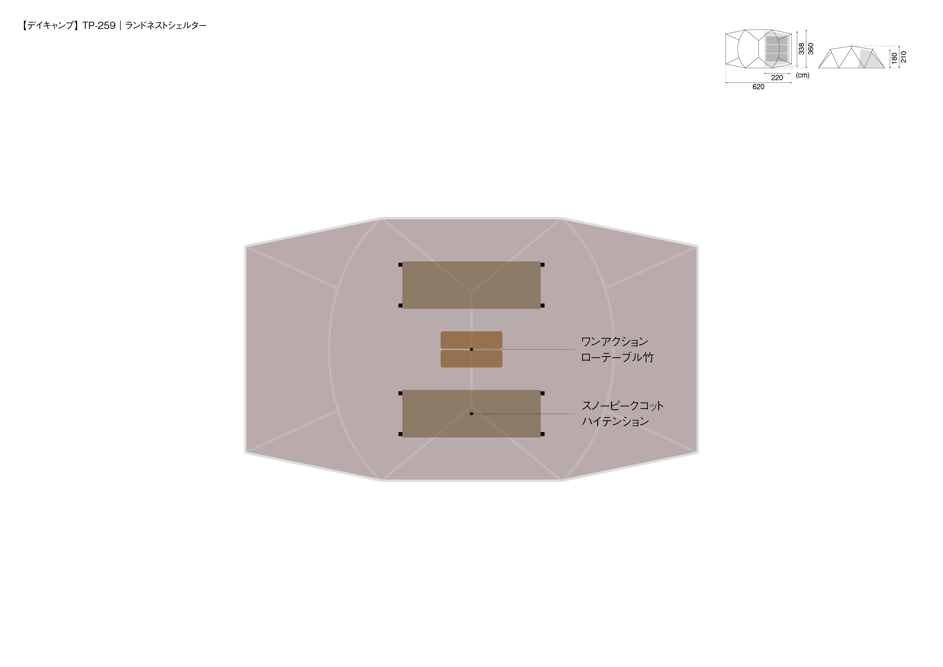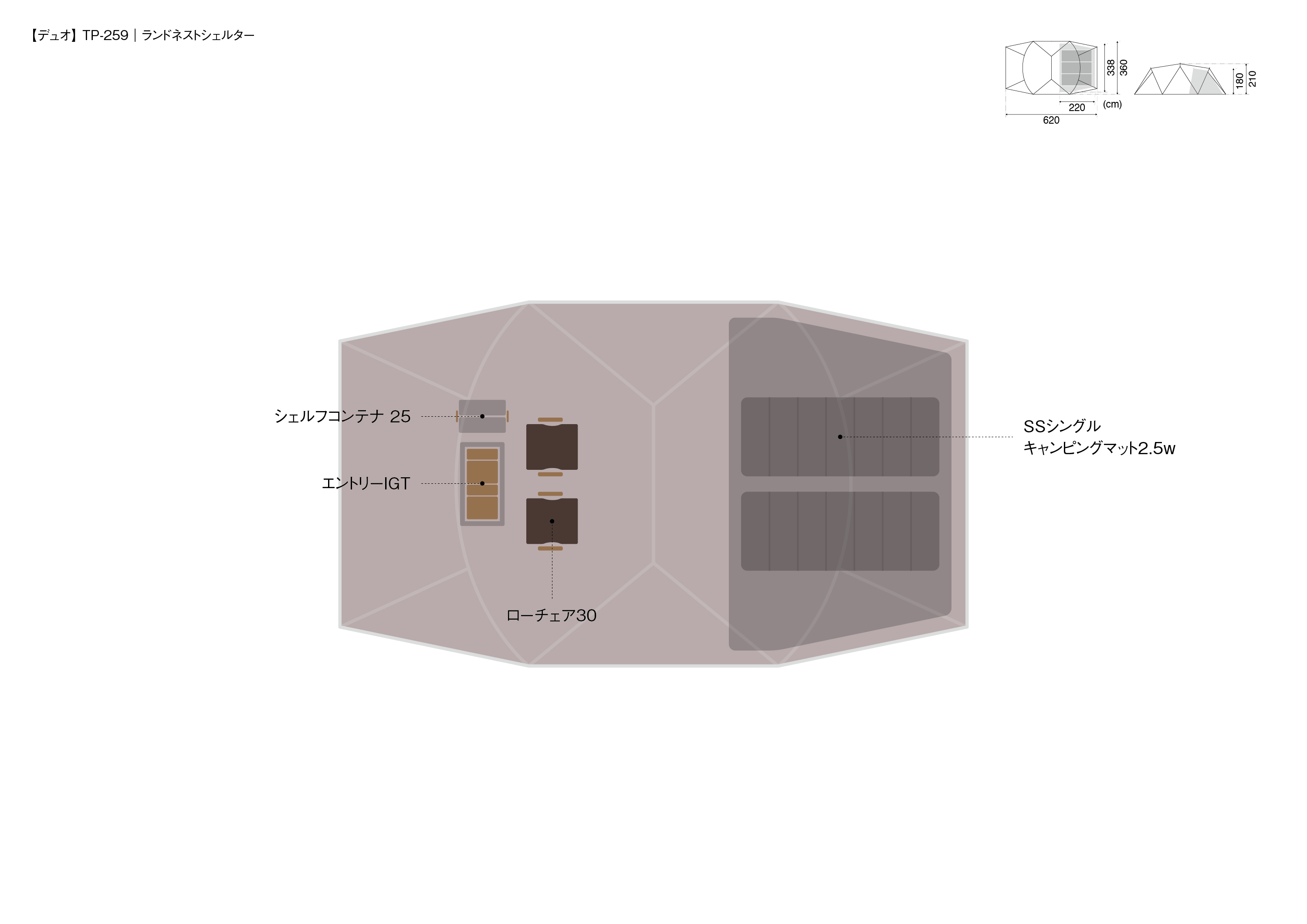 | 材質 | 本体(ルーフ部)/75Dポリエステルタフタ・遮光ピグメントPUコーティング耐水圧1,800mmミニマム・撥水加工・UVカット加工、本体(ウォール部)/75Dポリエステルタフタ・PUコーティング耐水圧1,800mmミニマム・撥水加工・UVカット加工、本体(スカート部)/210Dポリエステルオックス・PUコーティング耐水圧450mmミニマム・撥水加工 、インナーウォール/68Dポリエステルタフタ、ボトム/210Dポリエステルオックス・PUコーティング耐水圧1,800mmミニマム、フレーム/A6061(φ17.5mm、φ16mm) |