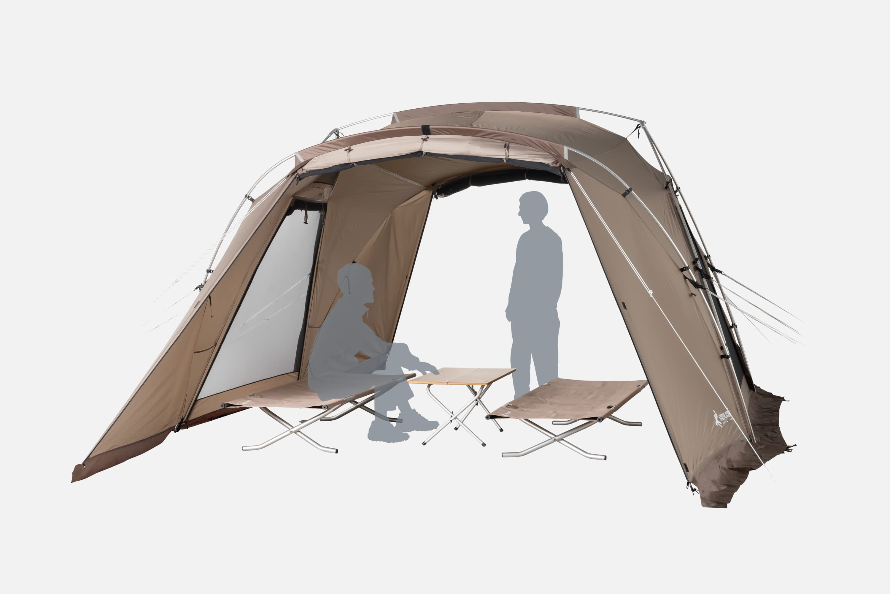 別売の「アップライトポールセット[TP-080]」を使用することで、フロントパネルは跳ね上げが可能。タープ不要で快適な日除けとしてご利用いただけます。