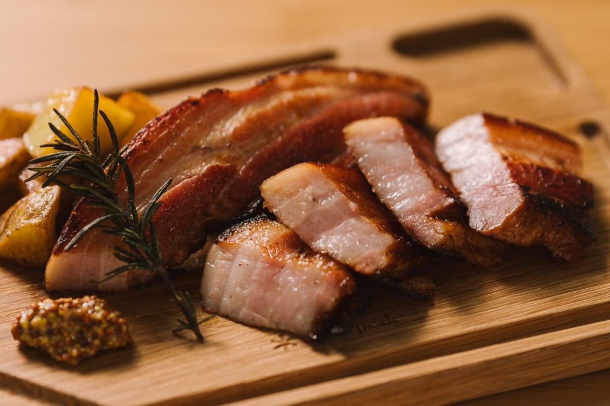 厳選された魚沼産の豚肉を雪室で貯蔵し熟成させた『魚沼そだち 雪ひかりポーク』のバラ肉を、八海山から湧き出る『雷電様の清水』を使った塩水に漬け込み、雪の温度と湿度でさらに熟成し、ローズマリーで香りをつけたベーコンです。