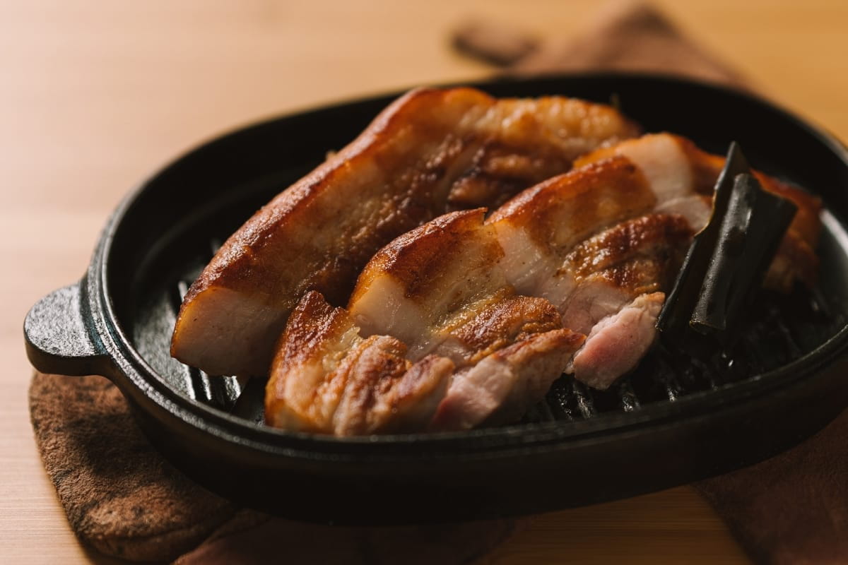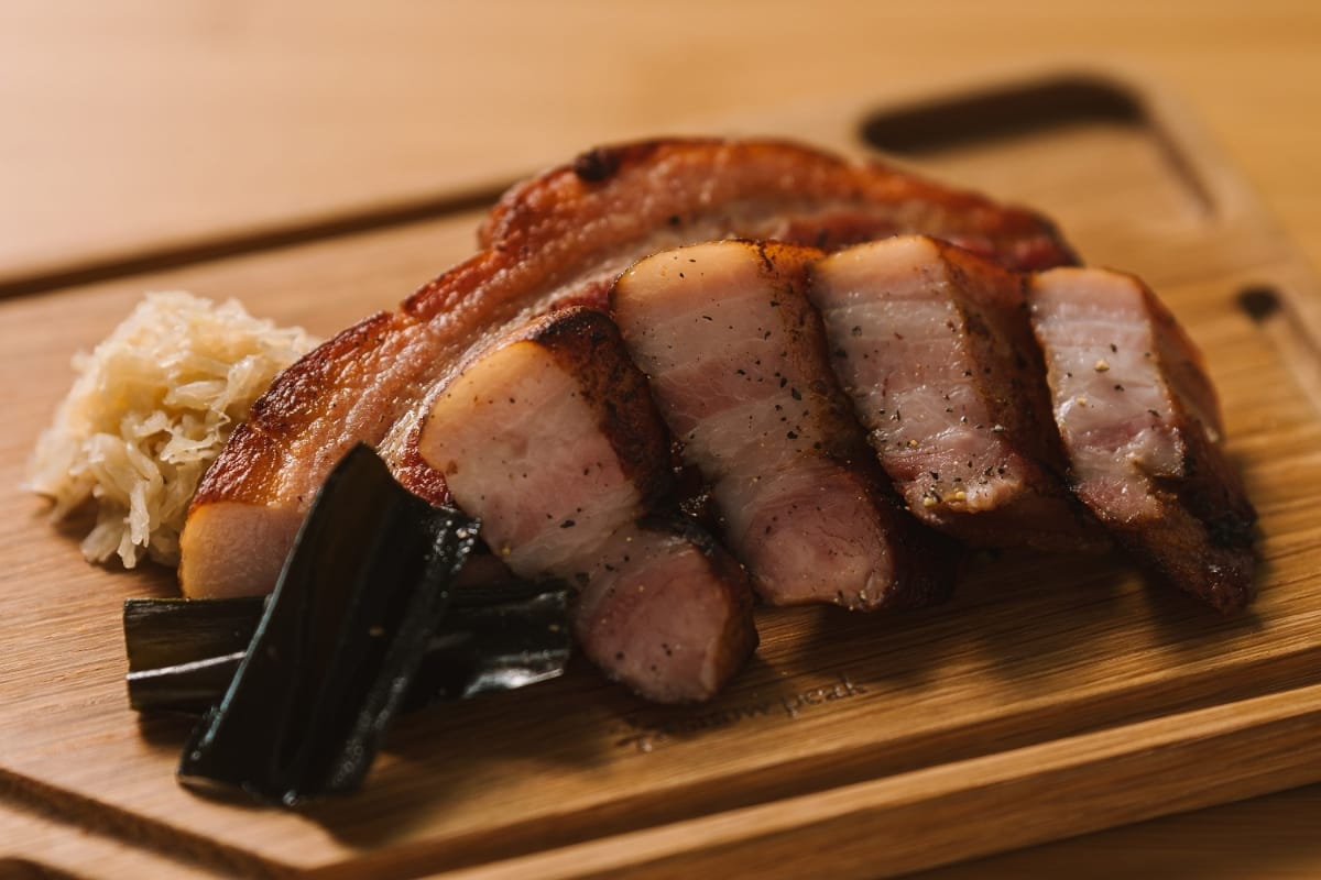 厳選された魚沼産の豚肉を雪室で貯蔵し熟成させた『魚沼そだち 雪ひかりポーク』のバラ肉を、八海山から湧き出る『雷電様の清水』を使った塩水に漬け込み、雪の温度と湿度でさらに熟成。昆布の旨味を効かせた、燻製前の生の塩漬け肉です。