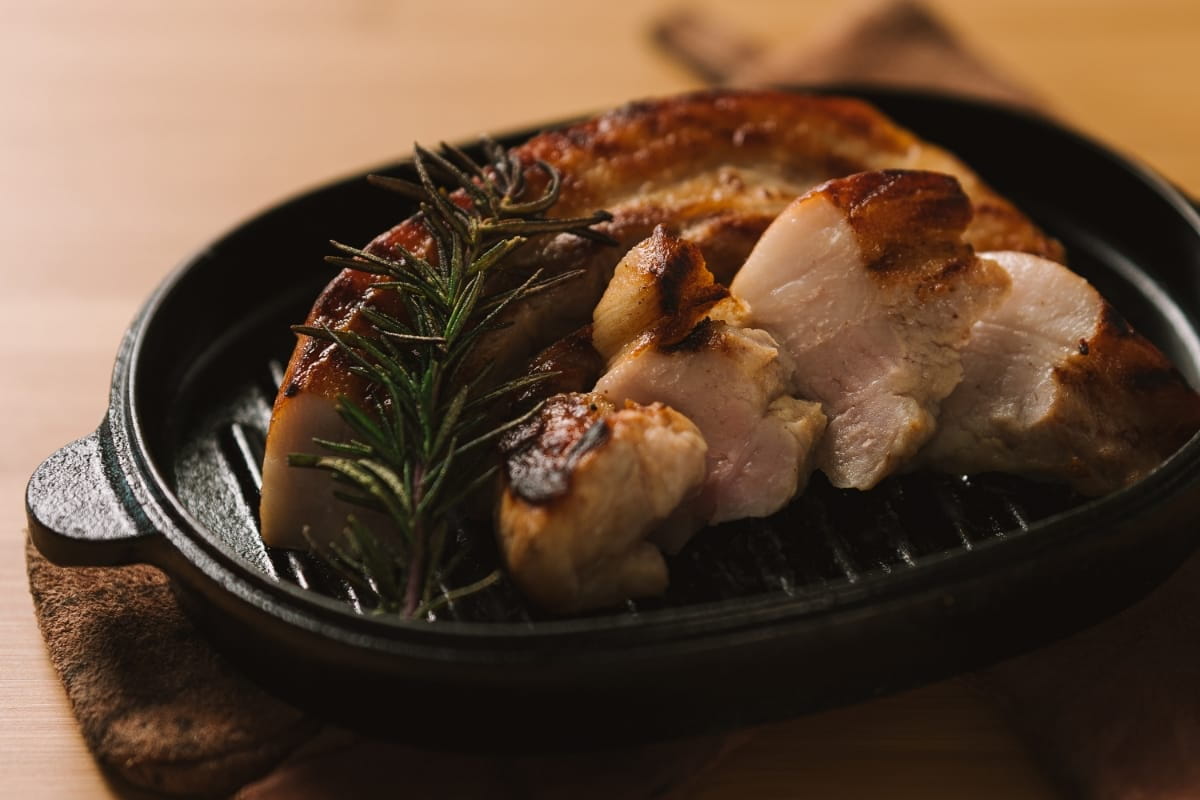 厳選された魚沼産の豚肉を雪室で貯蔵し熟成させた『魚沼そだち 雪ひかりポーク』のバラ肉を、八海山から湧き出る『雷電様の清水』を使った塩水に漬け込み、雪の温度と湿度でさらに熟成。ローズマリーの香りを付けた、燻製前の生の塩漬け肉です。
