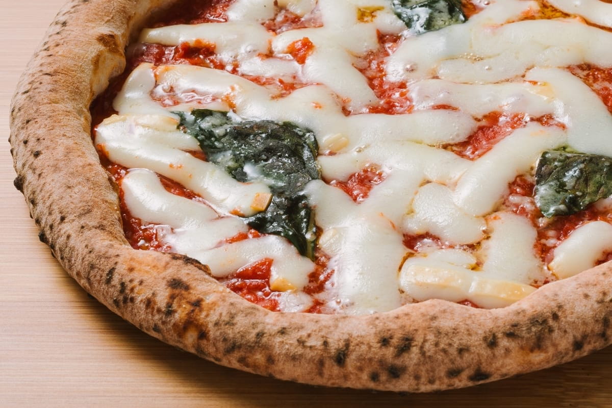 一枚一枚手伸ばしした生地に、イタリア産燻製モッツァレッラチーズ、トマトソース、グラナパダーノ、EXヴァージンオリーブオイル、国産バジルを使用。本格ナポリタイプのマルゲリータです