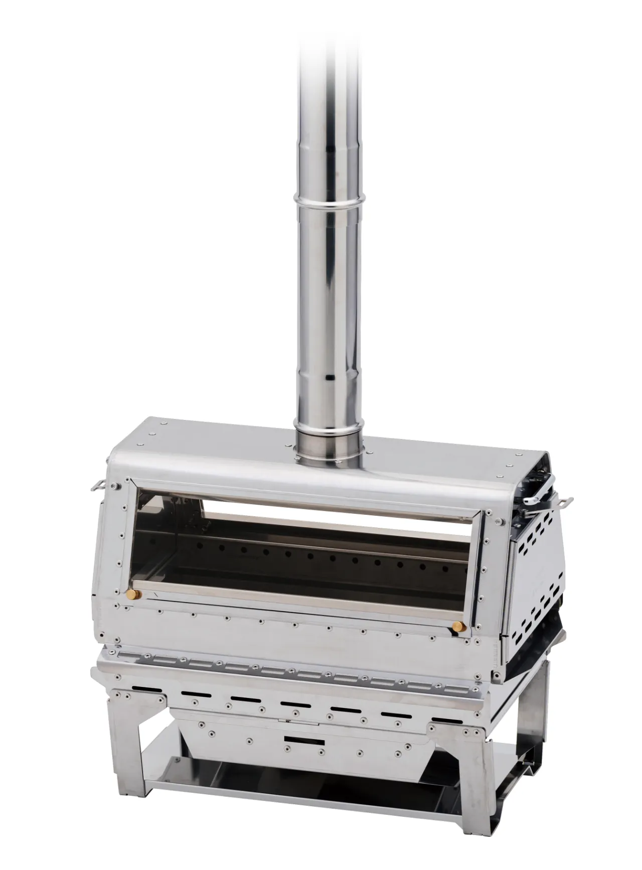 「MKストーブ」は、「メラク Pro.」での幕内使用はもちろん、幕外での単体使用や通年の使用を想定して開発した新しい薪ストーブです。寒い時期の暖房としての用途だけではなく、暖かい季節であっても煙の影響を受けない焚火のような雰囲気を楽しめる設計が特長です。本体の長辺に設けられた2面の大きな耐熱ガラスからは美しく揺らめく炎を眺めることができ、側面の両側に薪をくべるための扉を備え、どちら側からも薪を入れられる便利な仕様です。さらに、クッカーガードを装着することで、幕内での煮込み料理や湯沸かしが可能になりました。IGTフレームにも対応しており、組み込むことでストーブを囲み炎を眺めながらの調理を楽しむことができます。幕外での使用であれば、煙突を付属のロープで固定することにより、IGT脚のすべての長さに対応し、グラウンドスタイルからスタンディングスタイルまで幅広いレイアウトで使用可能です。真冬には暖かく快適な環境を提供し、暖かい季節にもさまざまな使い方で楽しめる。そんなオールシーズン対応の薪ストーブは、スノーピークが焚火を囲む豊かな時間を大切にし続けてきたからこそ生まれたと言えます。シーンを選ばず美しい炎を眺められる、そのための安全設計を備えたMKストーブで“焚火体験”を存分にお楽しみください。