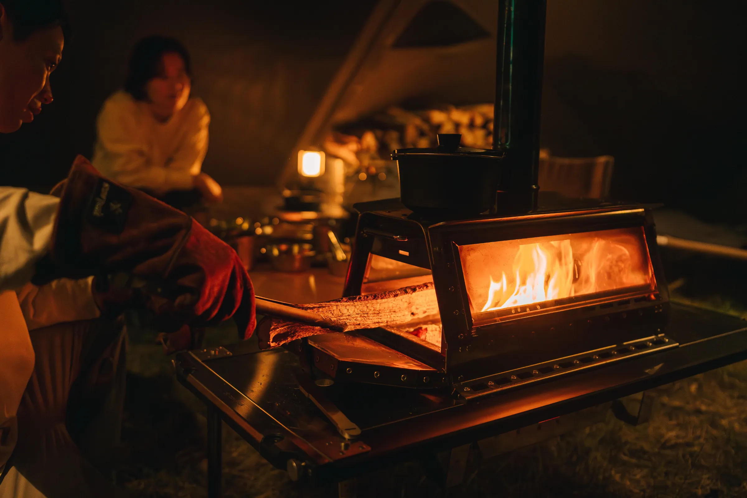 4人グループでも窮屈さを感じない、広々としたサイジング。ストーブの前にテーブルを配置することで、食事をとりながら暖をとったり炎を眺めることができます。