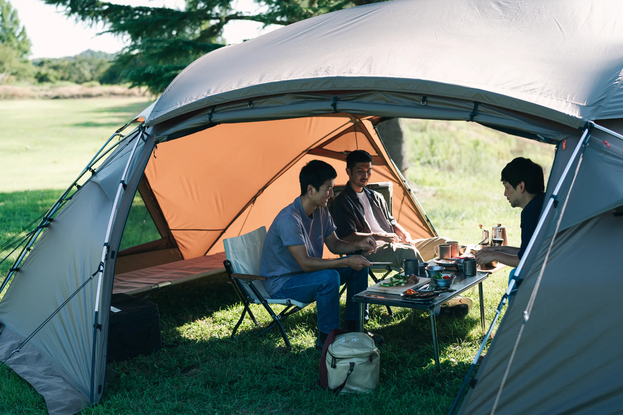 大型シェルターとして春から秋まで活躍する「メラク Pro.」は、グループで使用できる十分な広さがあり、壁面を立ち上げた形状にデザインされています。そのため、シェルター内の隅まで背の高いものを配置できるなど、縦にも横にも有効面積が広いのが特長です。また、本体上部を覆い、雨や日光の影響を軽減するシールドルーフを標準装備。メッシュ窓として使える2つの大きな出入り口と2つの三角窓に加え、4つのベンチレーションを備え、通気性に優れた快適なコミュニティスペースを提供します。