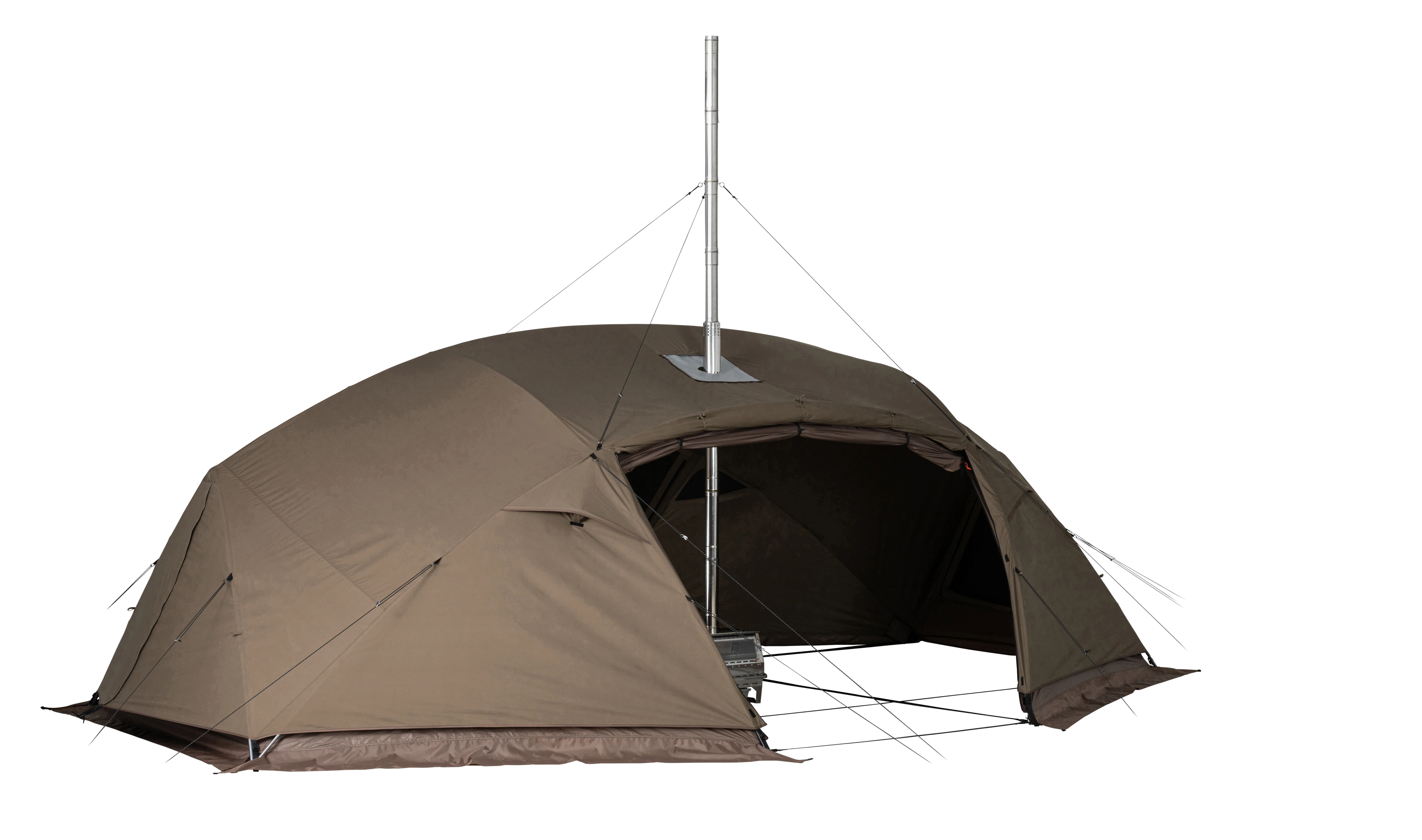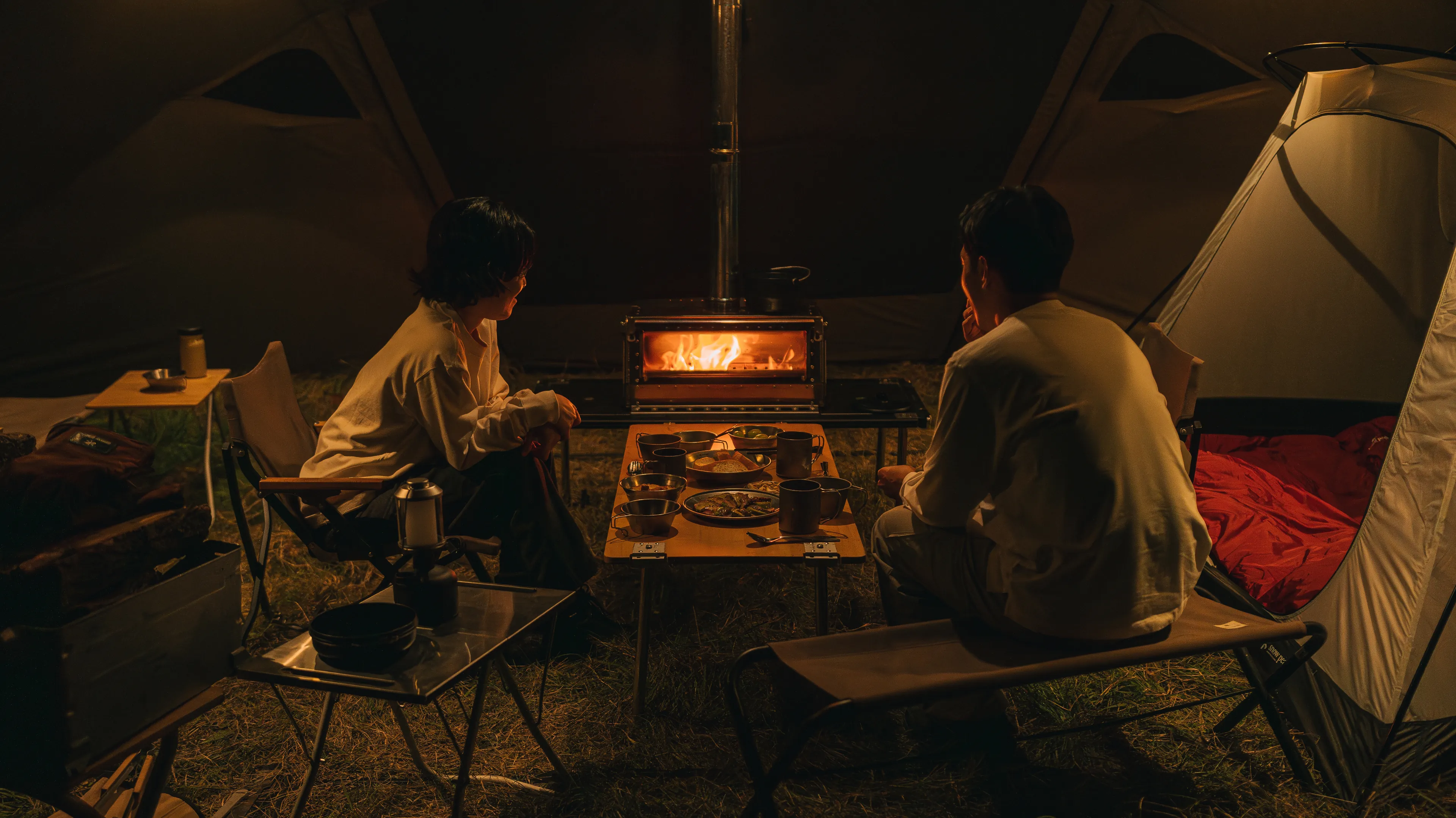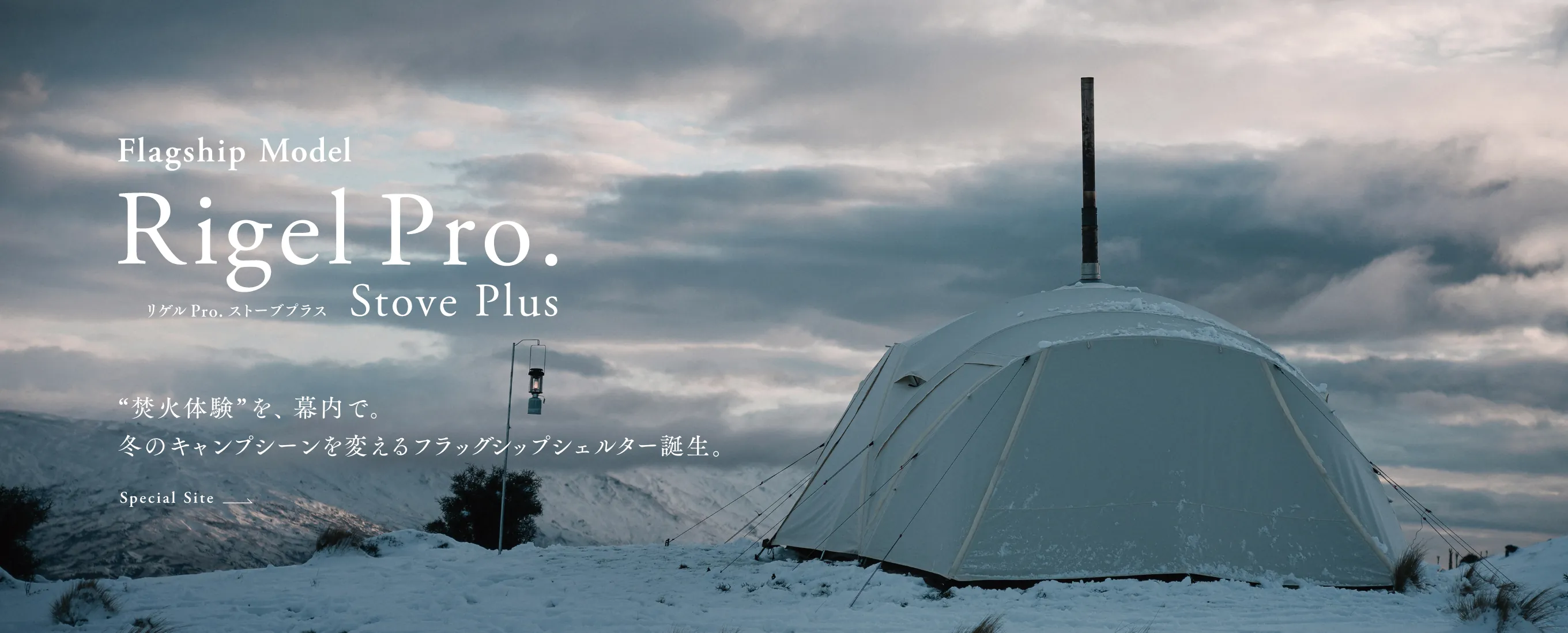 焚火は、キャンプに不可欠なコミュニケーションツール。「メラク Pro. ストーブプラス」は、そんな“焚火体験”を真冬の幕内でも安心安全に楽しめる、薪ストーブ付属の完全二重構造シェルターです。フラッグシップモデル「リゲル Pro. ストーブプラス」の思想と基本設計の一部を受け継ぎながらも、必要な機能を厳選し、コストパフォーマンスを向上させて再構築しました。大幅に変更した点は薪ストーブの位置。シェルターの中央ではなく出入り口側に配置し、焚火を囲むというよりはその前にコミュニティスペースを設けるイメージで設計。複数人がゆとりをもってくつろげるサイズ感です。シェルター本体はリゲル Pro. ストーブプラスと同様に完全二重構造を採用しており、幕と幕の間に空気の層が生まれることによって外気温の影響を受けにくく、断熱性を高めています。複数のベンチレーションも備えており、万が一煙が発生した場合でもスムーズに外へ排出されるよう設計。サイズ、パネル、パーツ構成を調整し、最小限のフレーム数ながら強度の強いフレームワーク設計を行い、リゲル Pro.から約40%の軽量化を実現しました。「MKストーブ」は、長辺となる2面が大きな耐熱ガラスで、美しい炎の揺らめきを存分に楽しめる本体デザイン。「リゲルストーブ」では幕内の天井で煙突を固定していましたが、幕外に変更しています。オールシーズン対応で、暖かい季節にも焚火感覚で使用できるよう煙の影響を抑えた設計が特長です。メラク Pro. ストーブプラスは、安心安全な“焚火体験”を求めるすべてのキャンパーに手にとっていただきたいモデルに仕上げました。