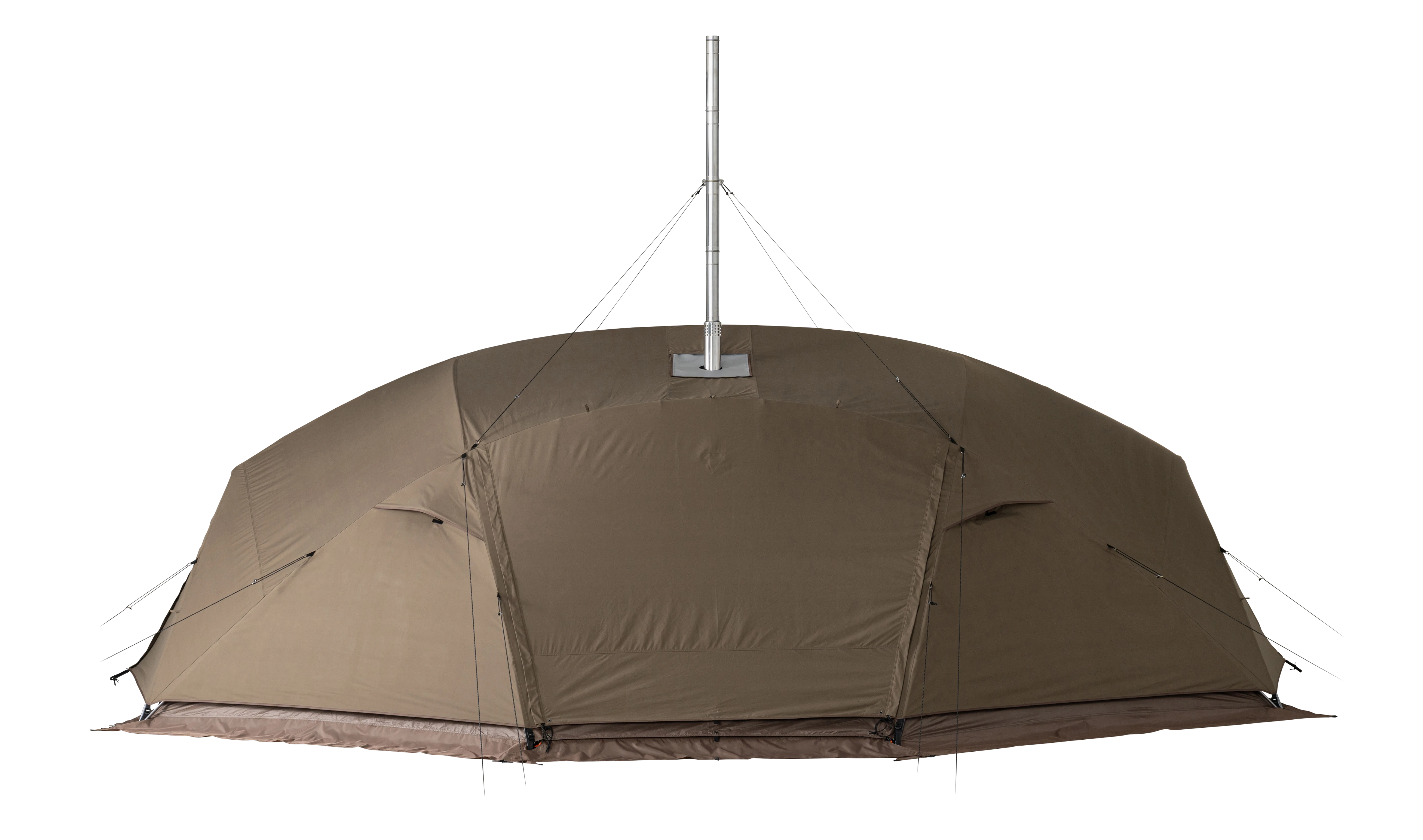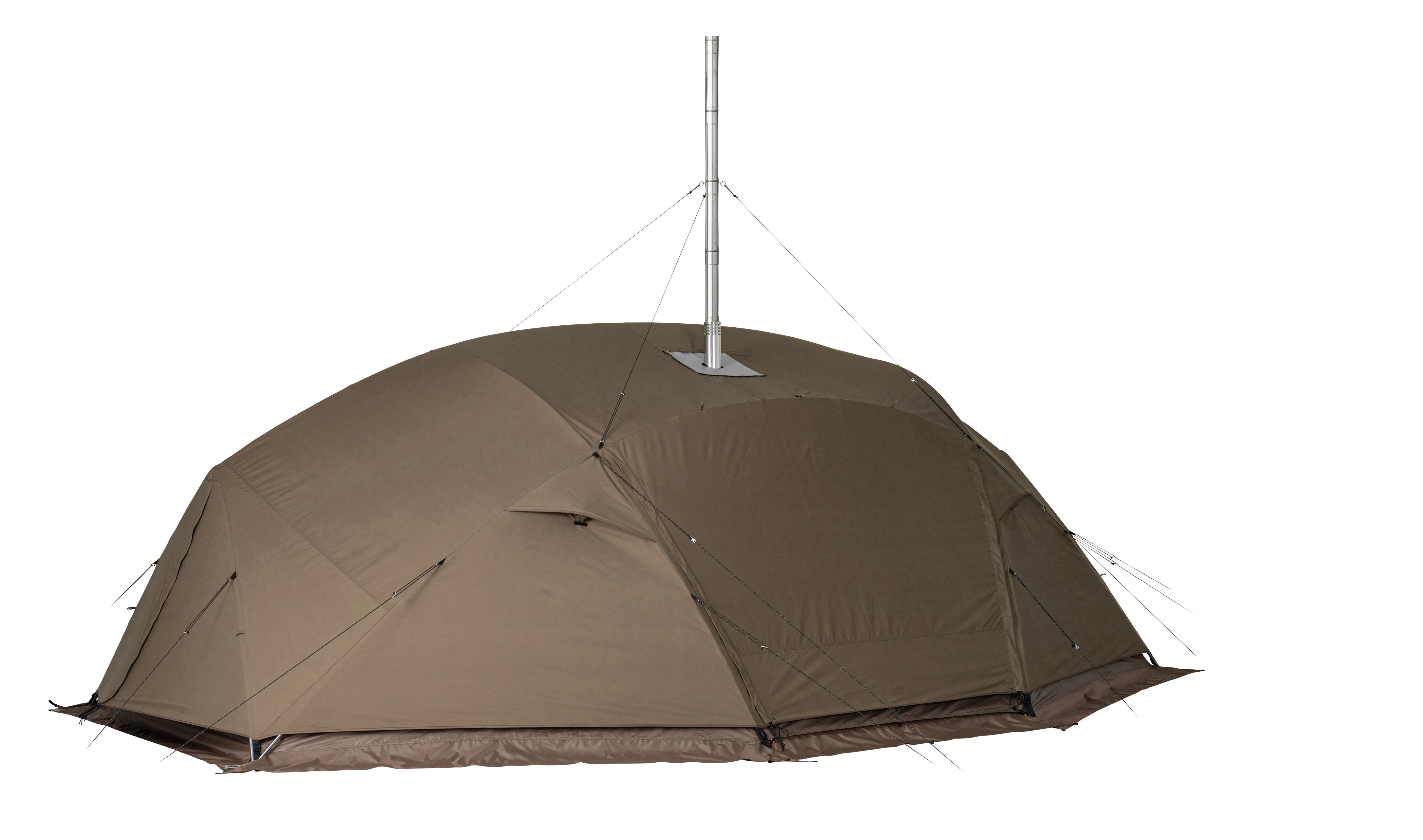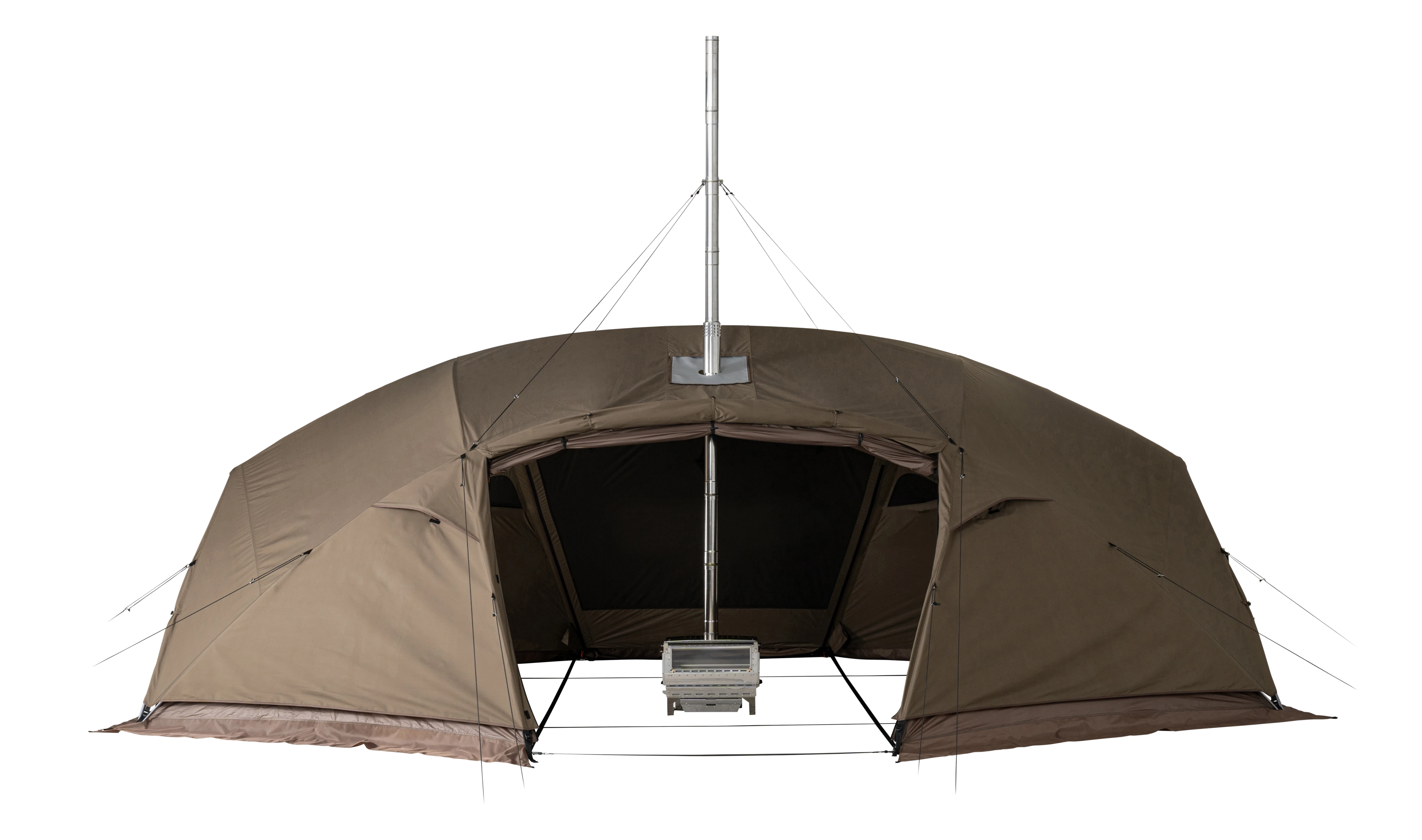 焚火は、キャンプに不可欠なコミュニケーションツール。「メラク Pro. ストーブプラス」は、そんな“焚火体験”を真冬の幕内でも安心安全に楽しめる、薪ストーブ付属の完全二重構造シェルターです。フラッグシップモデル「リゲル Pro. ストーブプラス」の思想と基本設計の一部を受け継ぎながらも、必要な機能を厳選し、コストパフォーマンスを向上させて再構築しました。大幅に変更した点は薪ストーブの位置。シェルターの中央ではなく出入り口側に配置し、焚火を囲むというよりはその前にコミュニティスペースを設けるイメージで設計。複数人がゆとりをもってくつろげるサイズ感です。シェルター本体はリゲル Pro. ストーブプラスと同様に完全二重構造を採用しており、幕と幕の間に空気の層が生まれることによって外気温の影響を受けにくく、断熱性を高めています。複数のベンチレーションも備えており、万が一煙が発生した場合でもスムーズに外へ排出されるよう設計。サイズ、パネル、パーツ構成を調整し、最小限のフレーム数ながら強度の強いフレームワーク設計を行い、リゲル Pro.から約40%の軽量化を実現しました。「MKストーブ」は、長辺となる2面が大きな耐熱ガラスで、美しい炎の揺らめきを存分に楽しめる本体デザイン。「リゲルストーブ」では幕内の天井で煙突を固定していましたが、幕外に変更しています。オールシーズン対応で、暖かい季節にも焚火感覚で使用できるよう煙の影響を抑えた設計が特長です。メラク Pro. ストーブプラスは、安心安全な“焚火体験”を求めるすべてのキャンパーに手にとっていただきたいモデルに仕上げました。