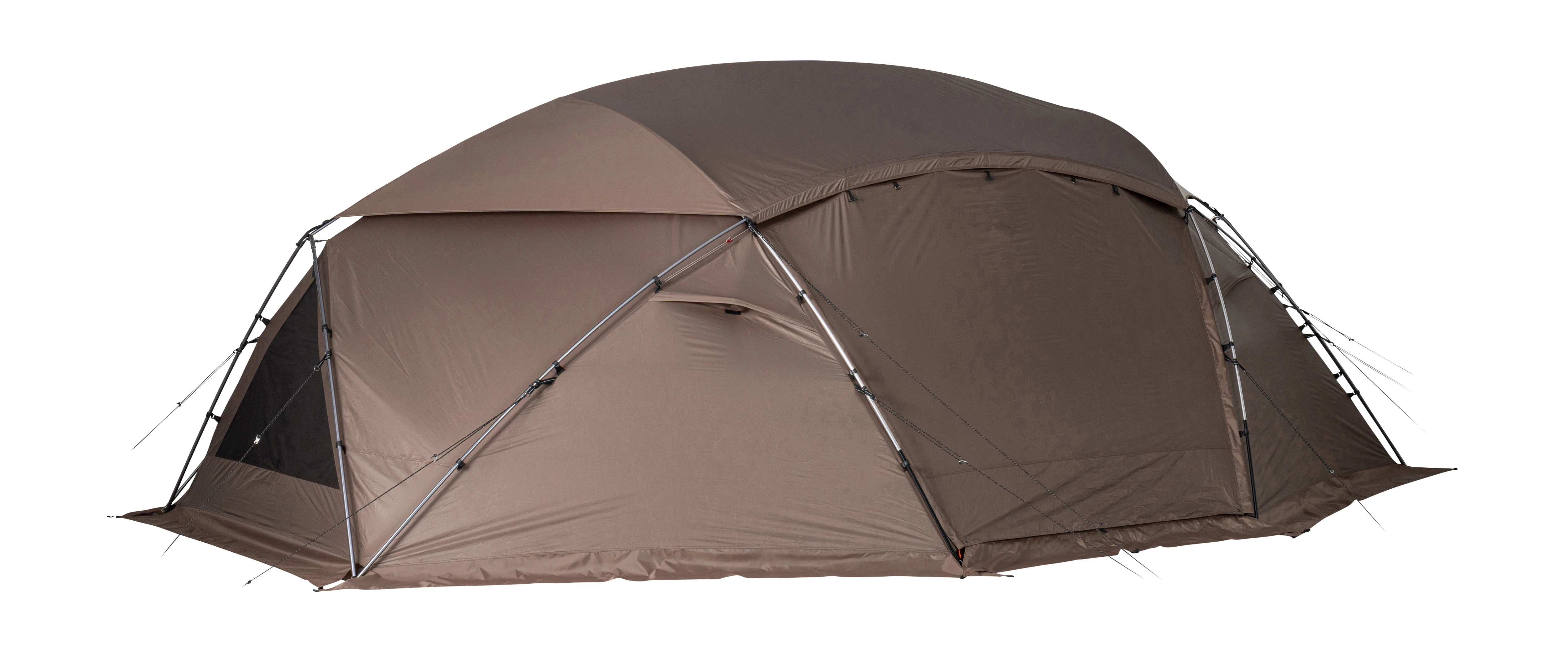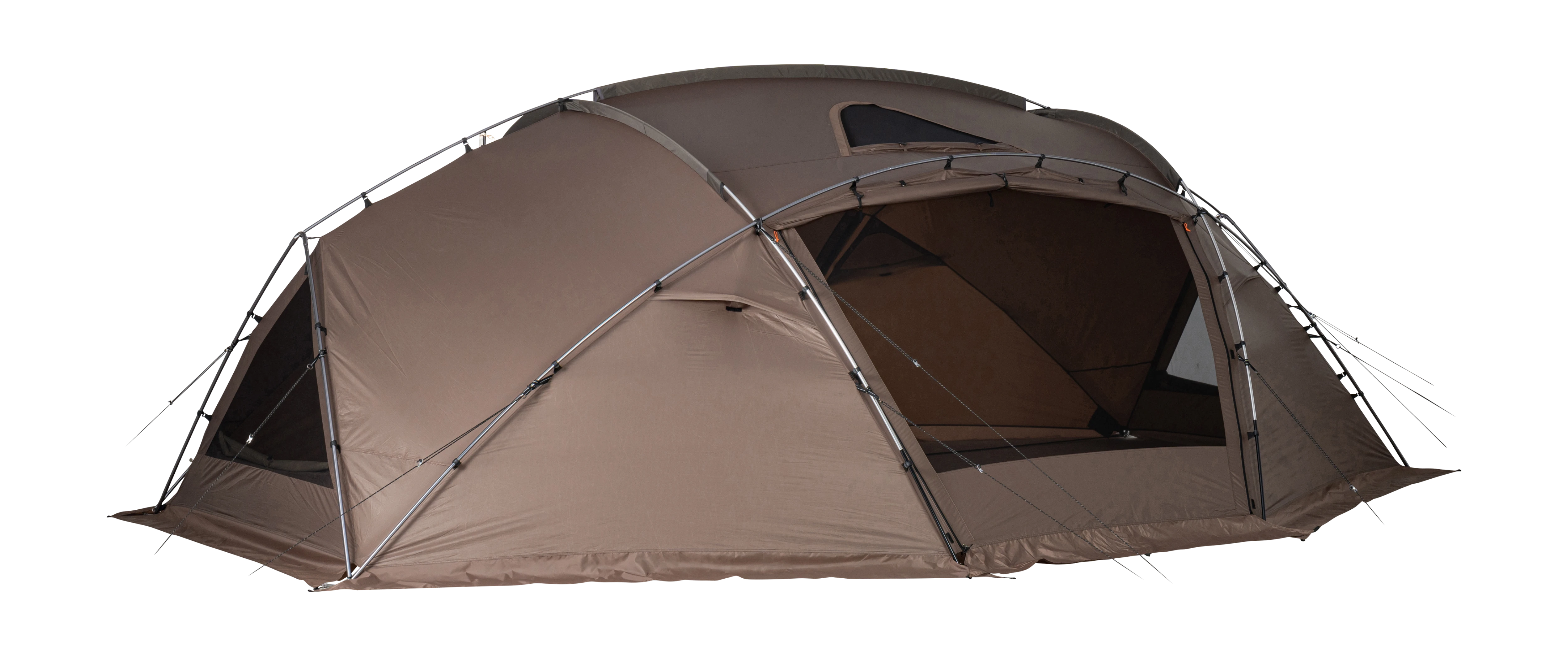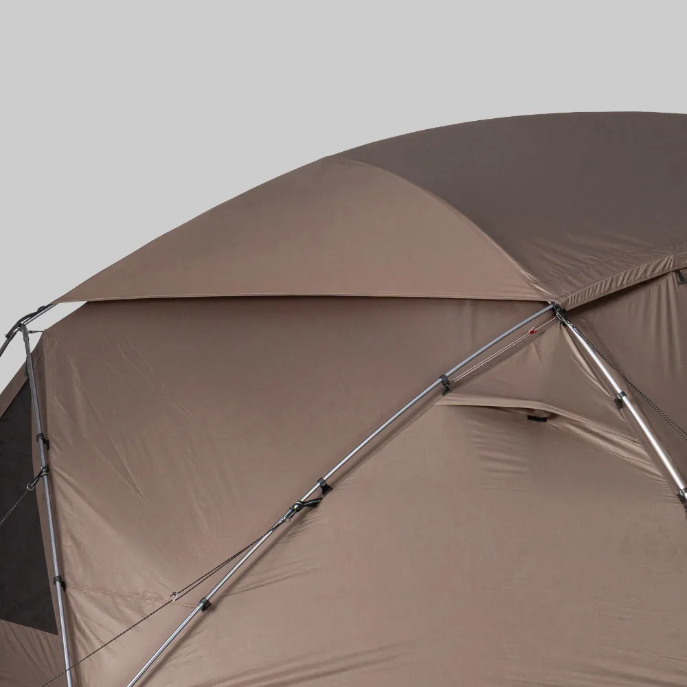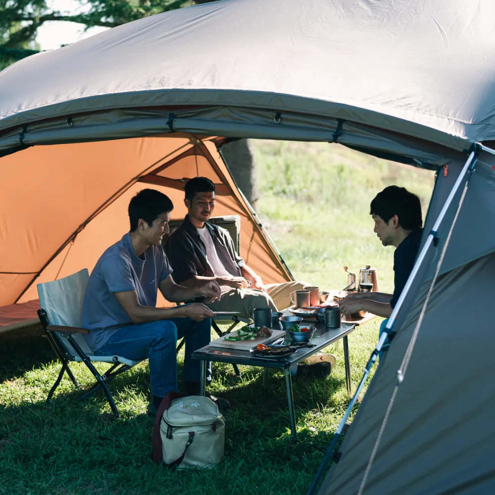 大型シェルターとして春から秋まで活躍する「メラク Pro.」は、グループで使用できる十分な広さがあり、壁面を立ち上げた形状にデザインされています。そのため、シェルター内の隅まで背の高いものを配置できるなど、縦にも横にも有効面積が広いのが特長です。また、本体上部を覆い、雨や日光の影響を軽減するシールドルーフを標準装備。メッシュ窓として使える2つの大きな出入り口と2つの三角窓に加え、4つのベンチレーションを備え、通気性に優れた快適なコミュニティスペースを提供します。