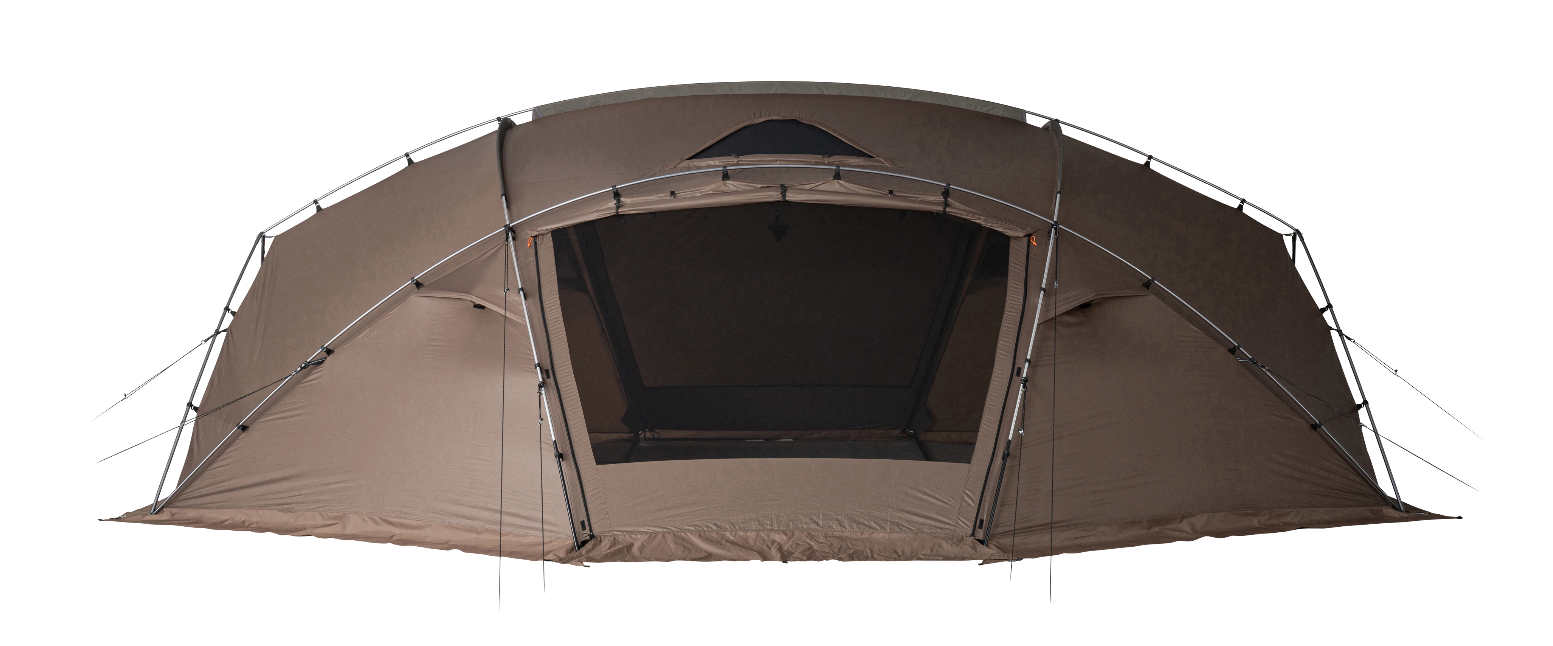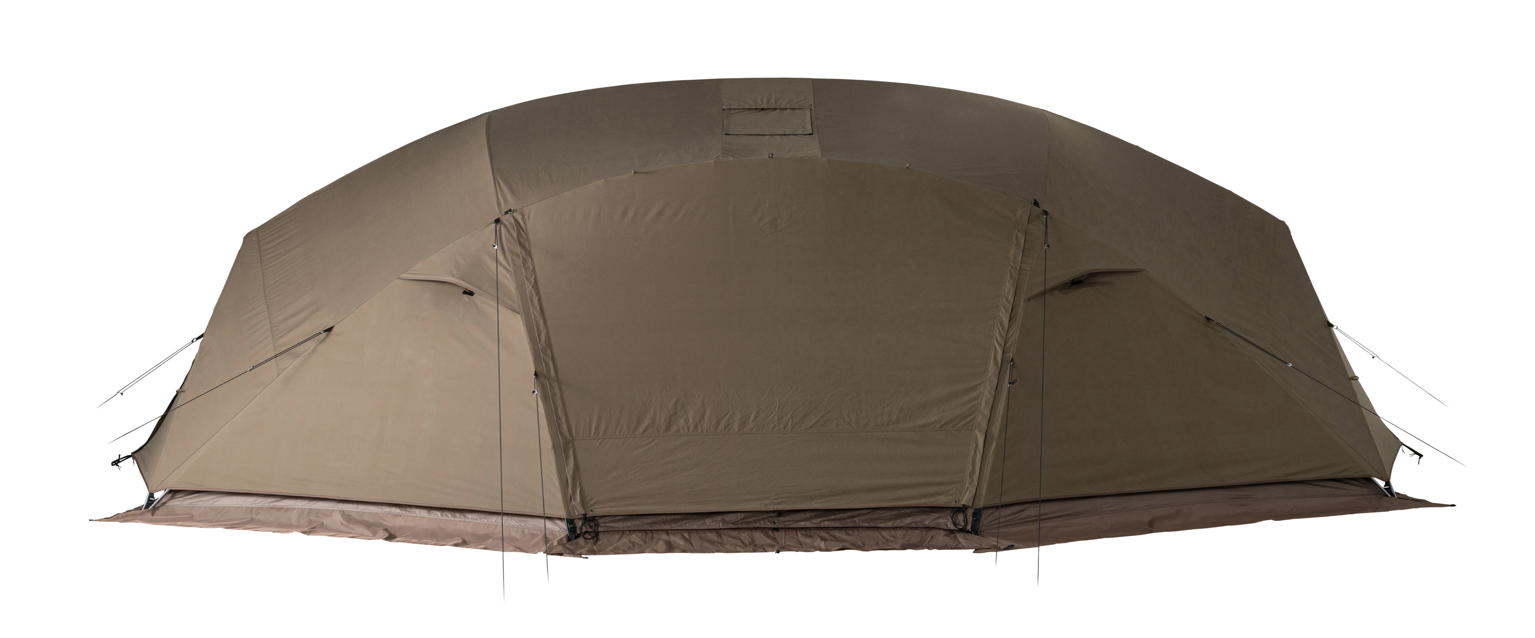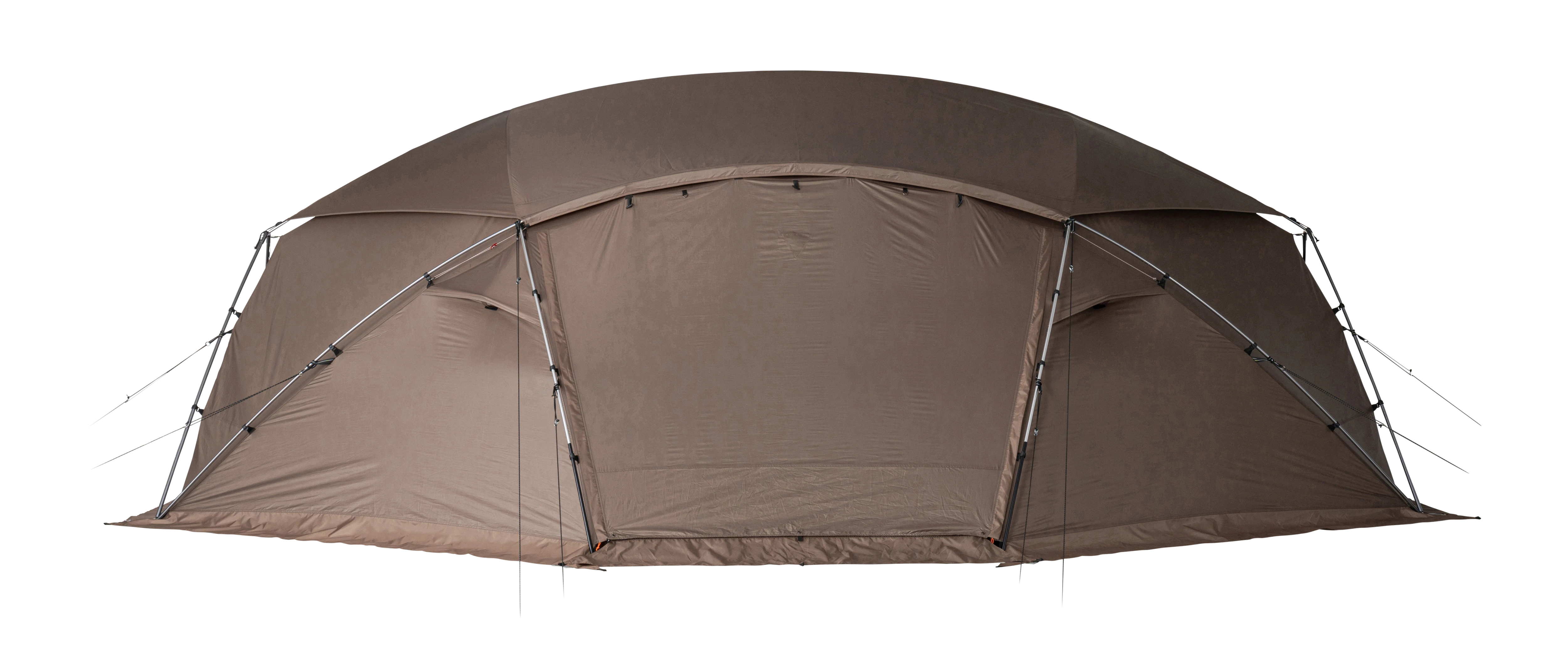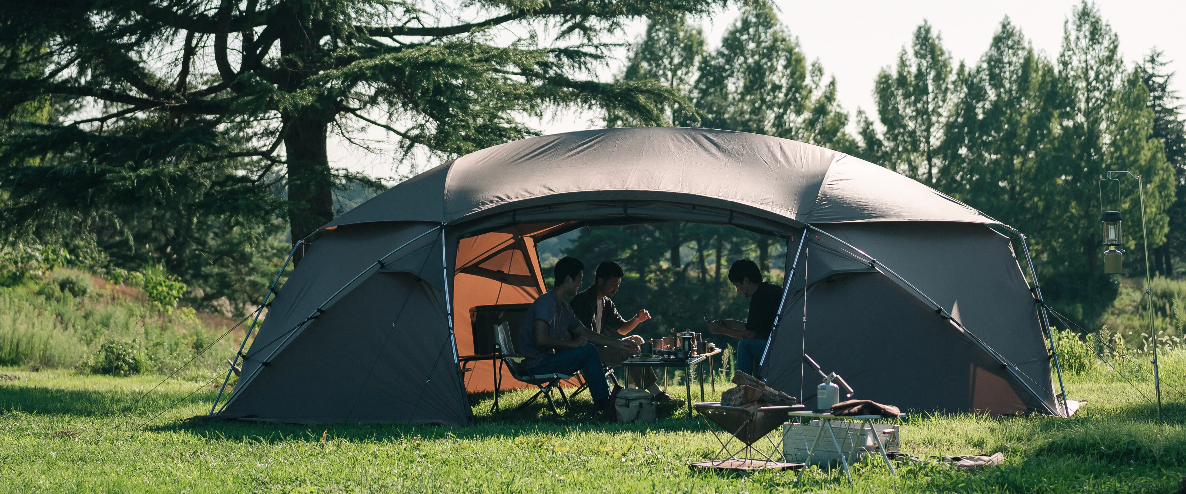 大型シェルターとして春から秋まで活躍する「メラク Pro.」は、グループで使用できる十分な広さがあり、壁面を立ち上げた形状にデザインされています。そのため、シェルター内の隅まで背の高いものを配置できるなど、縦にも横にも有効面積が広いのが特長です。また、本体上部を覆い、雨や日光の影響を軽減するシールドルーフを標準装備。メッシュ窓として使える2つの大きな出入り口と2つの三角窓に加え、4つのベンチレーションを備え、通気性に優れた快適なコミュニティスペースを提供します。