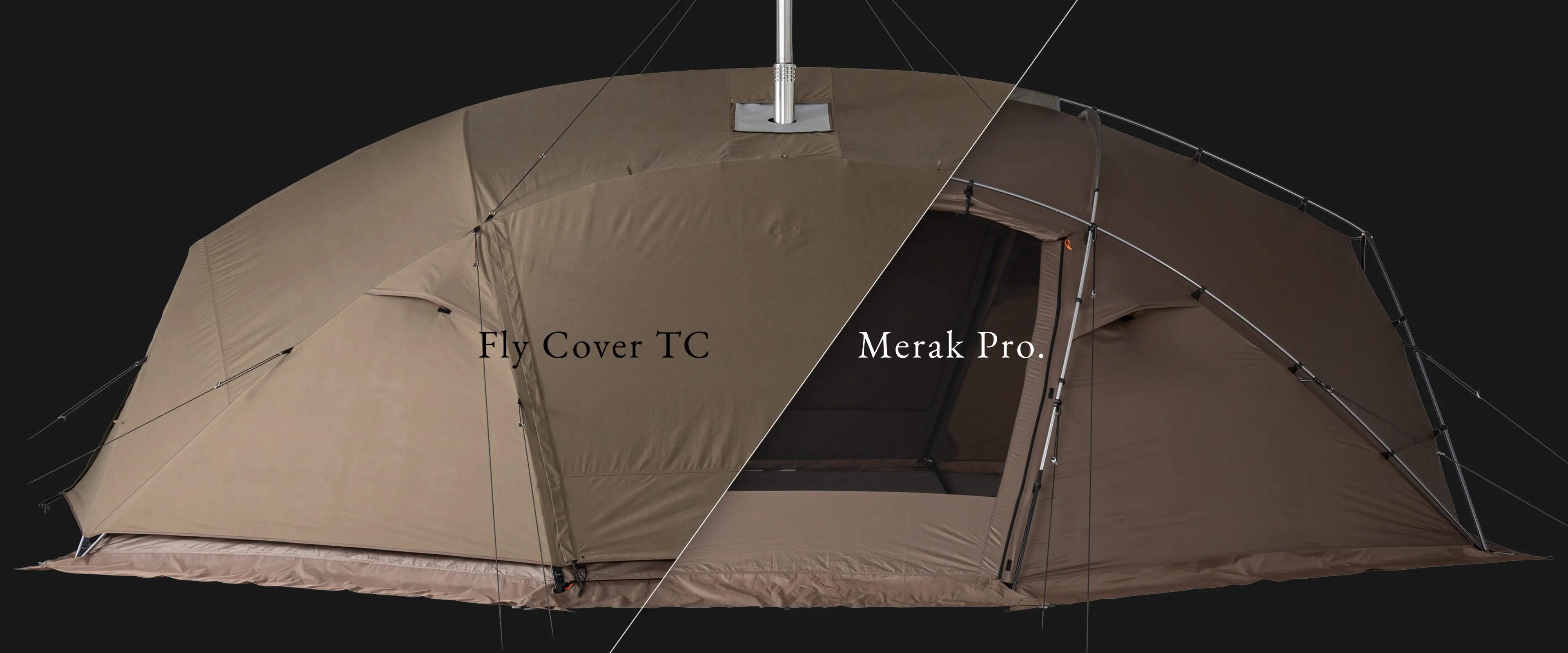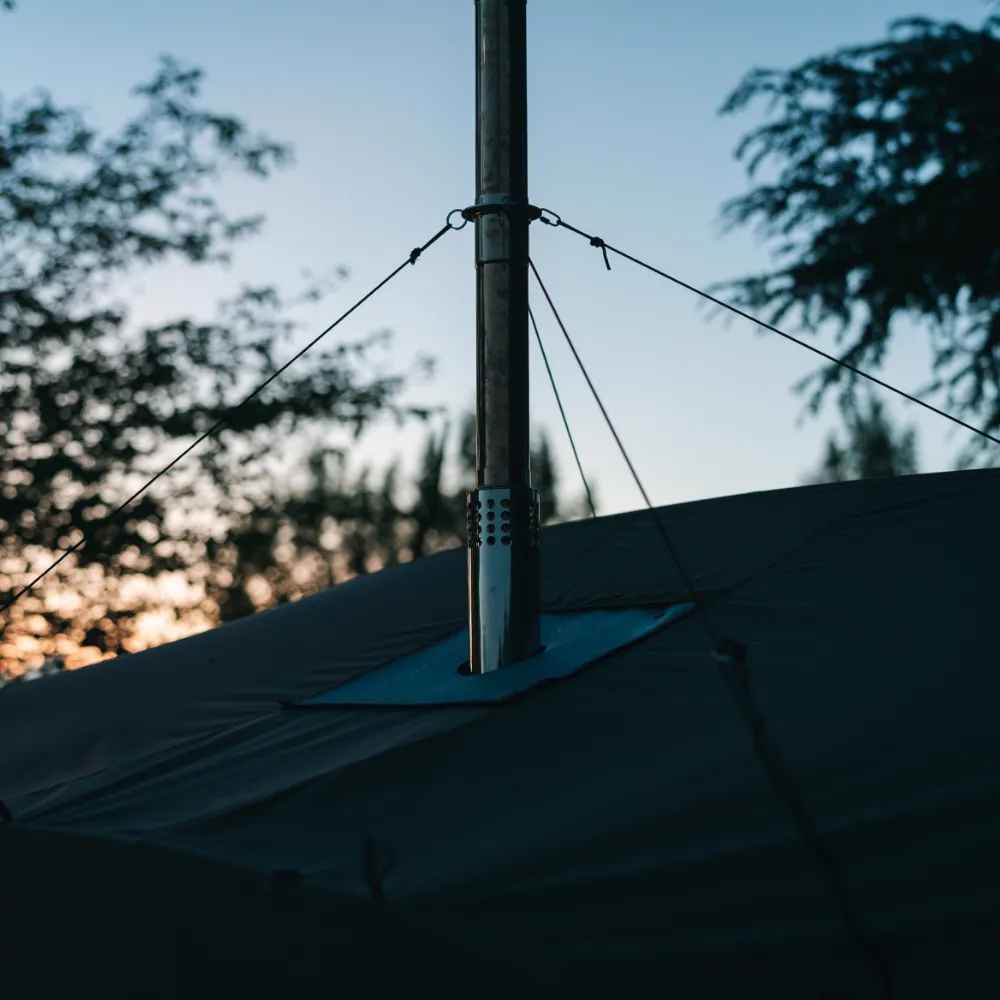 「メラク Pro. ストーブプラス」に付属する、火の粉からシェルター本体を守りつつ断熱性と遮光性を向上させる専用フルフライカバー。煙突穴を塞ぐことで、夏場には遮光カバーとしても活用可能です。このフライカバーの使用で二重幕構造となり、保温性が高まるため、MKストーブはもちろんグローストーブなどの石油ストーブ使用時にも効果を発揮します。シェルター全体を覆う専用設計なので、万が一、火の粉が飛散しても燃え広がりにくく、ダメージを軽減するため安全です。