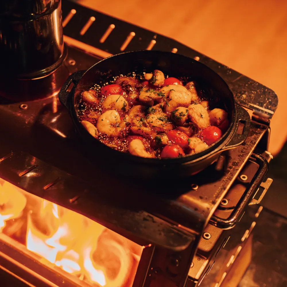 「MKストーブ」は、「メラク Pro.」での幕内使用はもちろん、幕外での単体使用や通年の使用を想定して開発した新しい薪ストーブです。寒い時期の暖房としての用途だけではなく、暖かい季節であっても煙の影響を受けない焚火のような雰囲気を楽しめる設計が特長です。本体の長辺に設けられた2面の大きな耐熱ガラスからは美しく揺らめく炎を眺めることができ、側面の両側に薪をくべるための扉を備え、どちら側からも薪を入れられる便利な仕様です。さらに、クッカーガードを装着することで、幕内での煮込み料理や湯沸かしが可能になりました。IGTフレームにも対応しており、組み込むことでストーブを囲み炎を眺めながらの調理を楽しむことができます。幕外での使用であれば、煙突を付属のロープで固定することにより、IGT脚のすべての長さに対応し、グラウンドスタイルからスタンディングスタイルまで幅広いレイアウトで使用可能です。真冬には暖かく快適な環境を提供し、暖かい季節にもさまざまな使い方で楽しめる。そんなオールシーズン対応の薪ストーブは、スノーピークが焚火を囲む豊かな時間を大切にし続けてきたからこそ生まれたと言えます。シーンを選ばず美しい炎を眺められる、そのための安全設計を備えたMKストーブで“焚火体験”を存分にお楽しみください。