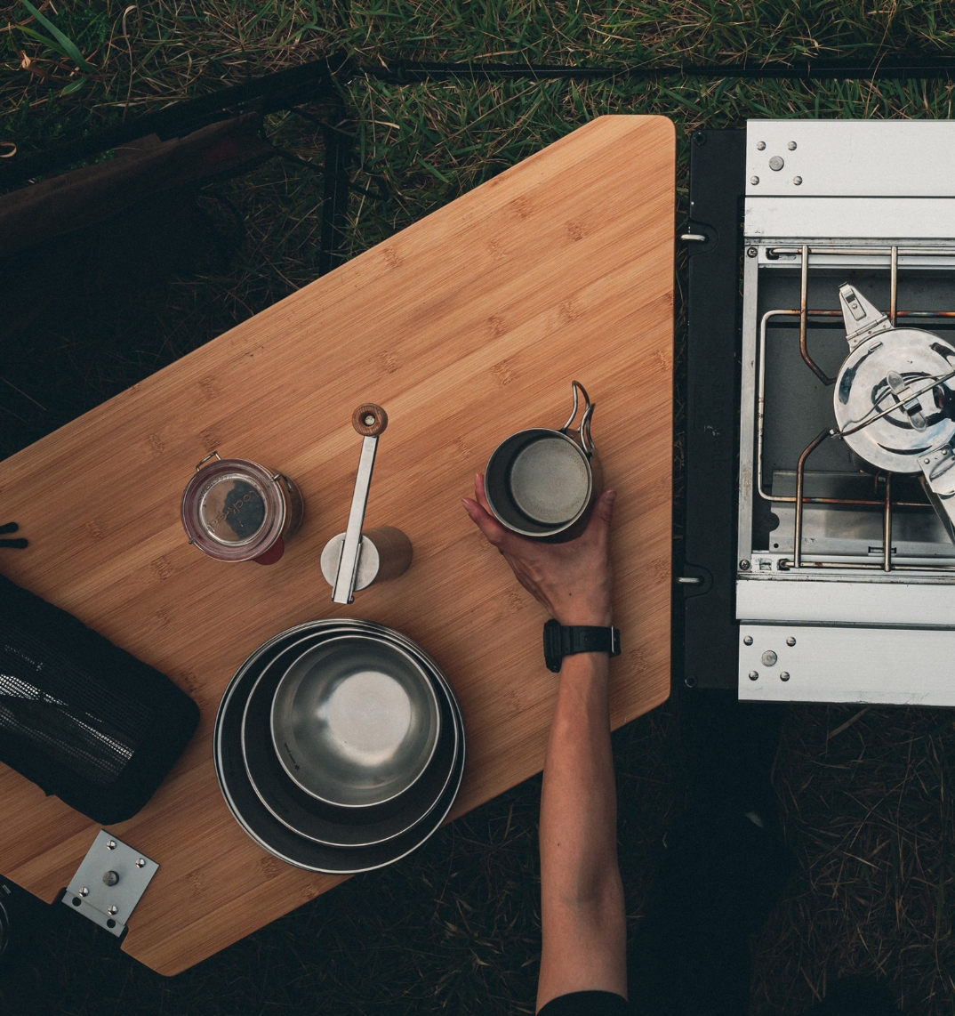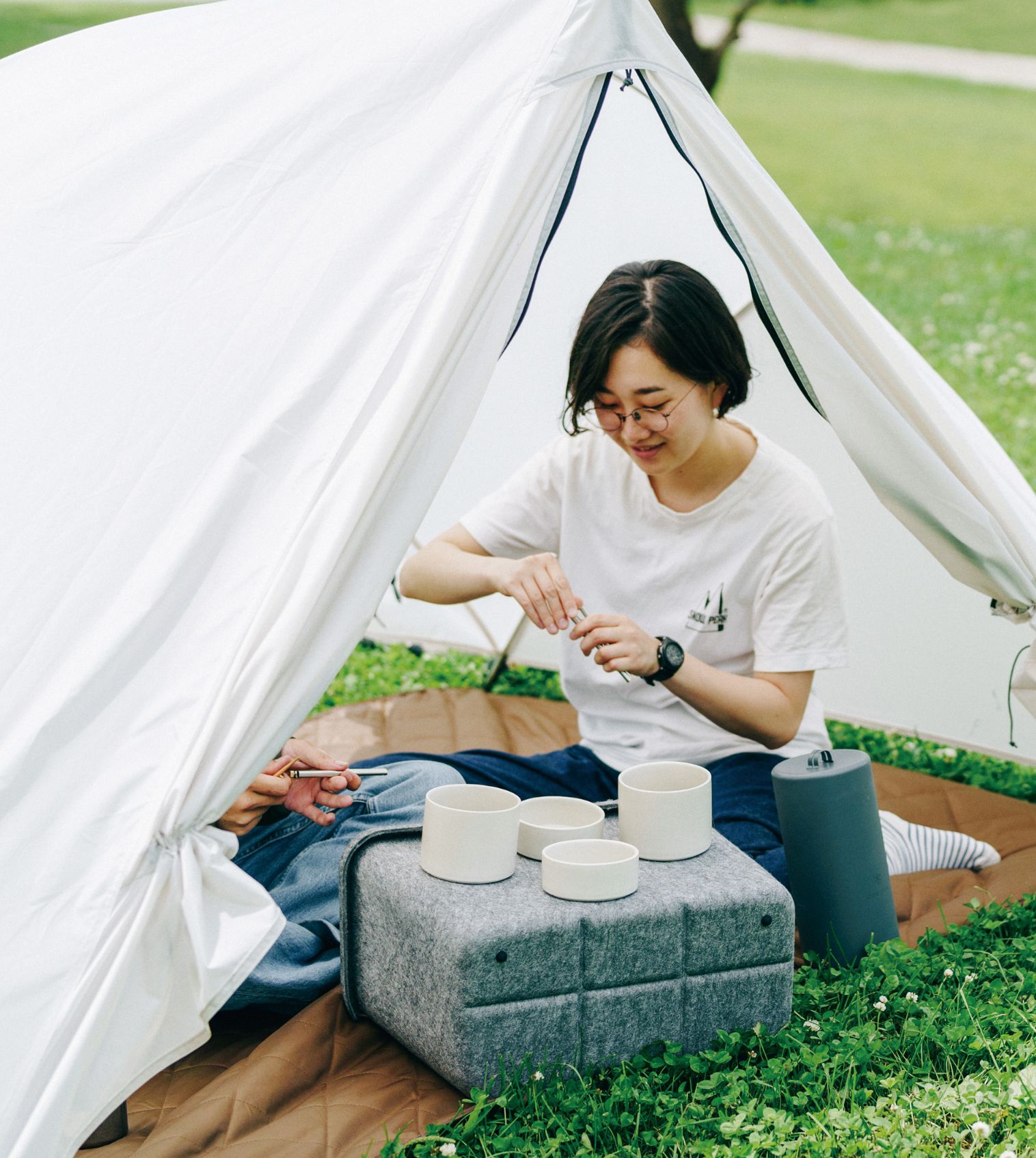 「手軽に外での食事を楽しむ」というコンセプトのもと、タクバコとトバチの開発プロジェクトが始まりました。トバチは、磁器の器に盛った家庭の料理を真空断熱のケースに入れて、そのまま持ち出せるシステムランチウェアで、アウトドアでの食体験を身近なものにしてくれる新しいコンセプトのプロダクトです。別売りのトバチS・Mを組み合わせることで、自由なコーディネートを実現。ソロでのランチからグループでのライトな食事まで対応します。タクバコは外での食事を手軽にできるように、テーブルの機能を持たせたキャリングボックス。持ち運ぶ時には丸みを帯びた形状が体にフィットし、横に倒せばテーブルになります。フェルト素材で、やさしい質感に仕上げました。