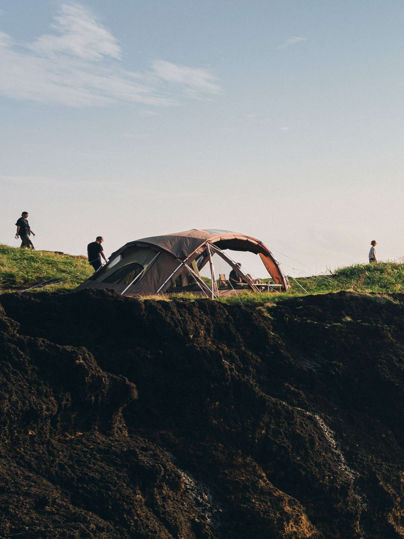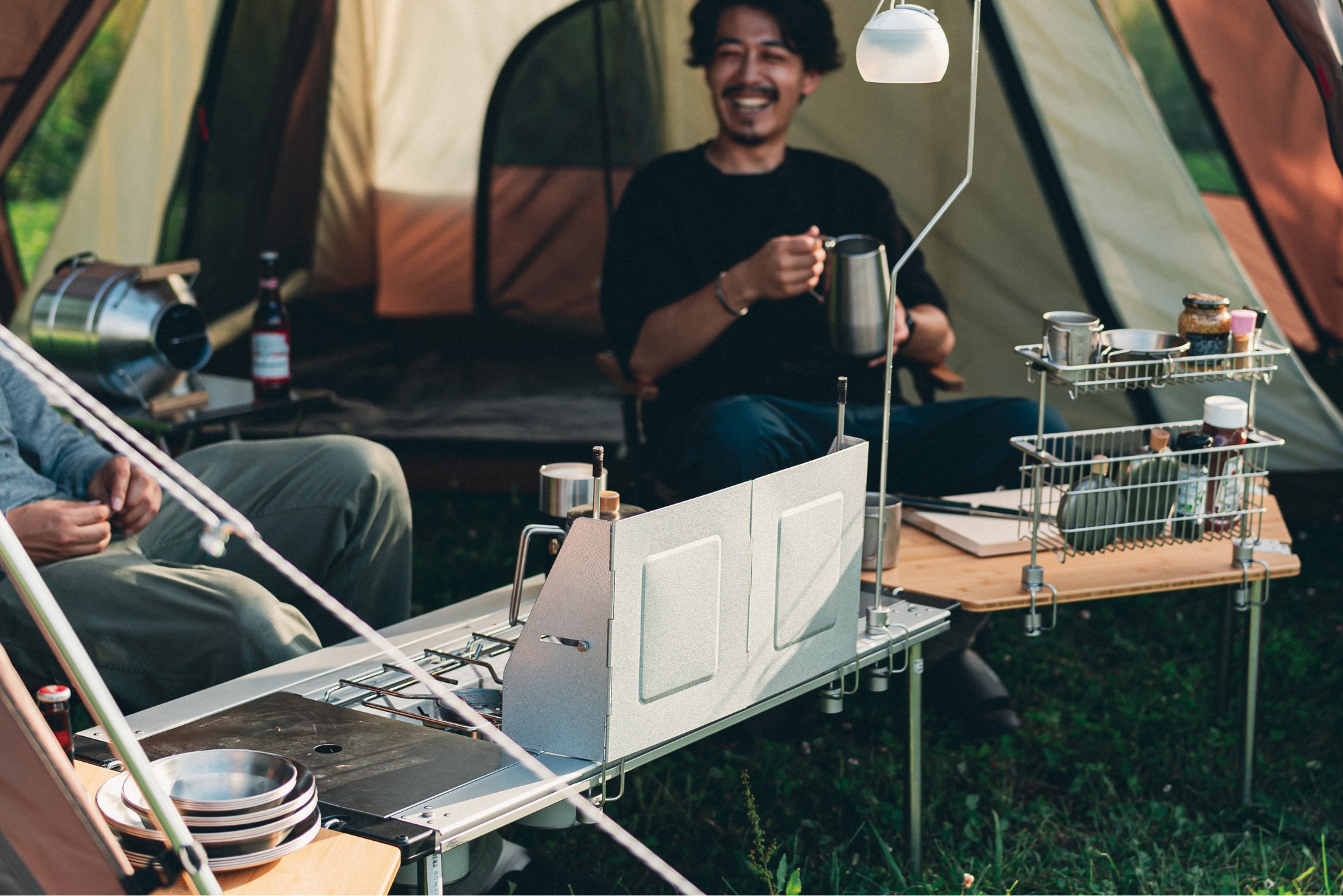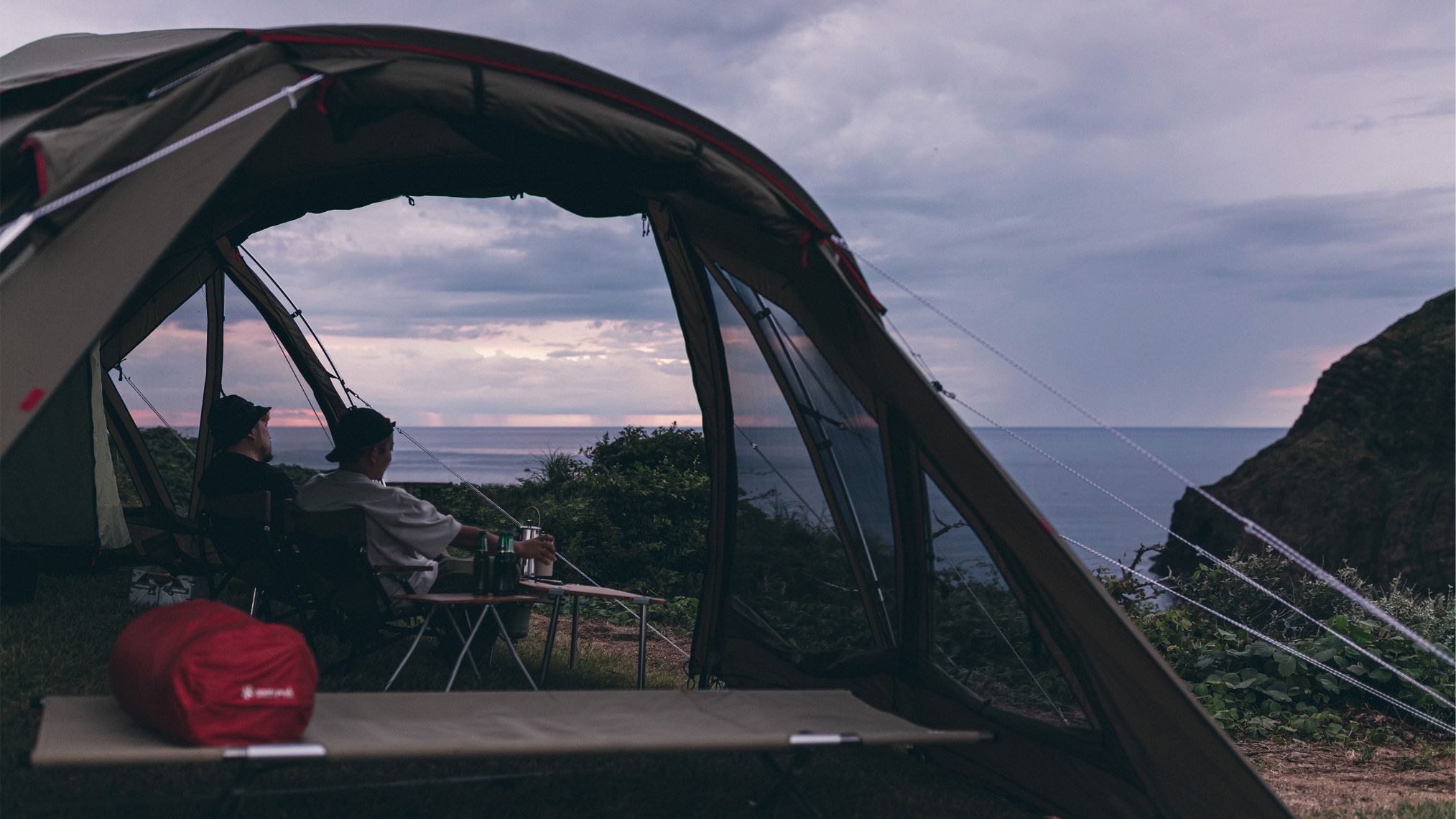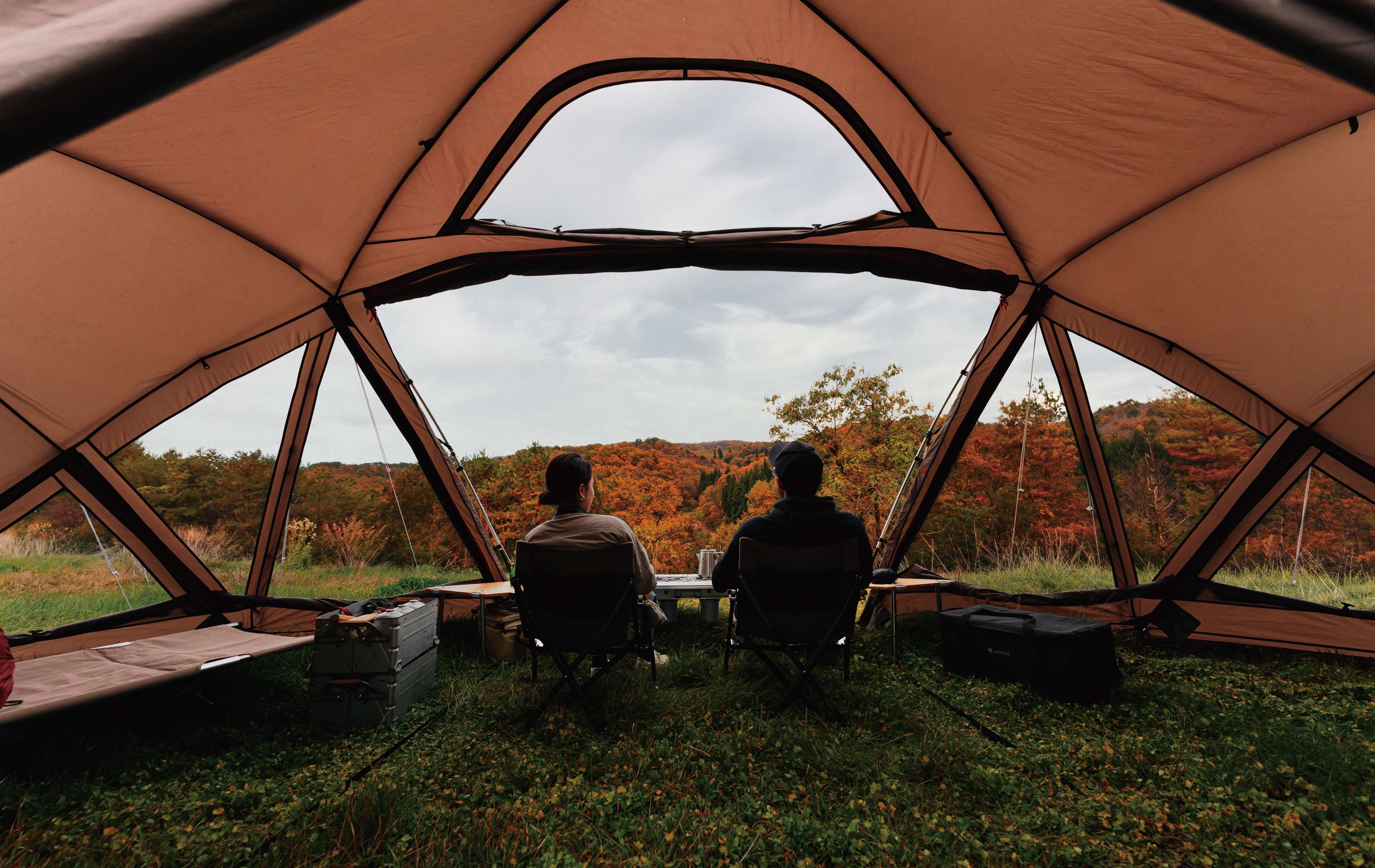 目の前の素晴らしい景色をあらわす「眺望絶佳」から名付けられたZekkaは、まさに「自然との対話」という概念に基づいて開発された絶景を楽しむのに相応しいシェルター。緩やかに湾曲したデザインに、大きく開くフロントパネルにより圧倒的な開放感を実現。左右に広がるパノラマを眺められます。Zekkaではチェアを横並びにすることで、一緒に過ごす家族や仲間と同じ景色を楽しむことができます。一方、バックパネルの外側は弧の内側になり、直感的に焚火台を置いて集いたくなるような空間をつくることで、コミュニケーションを生み出します。