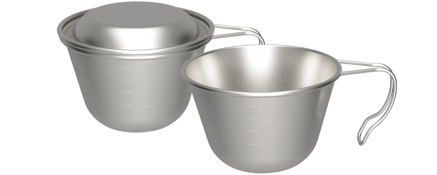 チタンシェラカップの深さと容量をアレンジし、スープなどの汁物に適した仕様にアップデート。スプーンで具材をすくいやすい丸みのある形状にしました。付属の蓋は灰やゴミの混入を防げるほか、小皿としても使えます。本体底面には、自社工場で製造していることを示す刻印を施しています。