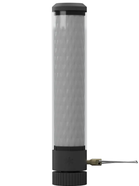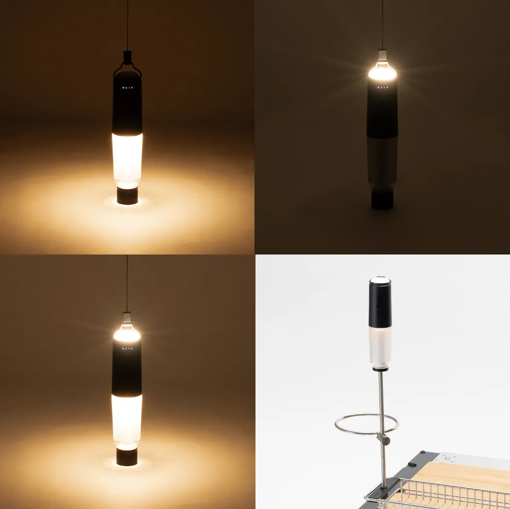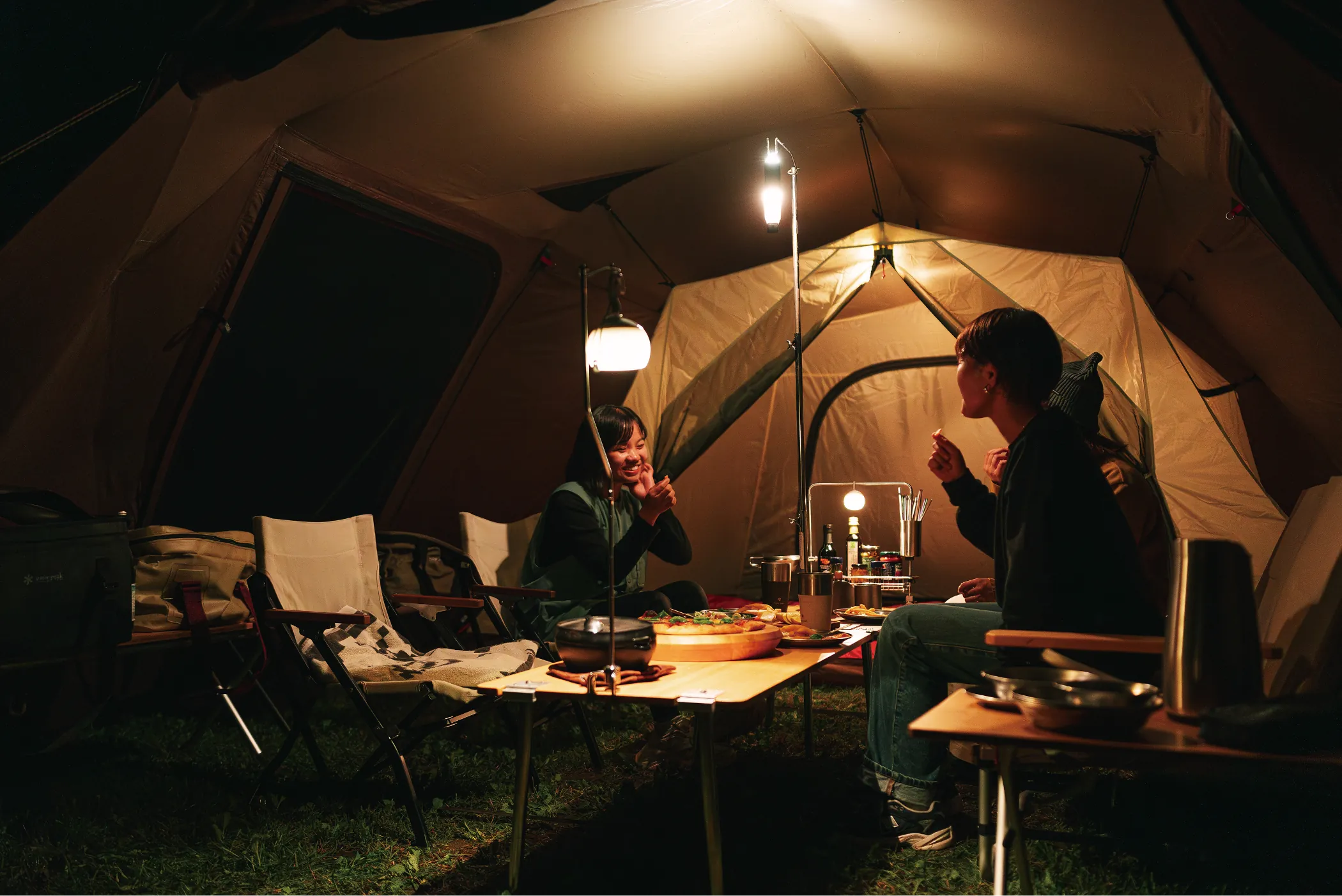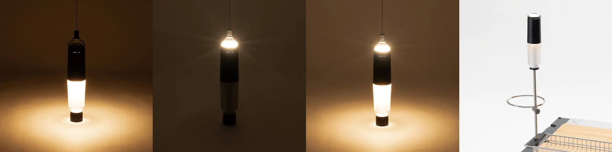 上下に光源を備えたLEDランタン。下側のライトは食卓を照らし、上側のライトは天井に光を当てることで幕体全体を照らす大きな光源として機能し、空間全体をあたたかな光で包んでくれます。天井から吊した場合は、付属のスライダーパーツで高さ調節が可能。三脚やTTAシリーズにも接続でき、設置する場所を選ばずに多様なシーンで活躍します。