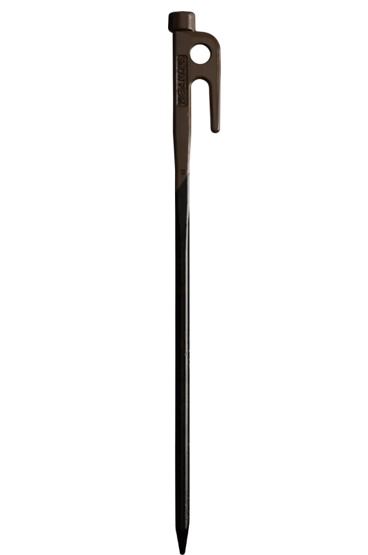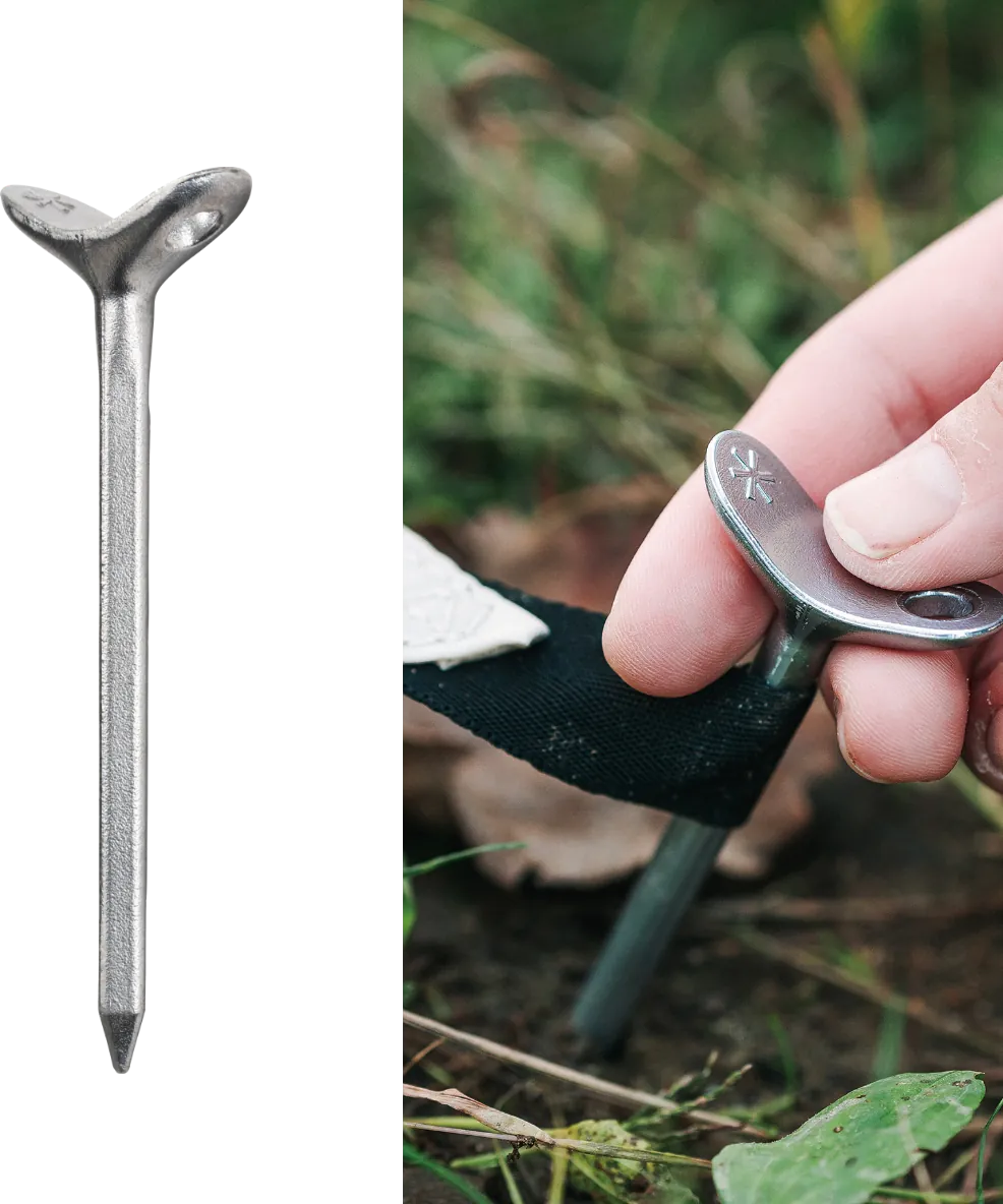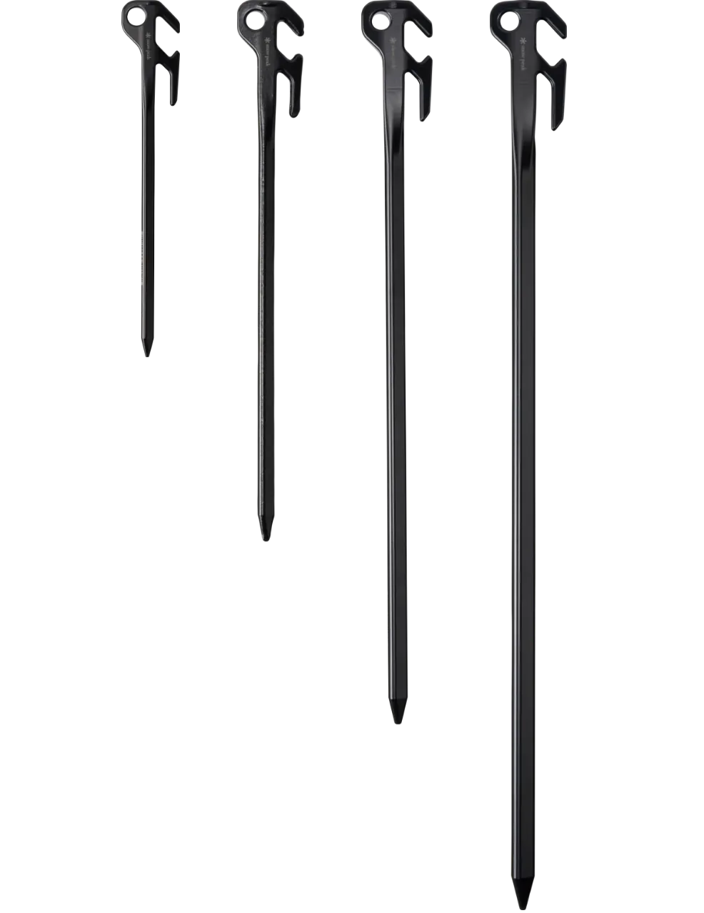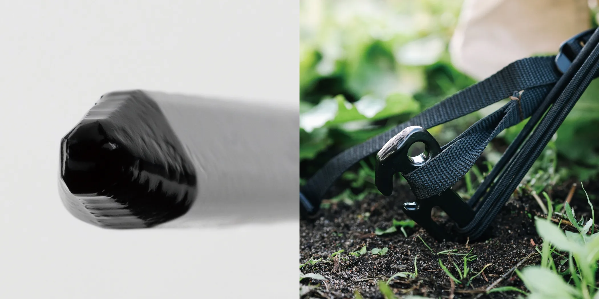1995年の発売以来、圧倒的支持を集める「ソリッドステーク」で培った知見と技術を活かして誕生した新型ペグ。地面に打ち込みやすく、捻ることで抜きやすくなる三角形状を採用しています。ハンマーのフックをかける穴が地面に打ち込まれた際に上側にあることで、抜く際の負担を軽減。また天面の面積が広く、打ち損じが起きにくい形状です。さらに2か所に設けたフックも特長で、地面に深く差し込んだ後でも、インナールーム等のゴムやロープを上側のフックに引っかけることができるので、ペグの打ち直しを必要としません。また、打ち込む際の適正角度である45度を、目視で確認しやすい形状にデザインしています。