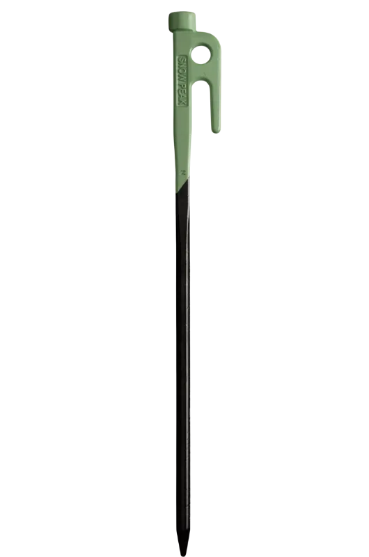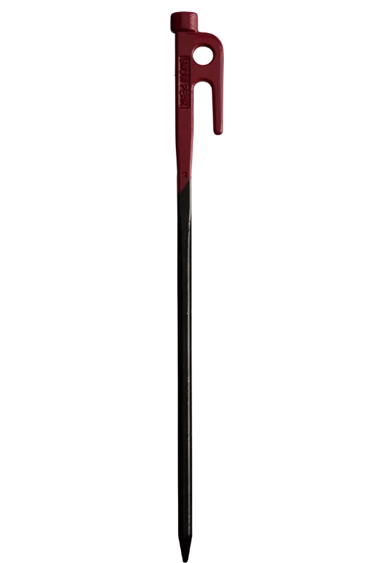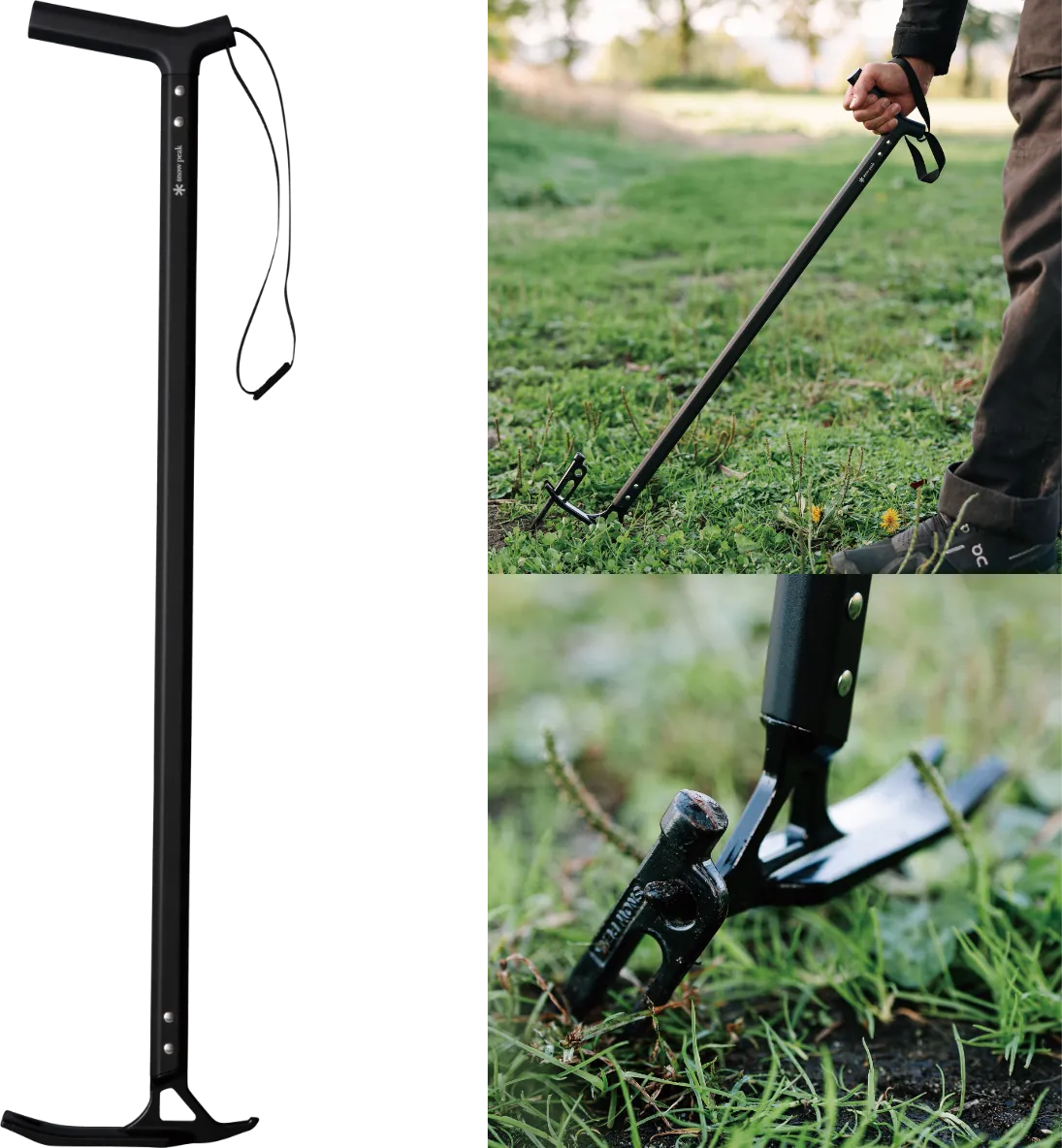 L字のヘッドを引っかけることで、てこの原理を用いて力をかけずに、屈まずにペグを抜くことができます。腰を屈めて作業する必要がないので、撤収の際にかかる体への負担を軽減してくれるアイテムです。ヘッド部分は強度を備えた鍛造製。