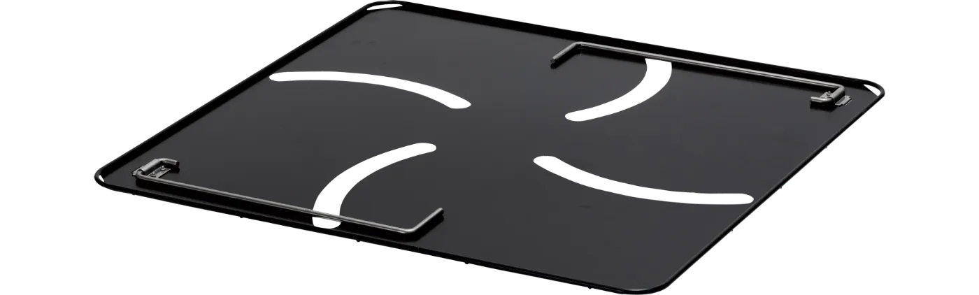 「焚火台LL」専用のベースプレート。焚火台を上に乗せ、スリットに合わせてプレートを半回転し、フックで固定する仕様です。LLならではの本体と地面との距離を活かして、その間にプレートを挟むことで、火の粉や灰を受け止めつつ焚火台からの放熱を緩和。芝や地中の微生物を守ります。