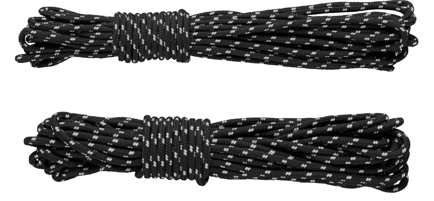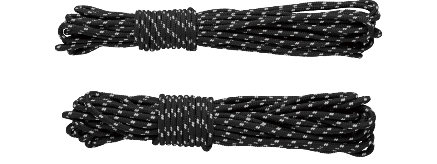 Pro. air シリーズなどの幕体にも使用している、ブラックカラーのロープ。ポリプロピレン素材を用いており、軽く、自在の食いつきが良い点が魅力です。水に濡れても強度はほぼ変わりません。キャンプでは、もしもの時の予備用や補助用として用意しておくと安心です。