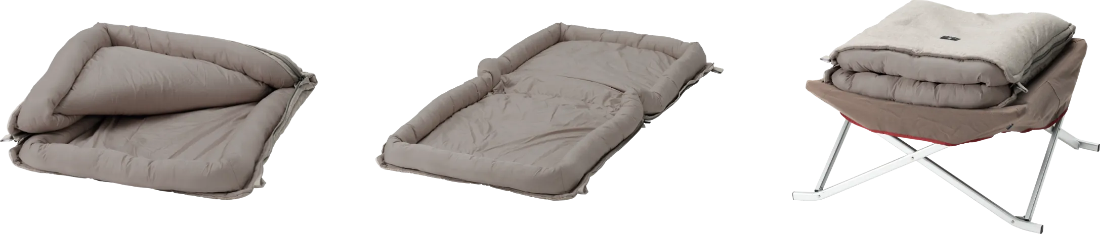 スノーピークのシュラフ「オフトン」シリーズをワンちゃん用にリデザイン。小型~中型犬に対応します。顎を乗せてリラックスできるよう、縁にはあえて高さを出しました。ケースに入れればコンパクトになり、持ち運びの際も便利です。