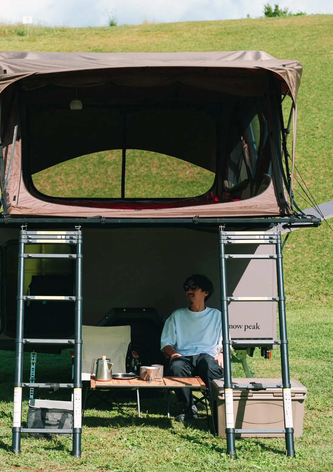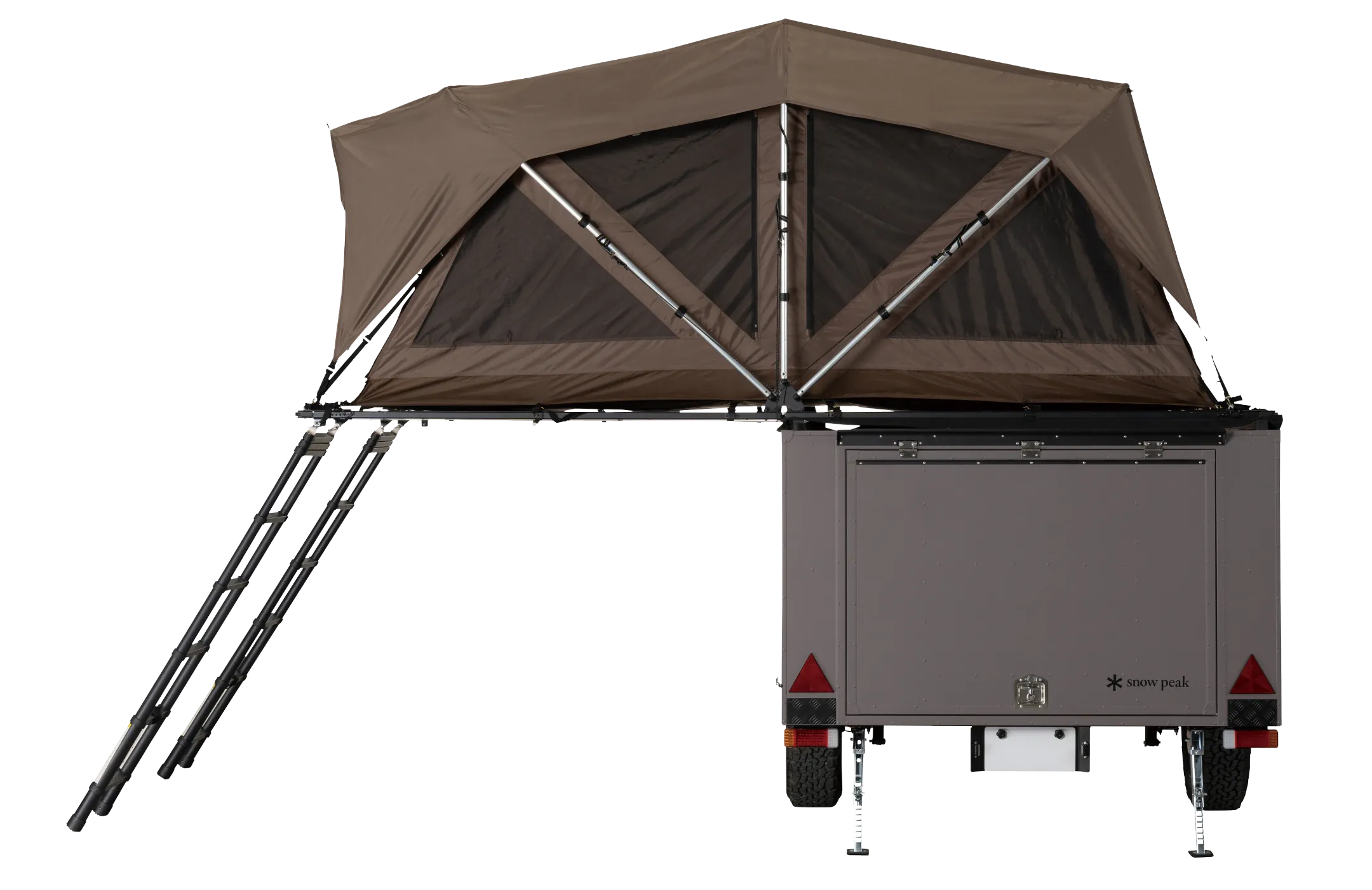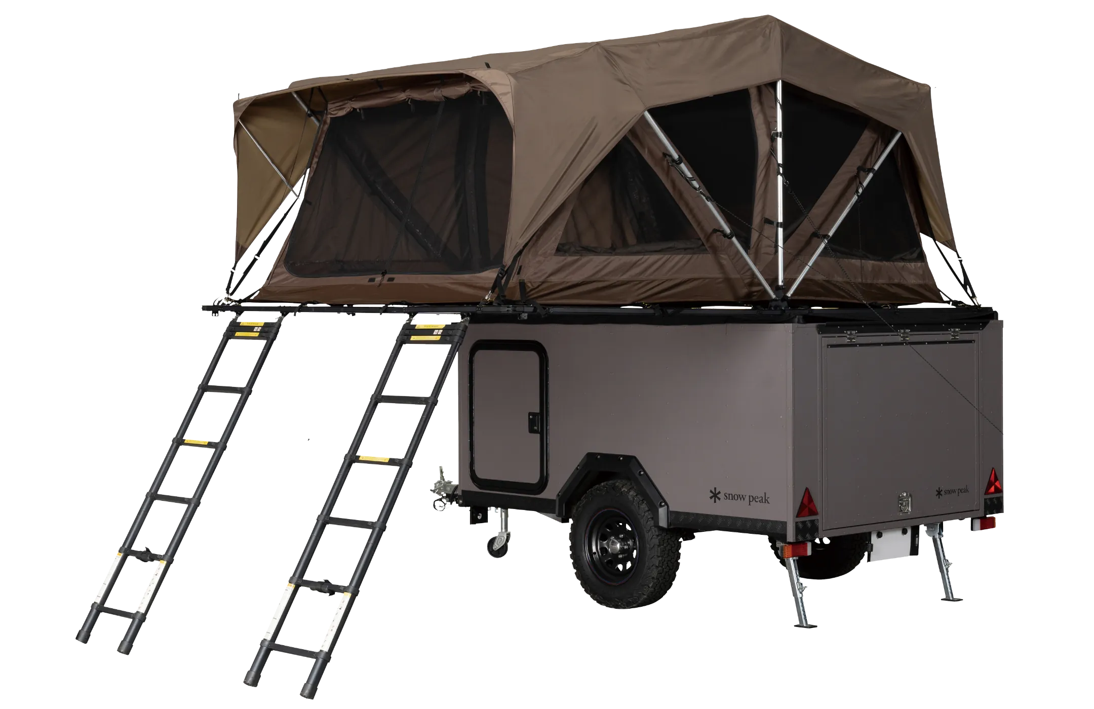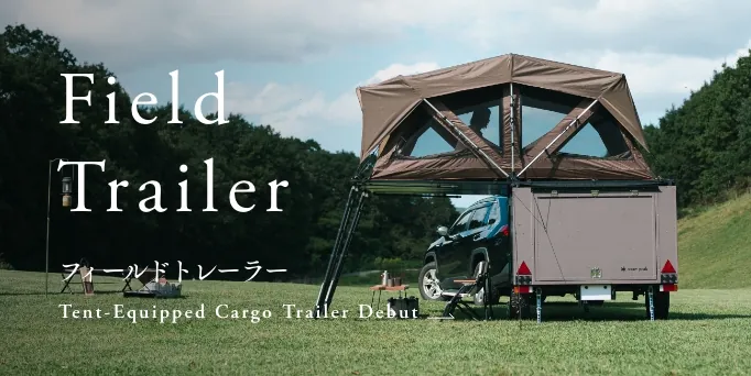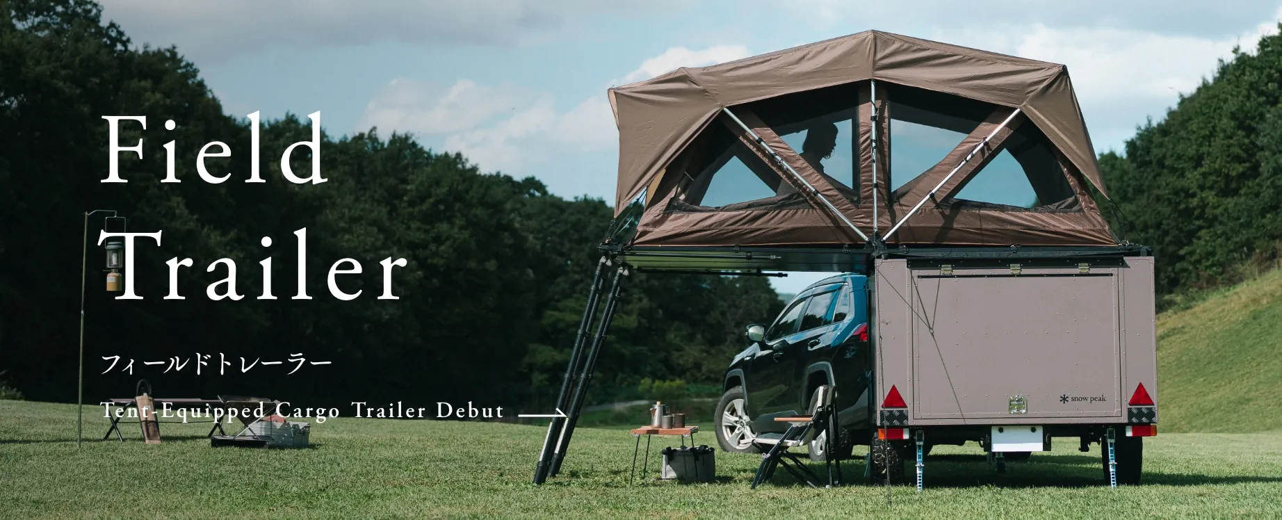 欧米では一般的な、ルーフトップテントでのキャンプスタイル。設営撤収が短時間で済むので、自由時間を最大限確保できるというメリットがあります。そんなスタイルをスノーピークらしく再構築した新モデルが、大型のカーゴトレーラーとルーフトップテントを組み合わせた「フィールドトレーラー」です。けん引免許を必要としない規格で、普通免許でのけん引が可能です。毎日の通勤やお買い物で使用している自家用車に専用部品※を取り付けることで、けん引車として使うことができます。