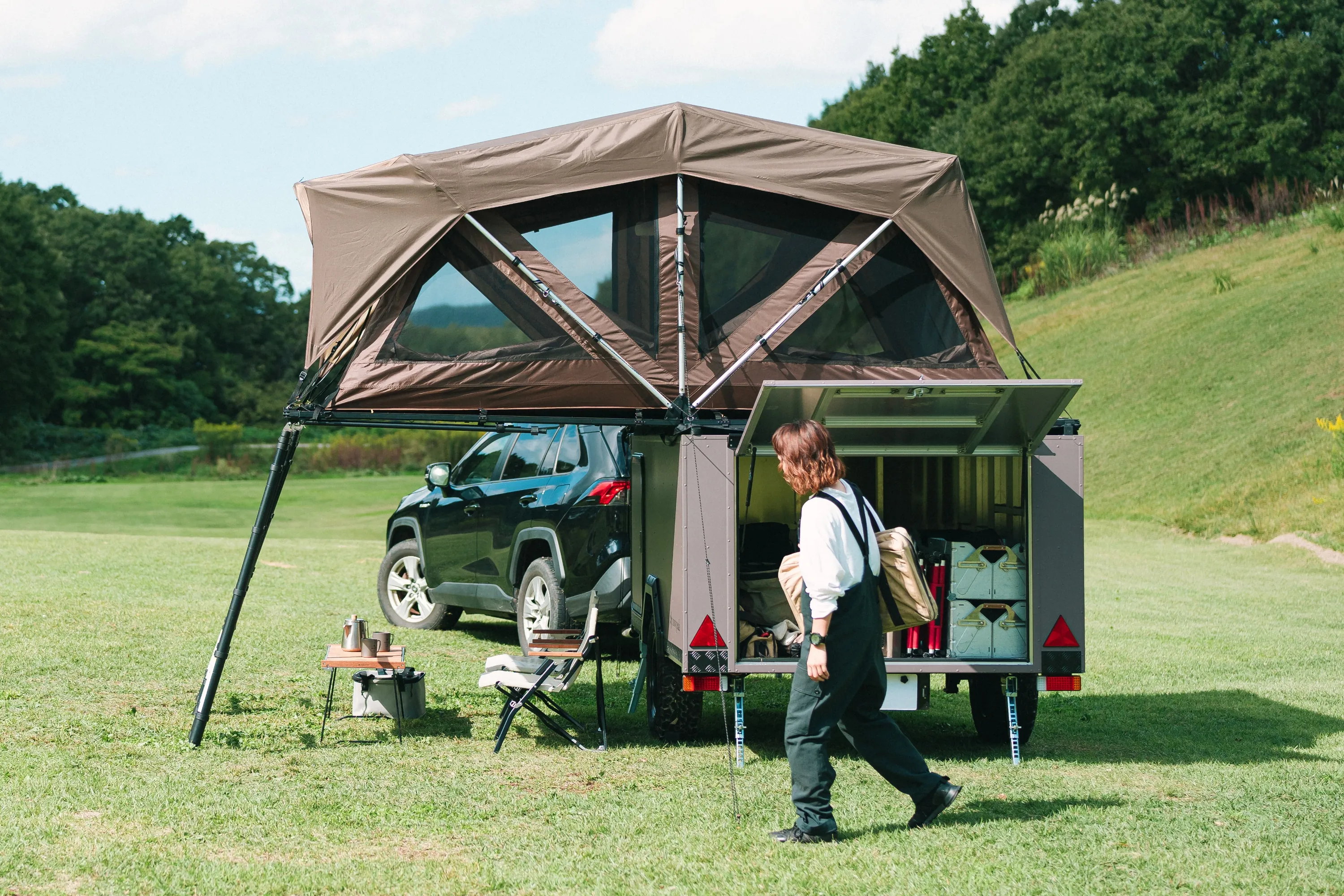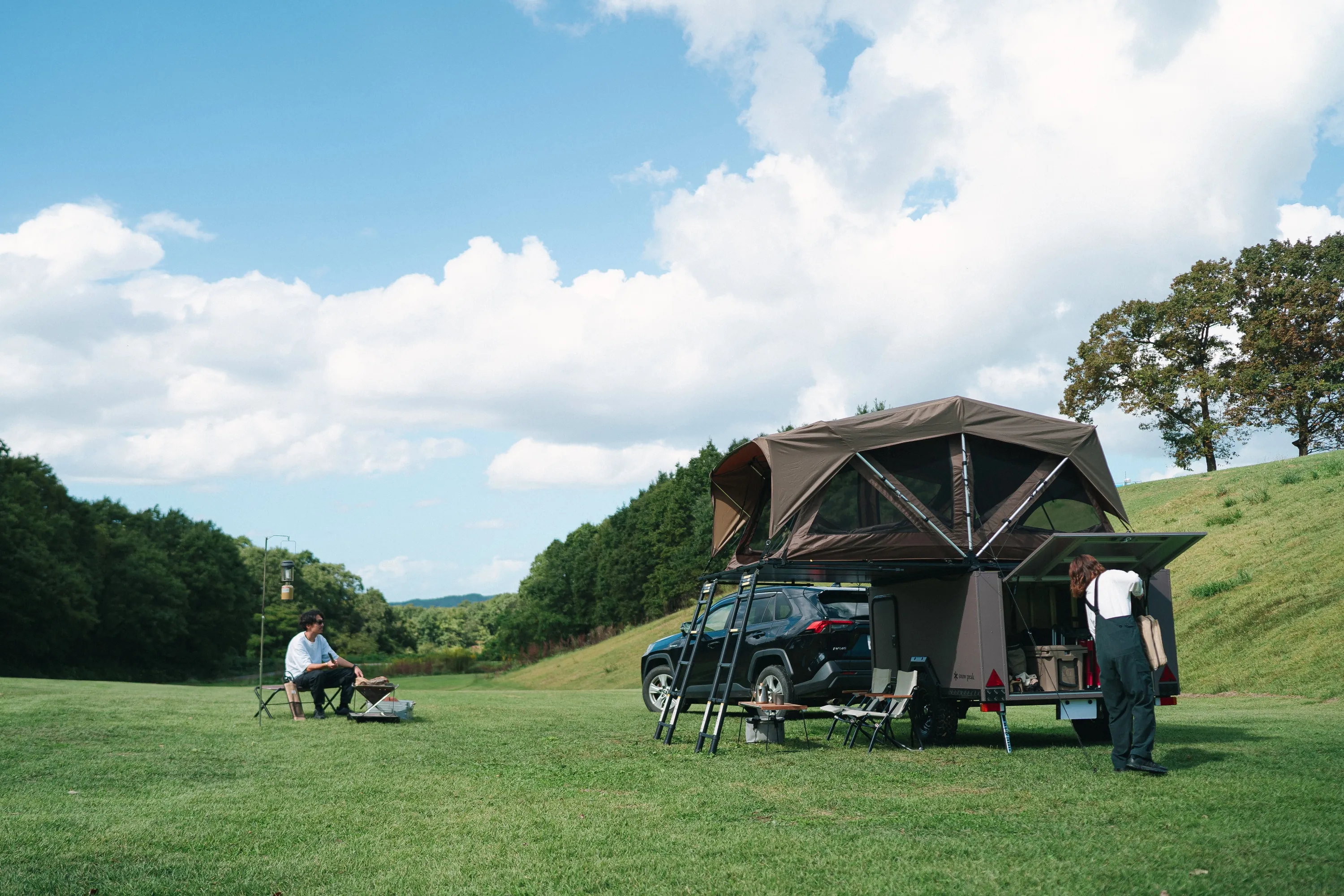 フィールドでテントの設置を終えたら、自家用車を分離してお買い物や温泉に出かけることも可能。キャンプを宿泊手段として、訪れた先でのアクティビティを思いっきり楽しむ。そんなスタイルを、より快適に実現するための新たな選択肢としてご提案します。
