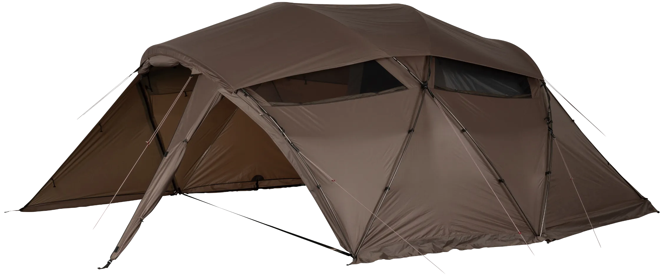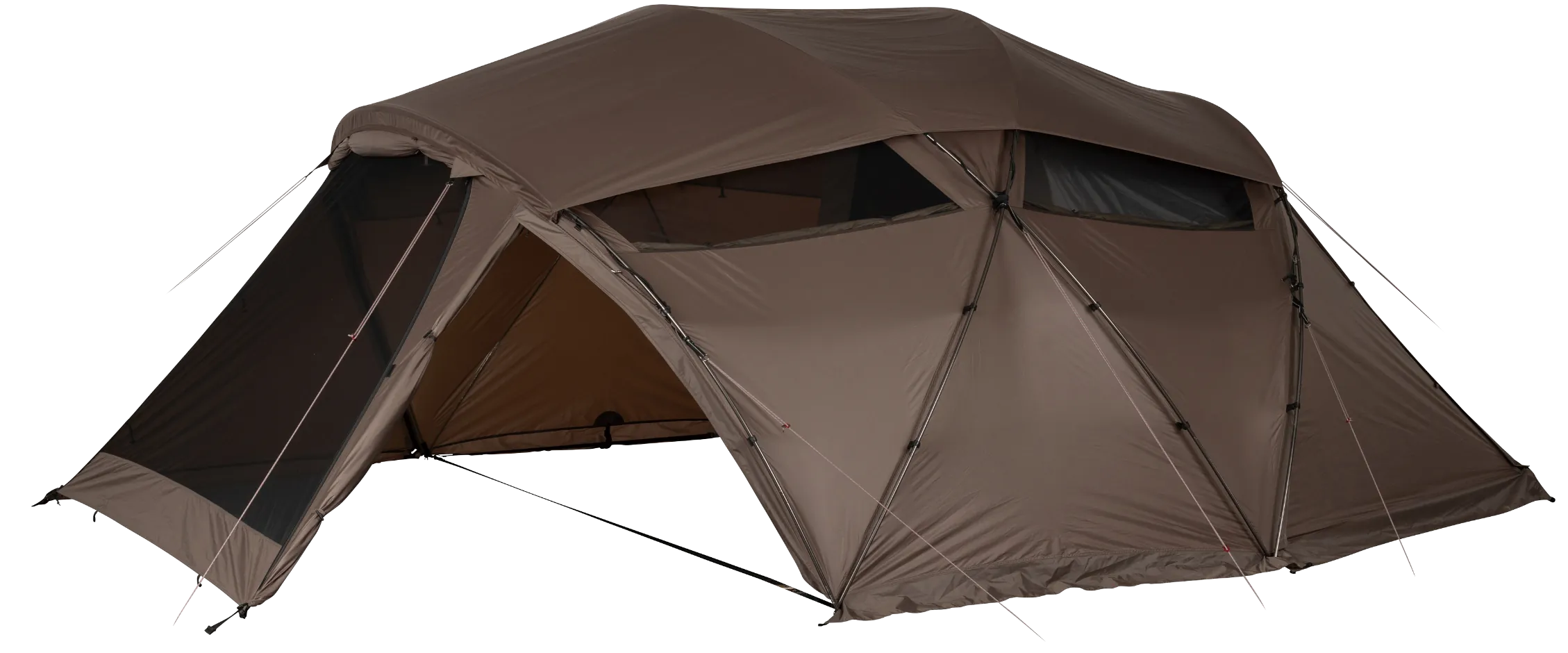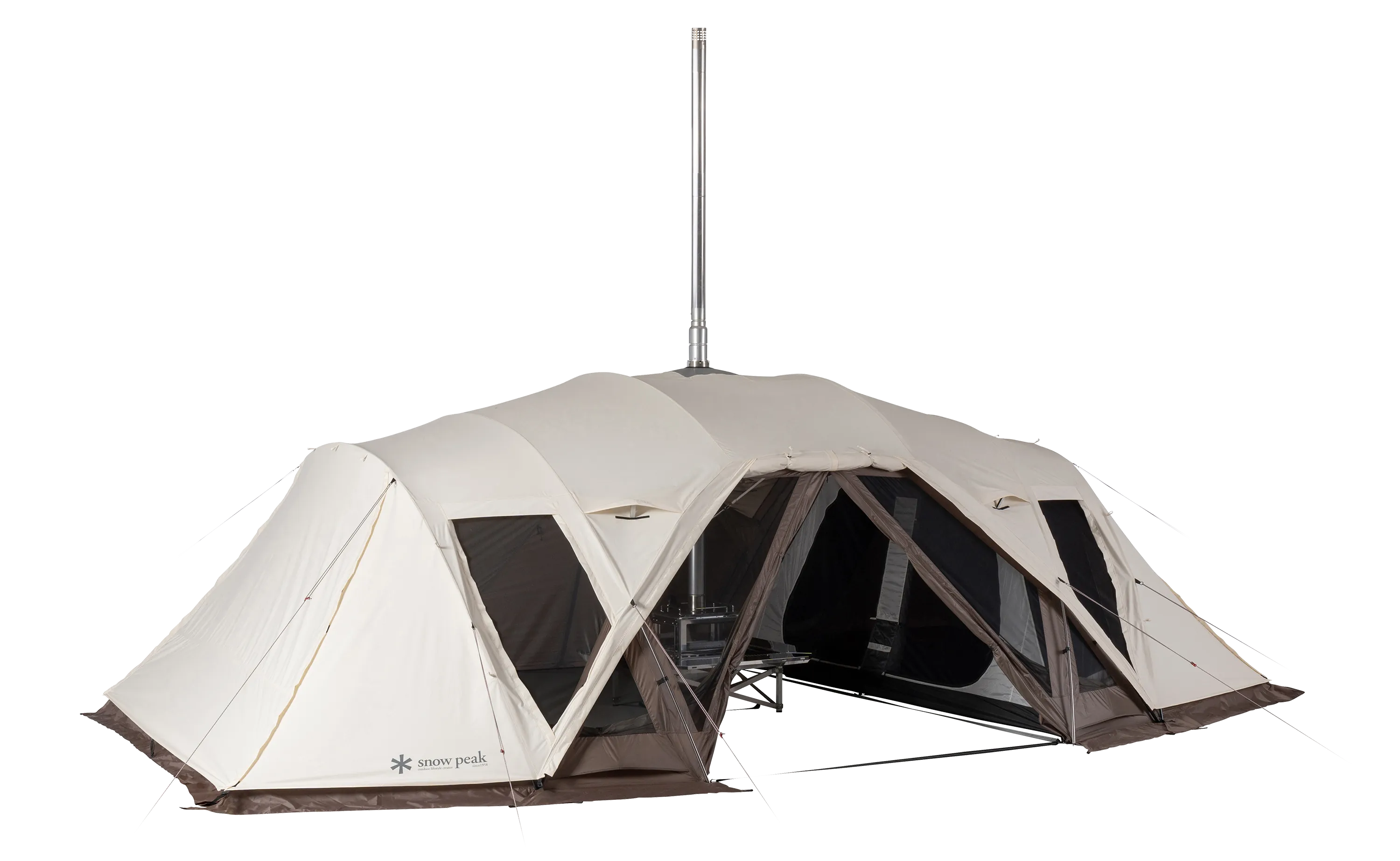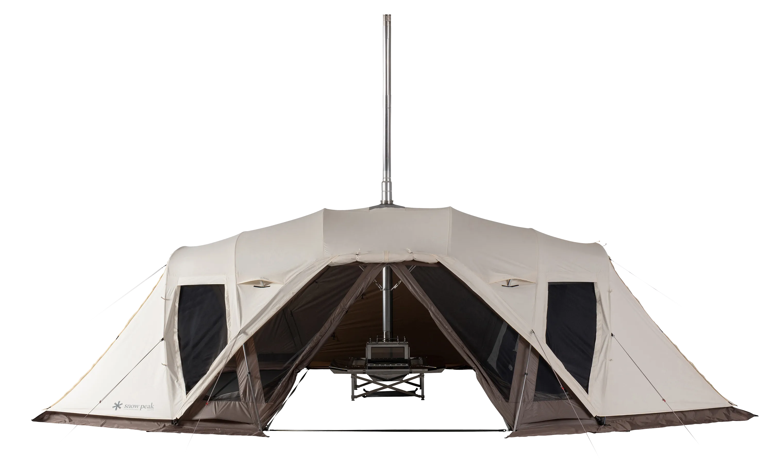 スノーピークのシェルターでは最大クラスのサイズと、薪ストーブをシェルターの中央に配置する特徴的な設計で、複数人のグループでもゆとりをもってストーブを囲むことができます。本体には、建てやすく風に強い頑丈なフレームワークと、既存のPro.ラインの幕体とは異なる、より薄く丈夫なポリエステルのリップストップ生地を採用しています。さらに、綿を混紡した火の粉に強いTCフルフライシートを上から重ねる、シェルターとしてはスノーピーク史上初の完全二重構造も大きな特長です。幕と幕の間に空気の層が生まれることによって、外気温の影響を受けにくい上に、空気の循環を促進させています。さらに本体とフルフライシートも、それぞれに複数のベンチレーションを備えています。これによって万が一、煙が発生しても幕内に残りにくい仕様となっています。