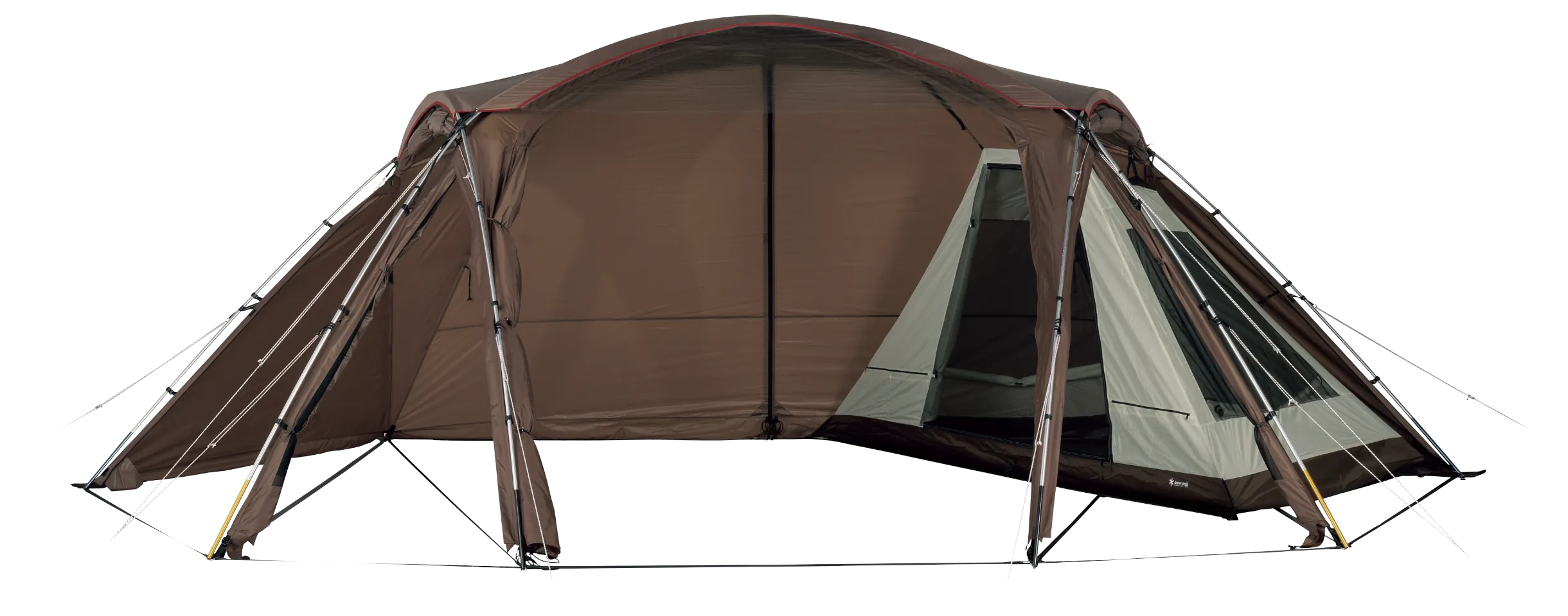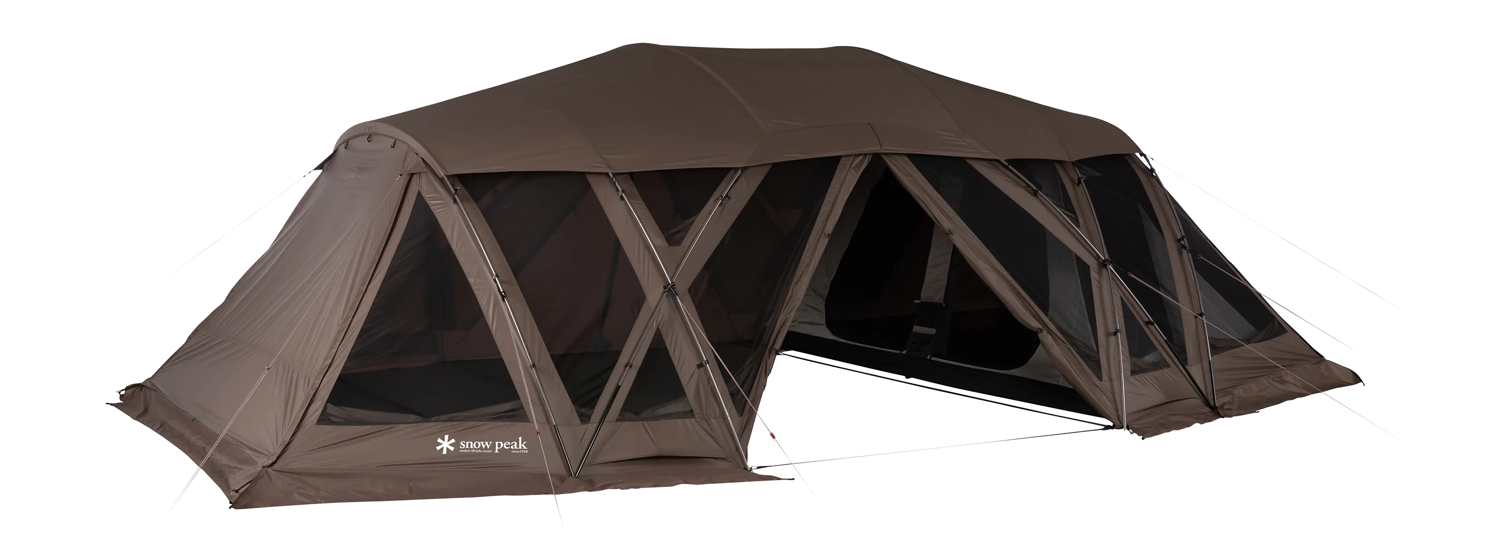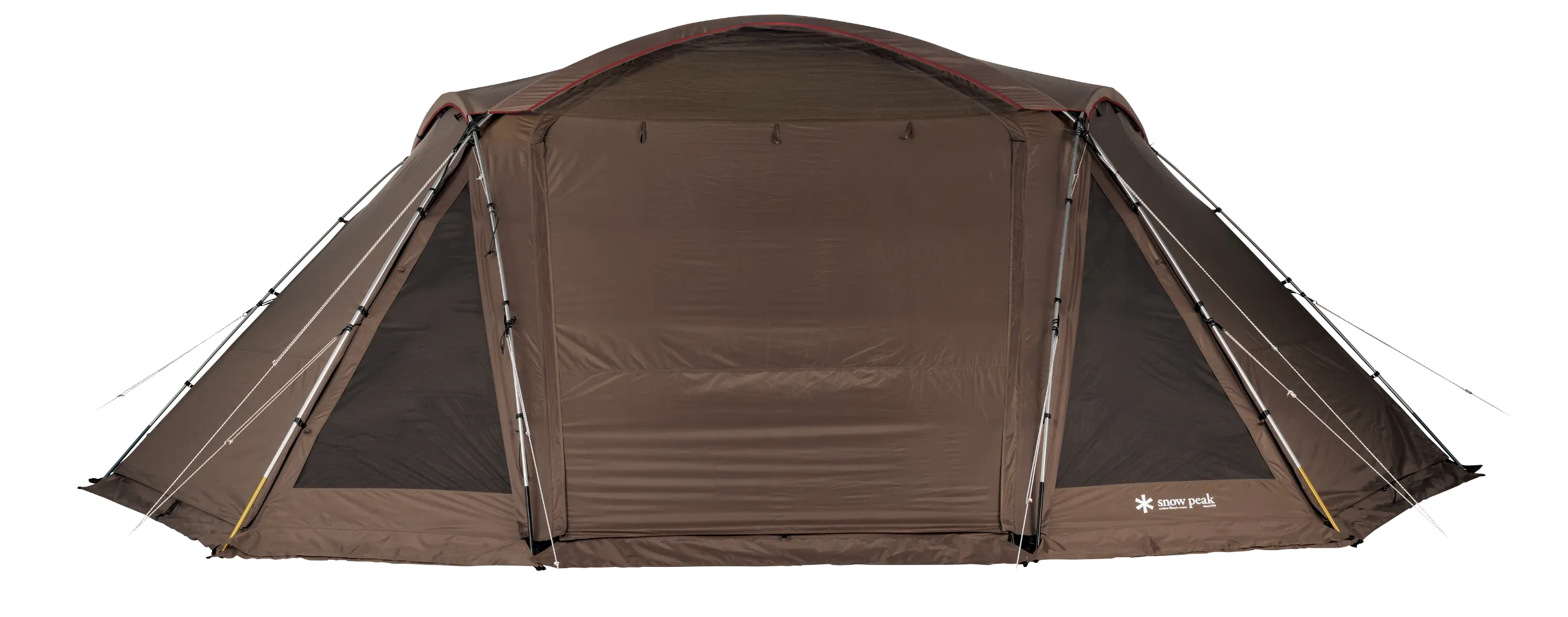 スノーピークのシェルターでは最大クラスのサイズと、薪ストーブをシェルターの中央に配置する特徴的な設計で、複数人のグループでもゆとりをもってストーブを囲むことができます。本体には、建てやすく風に強い頑丈なフレームワークと、既存のPro.ラインの幕体とは異なる、より薄く丈夫なポリエステルのリップストップ生地を採用しています。さらに、綿を混紡した火の粉に強いTCフルフライシートを上から重ねる、シェルターとしてはスノーピーク史上初の完全二重構造も大きな特長です。幕と幕の間に空気の層が生まれることによって、外気温の影響を受けにくい上に、空気の循環を促進させています。さらに本体とフルフライシートも、それぞれに複数のベンチレーションを備えています。これによって万が一、煙が発生しても幕内に残りにくい仕様となっています。