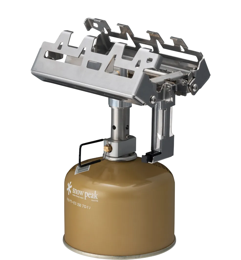 開閉式のゴトクと、折りたたみ可能な器具栓とイグナイターを持つ独自の機構が特長。火口はH字型の形状で、「トラメジーノ」や「ヤエンクッカー」のような幅の広い調理器具に対して、効率よく熱を伝えます。さらに、ゴトクの面積も広いので、安定感も抜群。“一人焼肉”にちょうどいいサイズの専用グリドルも登場します。