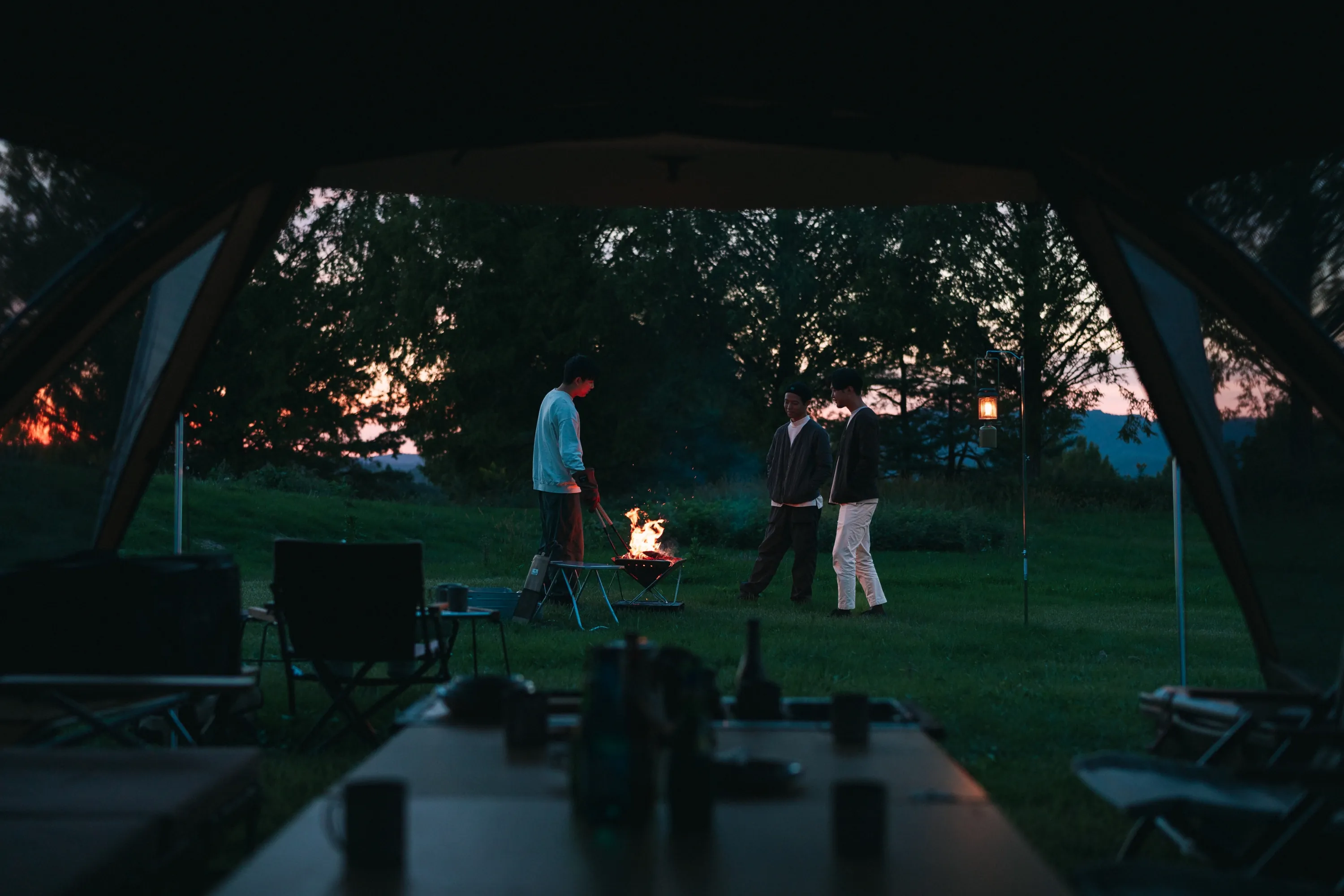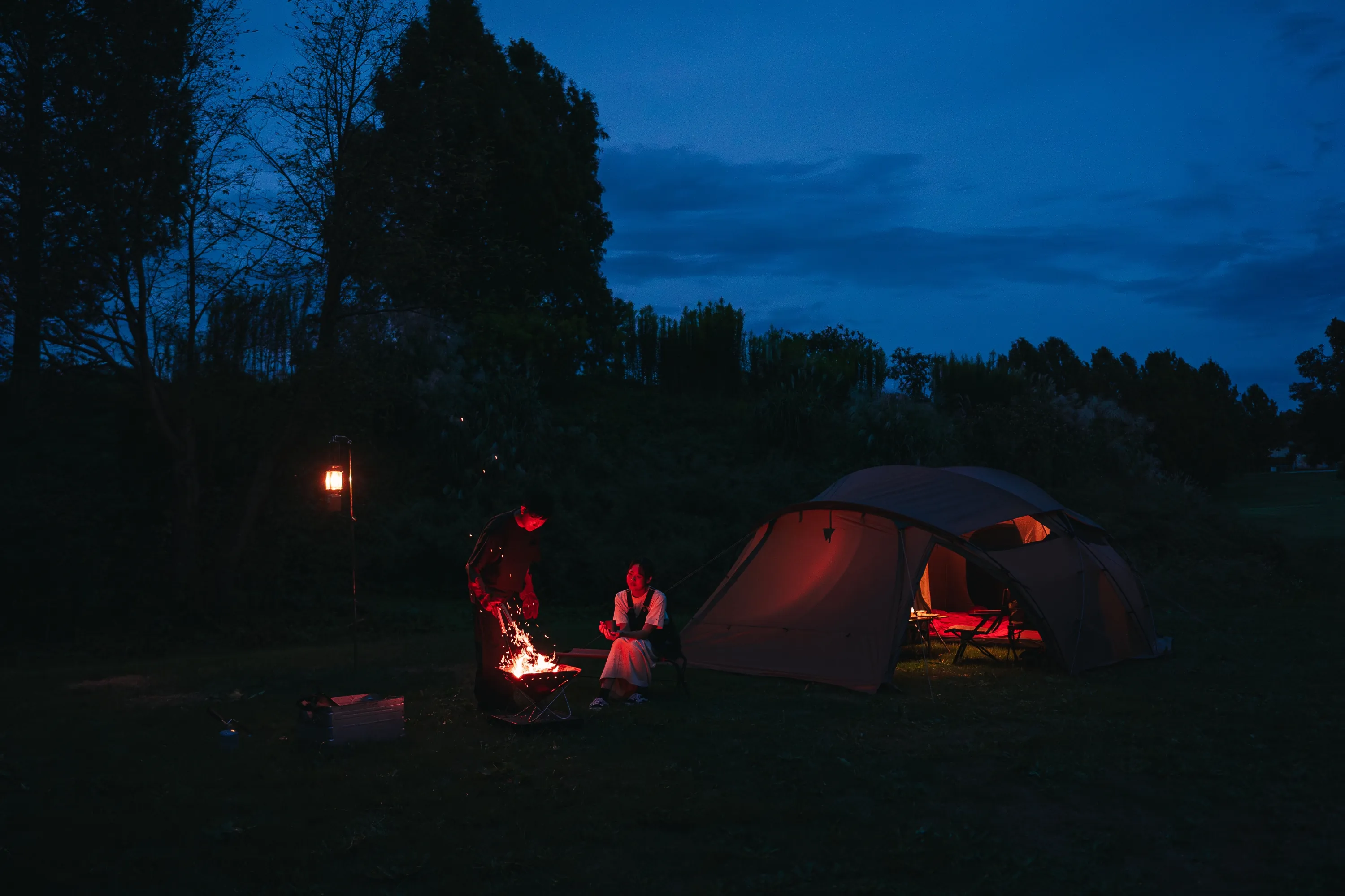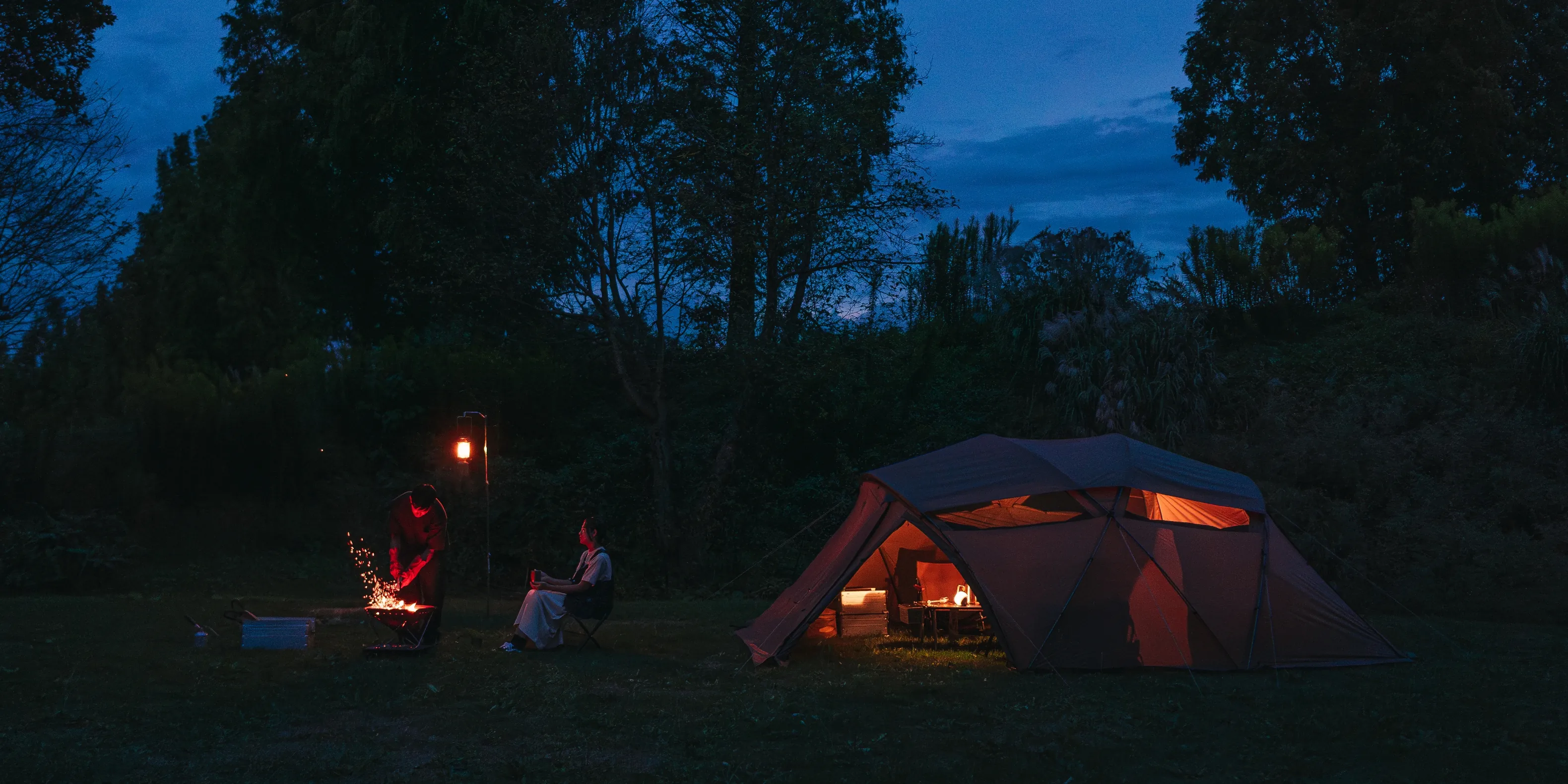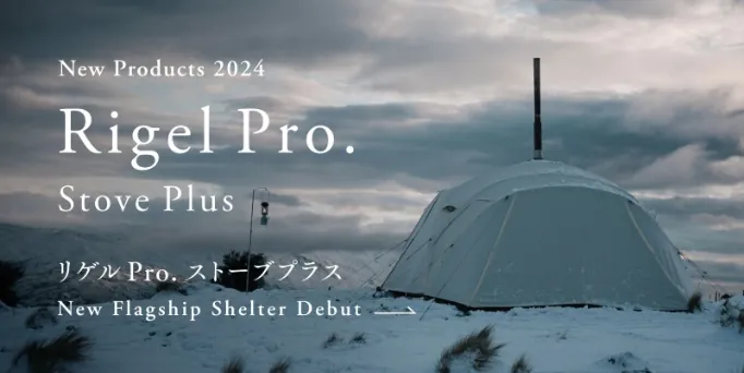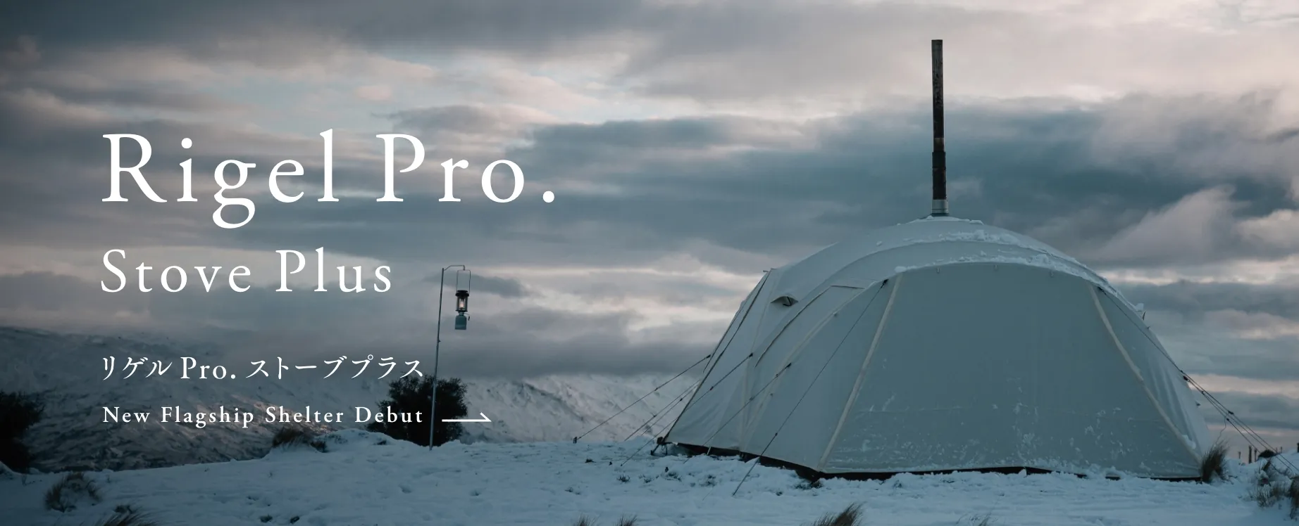 揺れる火を囲み、語り合う。焚火は、キャンプに不可欠なコミュニケーションツールです。「リゲル Pro. ストーブプラス」は、そんな焚火の体験を真冬でも幕内で楽しめる、薪ストーブ付属の完全二重構造シェルターです。