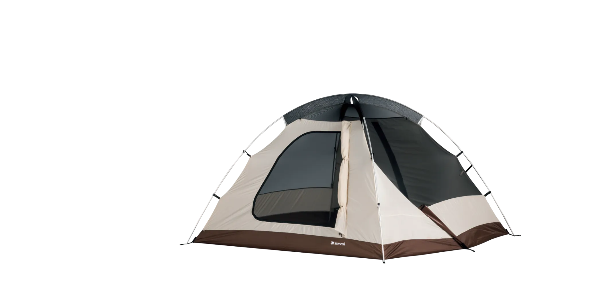 フライシートと地面をつなぐロープを省いた、新仕様のドームテント。ロープレスにすることで、設営にかかる時間や身体への負担を軽減しています。6方向に伸びたフライシートのボトムを、地面にしっかりと固定することで強度をカバー。スノーピークの既存のテント群と同等の、十分な耐風性を備えています。前方に長く伸びた前室パネルを跳ね上げれば、タープのように機能し、大人二人がゆったりとくつろげるサイズのリビング空間を拡張させることができます。インナーテントには、スタンダードなクロスフレームを採用しており、天井と四方に施した大きなメッシュも特長です。インナーテントとフライシートとの間を風が通り抜け、通気性に非常に優れた構造となっています。夏場の蒸し暑さを感じにくく、結露も軽減。プライバシーを守りながら、風が抜けていくのを肌で感じられます。また、インナーテントの出入口のパネルには、伸縮性のあるコードが付いており、メッシュパネルを開けた状態であれば、出入り口のパネルを手前に引くだけでスムーズな出入りが可能です。風通しの良さとその形状から、“風を感じる帆”という意味を込めて「ウィンゼル」と名付けました。特に、春から秋のキャンプシーンに適したテントです。