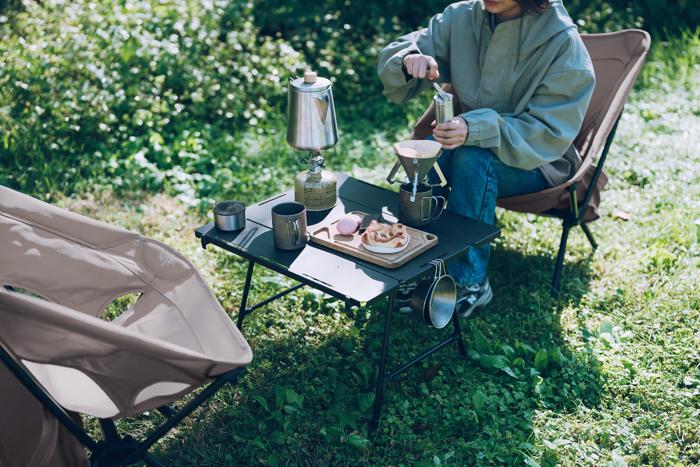 フレームには黒、座布にはグレージュを採用。落ち着いた色合いで、他のスノーピーク製品とも調和する佇まいです。