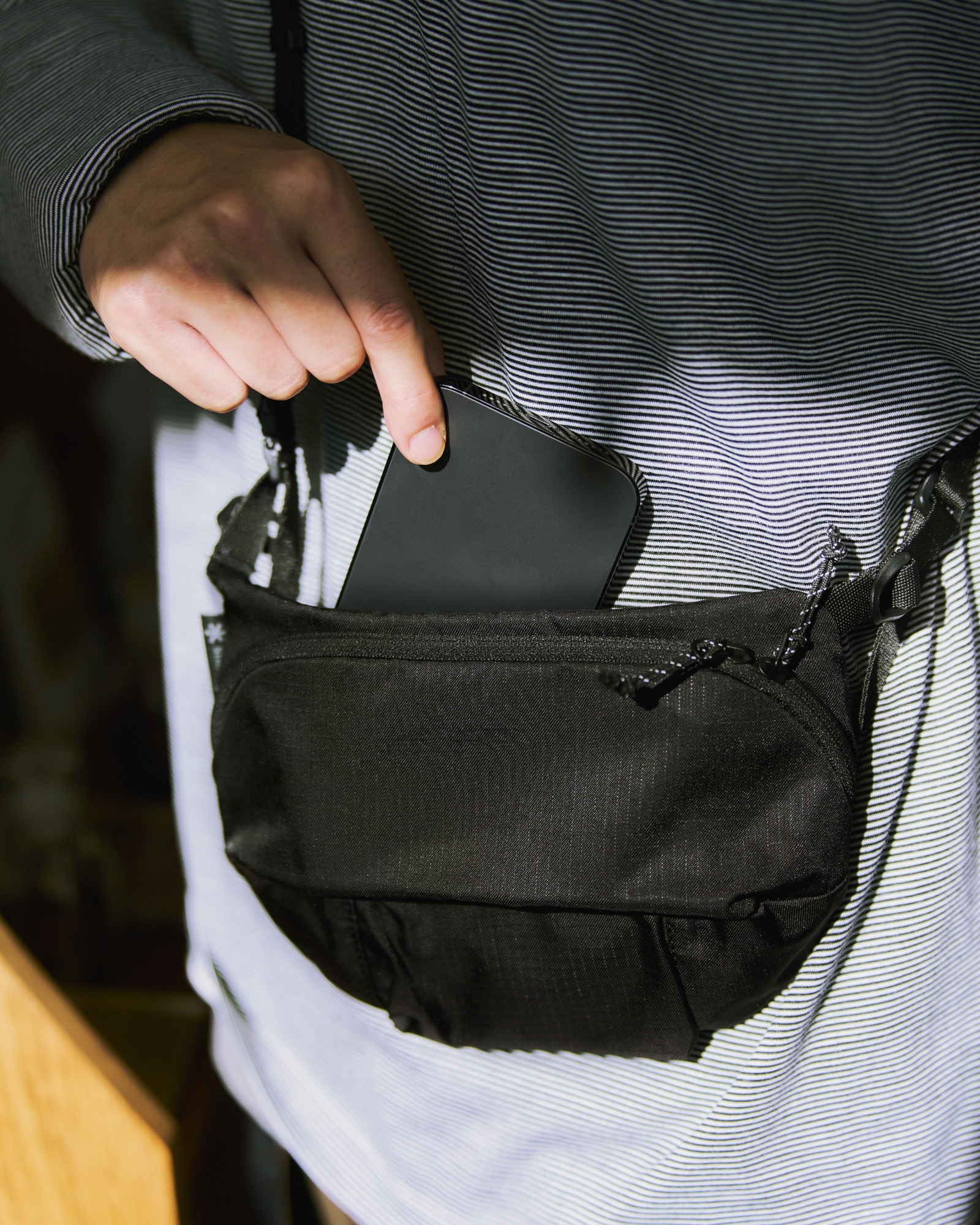 メインポケットはスマートフォンや小さめの財布を収納できるサイズで、前面にはリップクリームやワイヤレスイヤホンなどの小物を整理しやすいポケットを配置しています。背面にはボタン留めのポケットを備え、使用頻度の高いアイテムにもスムーズにアクセス可能。ベルト部分の左右にはDカンを配し、鍵やカラビナを取り付けることもできます
