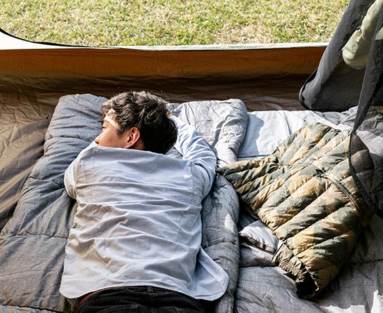 シェルターは、室内高215cm。サイドウォールは垂直に近い角度で立ち上がるよう設計しており、有効面積が広いのが特徴です。またテントは大人2人と子ども3人が並んで寝るのにちょうどいいサイズになっています。