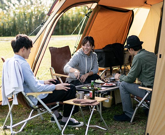 メッシュシェルターはメッシュの多さが一番の特徴。通気性と視界性が高く、フルメッシュにすれば、夏場は虫を気にすることなく、外の景観も楽しむことができます。サイドウォール上部、天面に近い部分にもメッシュを配し、明るく開放的なリビングを創出。さらにルーフシートが日差しの強さを軽減してくれ、快適な空間をつくります。