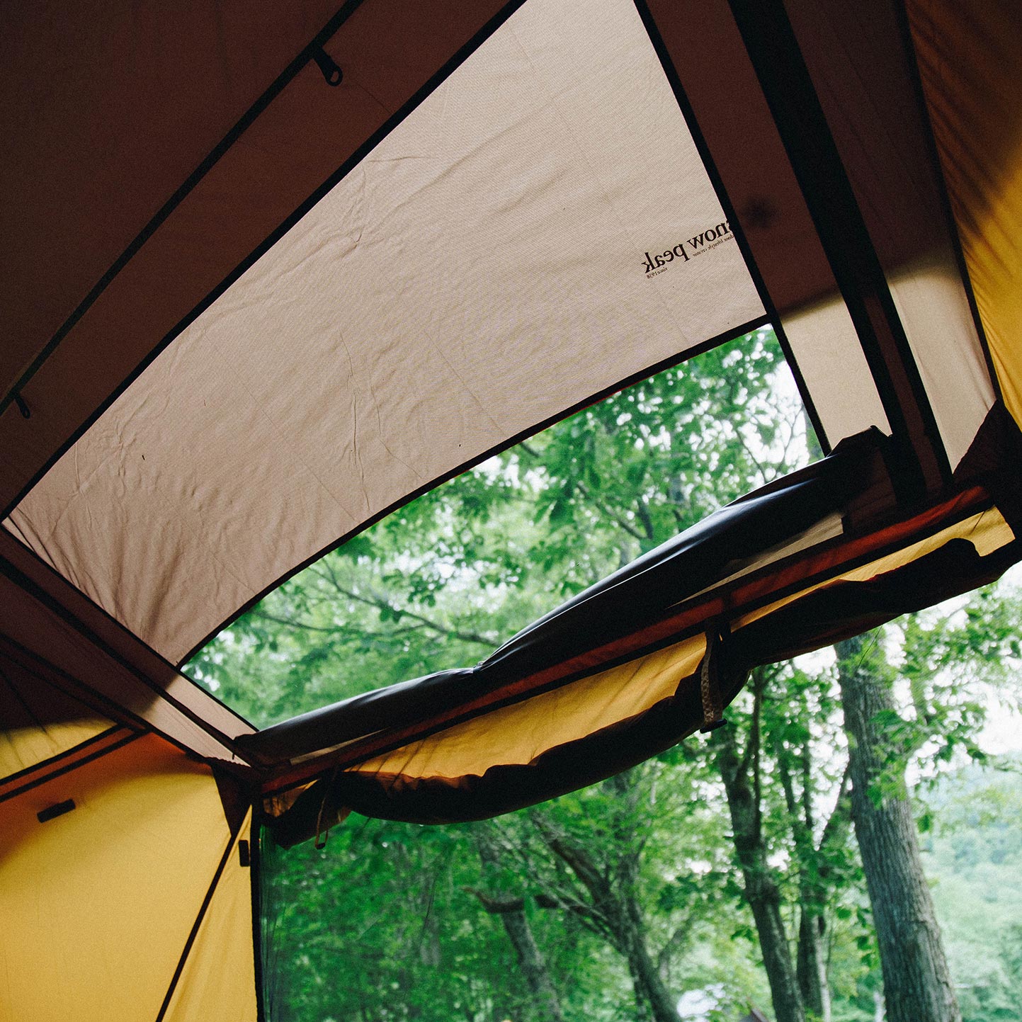 4面に大型のメッシュパネルを配し、さらにサイドウォール上部、天面に近い部分にもメッシュを配置。寝転んで星空を観察することもできますし、明かり取りの役割も果たします。ルーフシートとオーバーラップするので、雨天時も開けておくことができます。