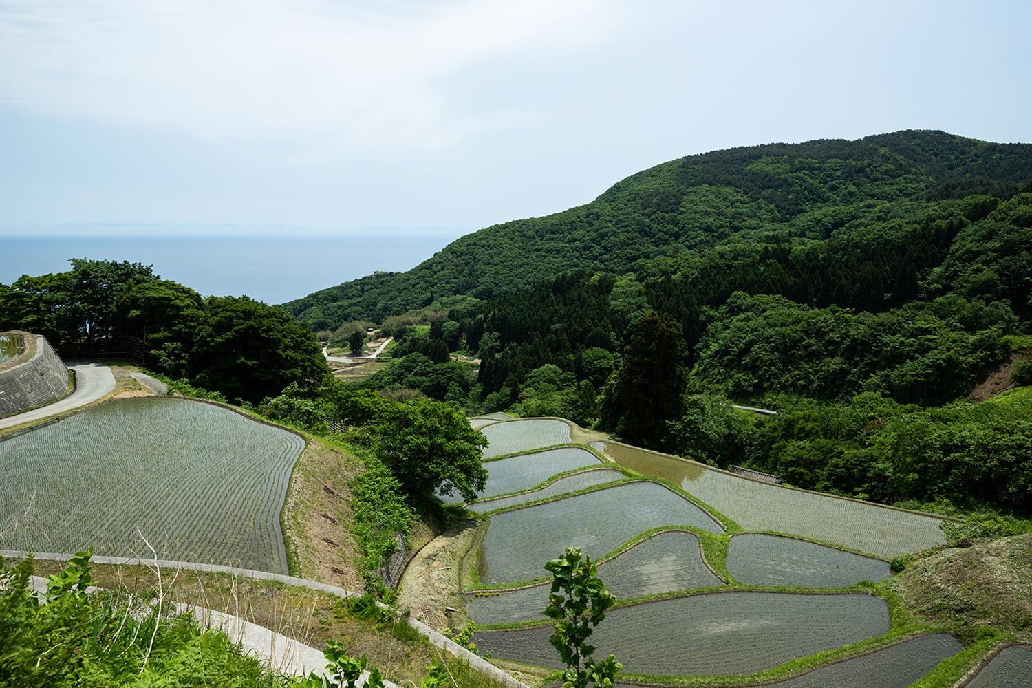 世界農業遺産(GIAHS)に登録されている佐渡島。海沿いの集落から標高350mを越える山間に、岩首昇竜棚田が広がっています。300年以上の歴史を持つ、江戸時代に開墾された急峻な土地は、変形田が多く、機械での作業が困難な立地ではありますが、山からの清水や湧水に恵まれ、海から昇る朝日と風の中で、棚田を守り、受け継ぐ農家たちの手によって、丁寧に米づくりが行われています。日本海を臨む絶景で、特に朝日の差し込む様子は、人々の心を打つほどの美しさです。