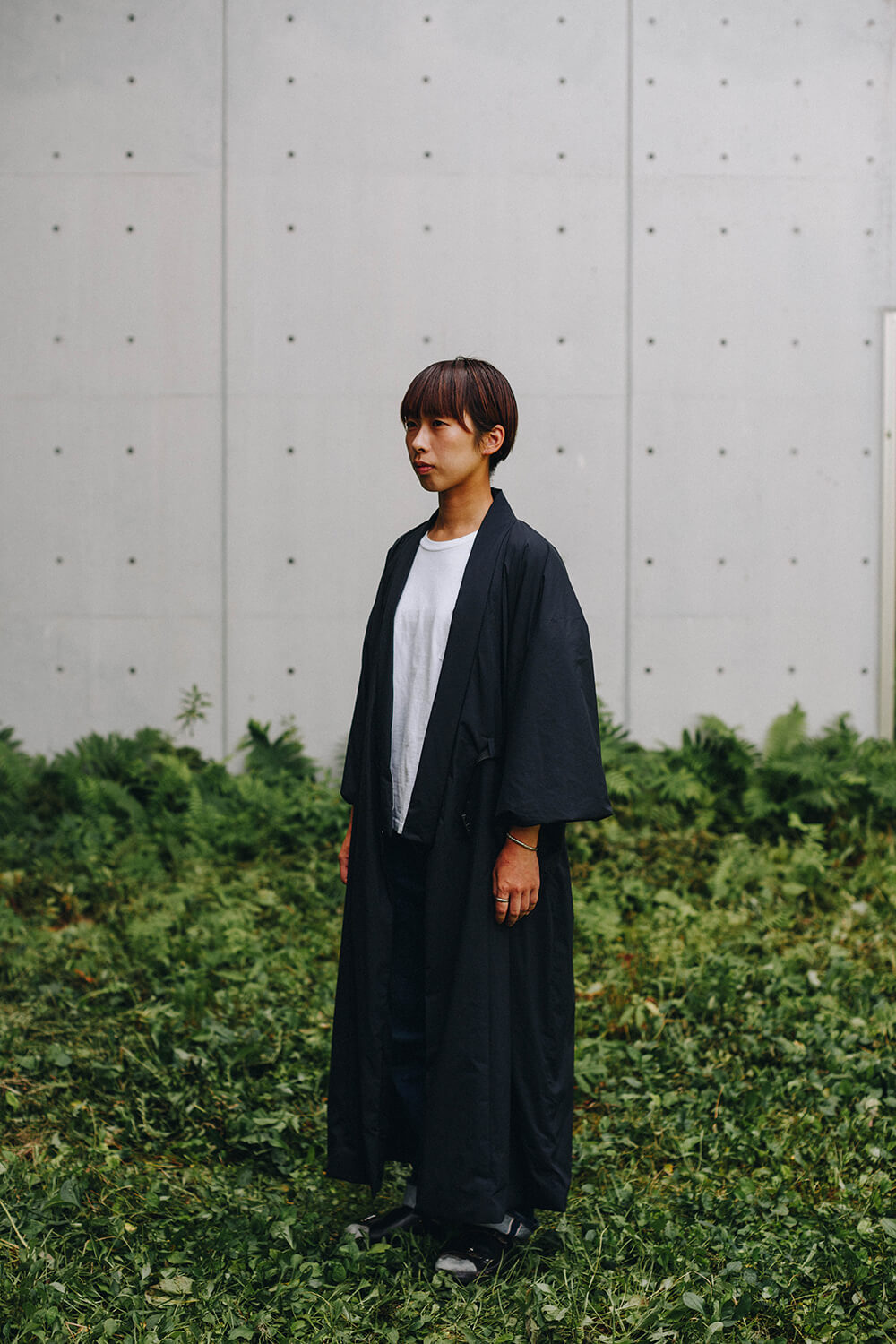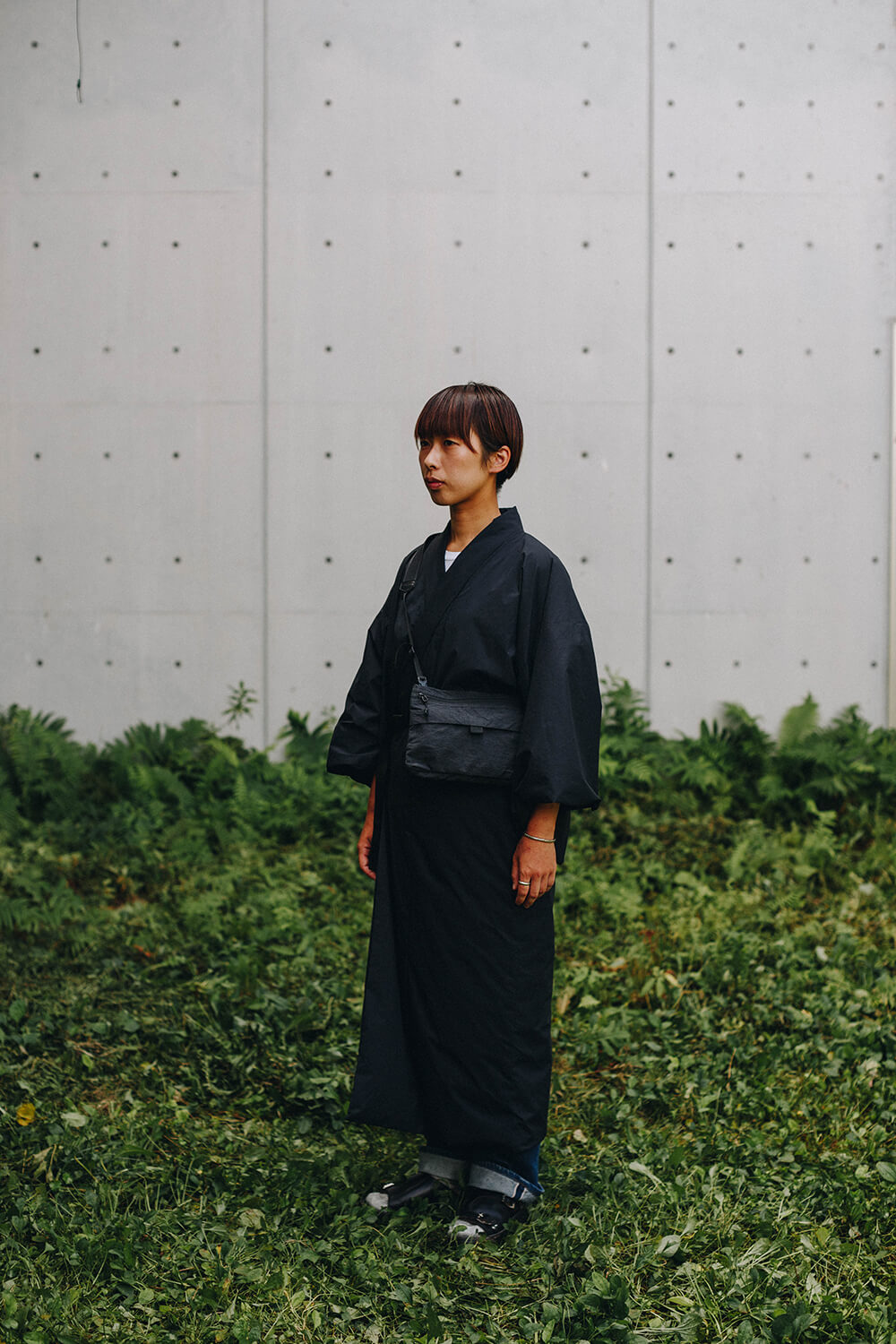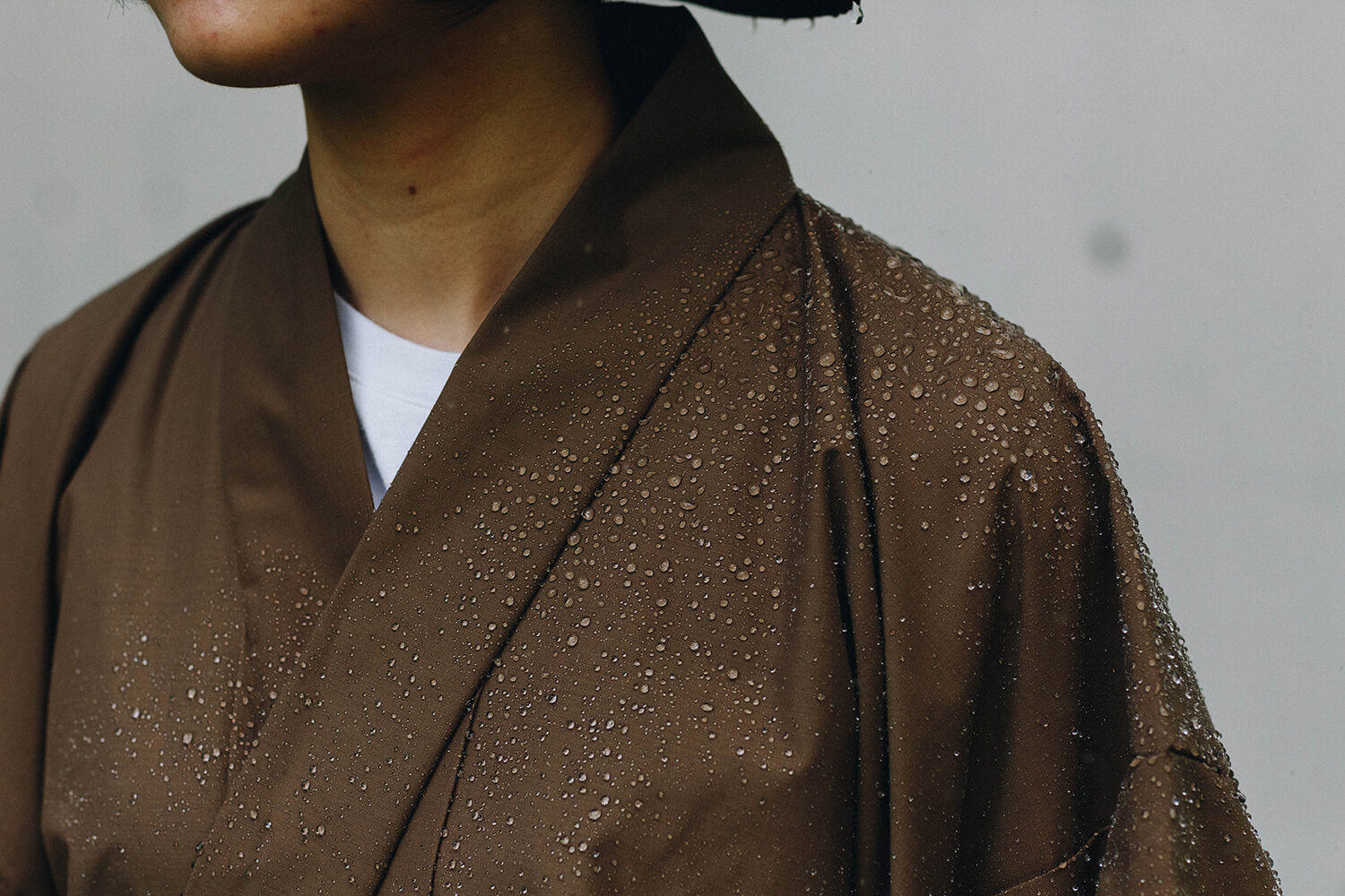 今回の2019年秋冬モデルには、ポリエステルをベースに耐摩耗性に優れたアラミド繊維を混紡したリップストップ素材を採用。生地表面には撥水、裏面には防風加工を施しており、軽量でありながら様々な天候に対応します。通常のポリエステルに比べて難燃性にも優れているため、着物を着て焚火を楽しむことも可能です。