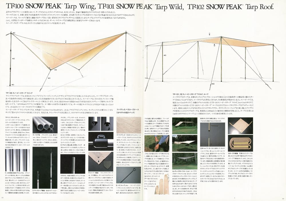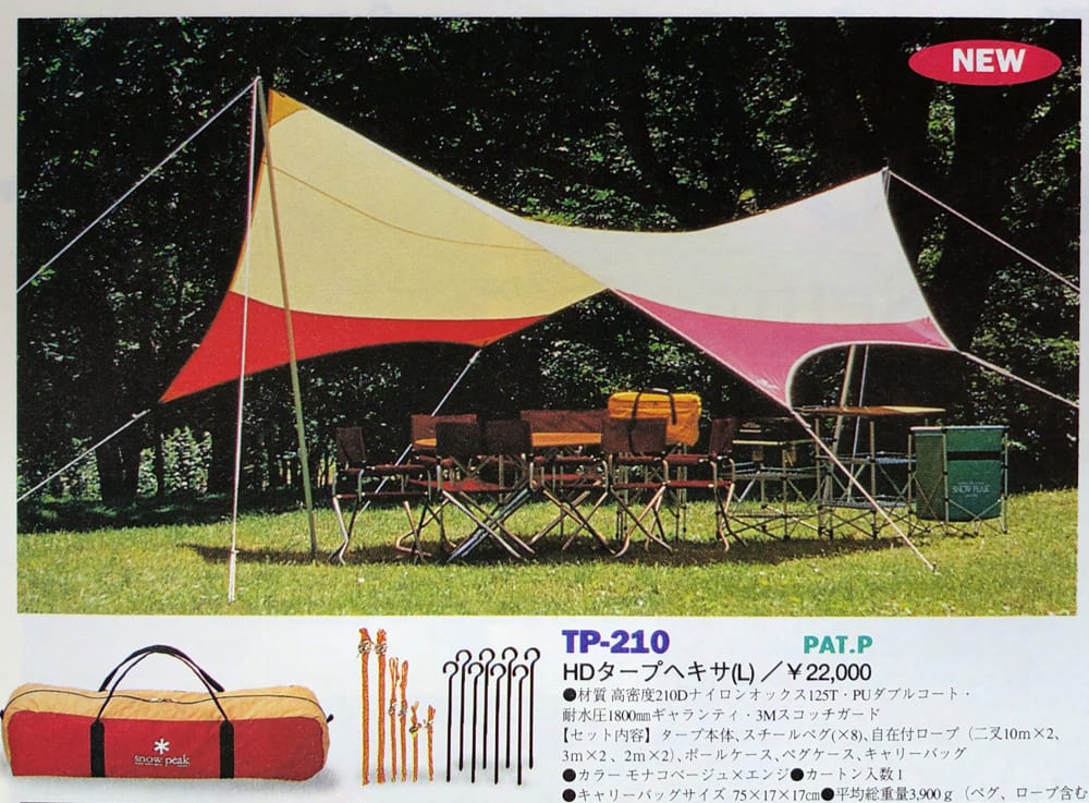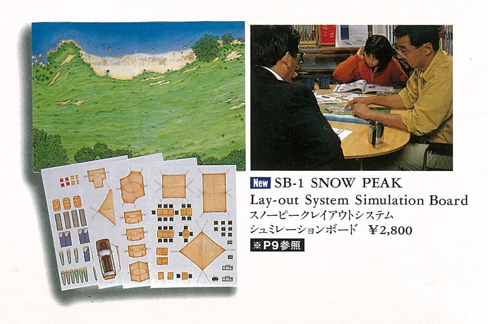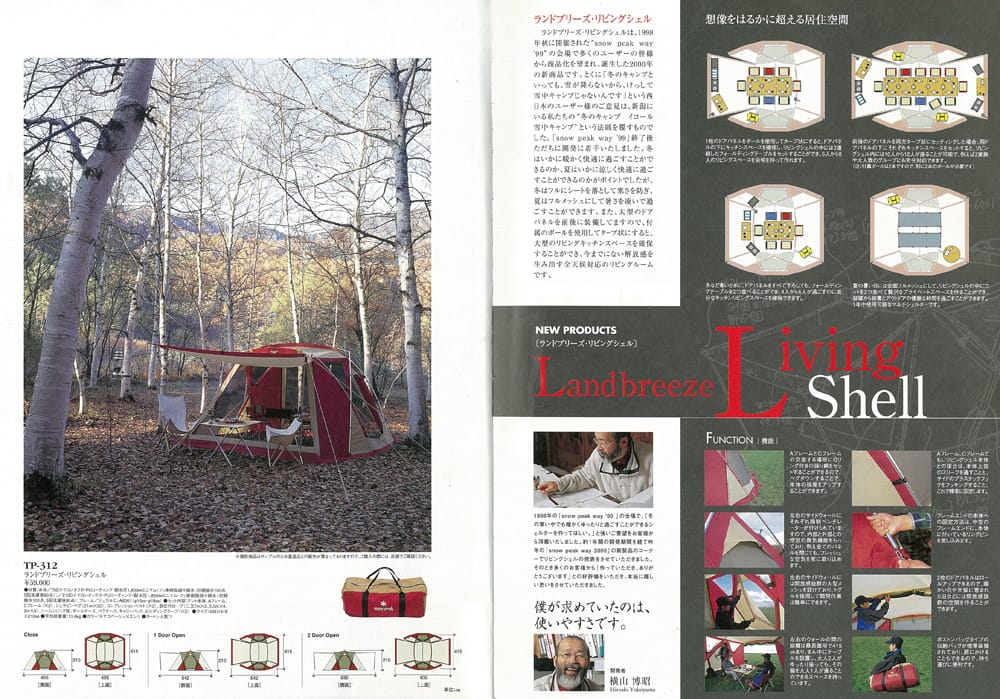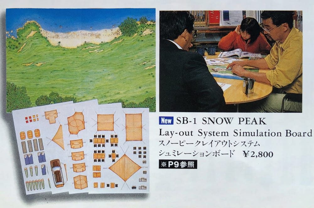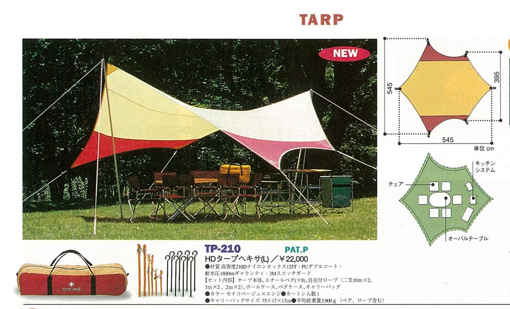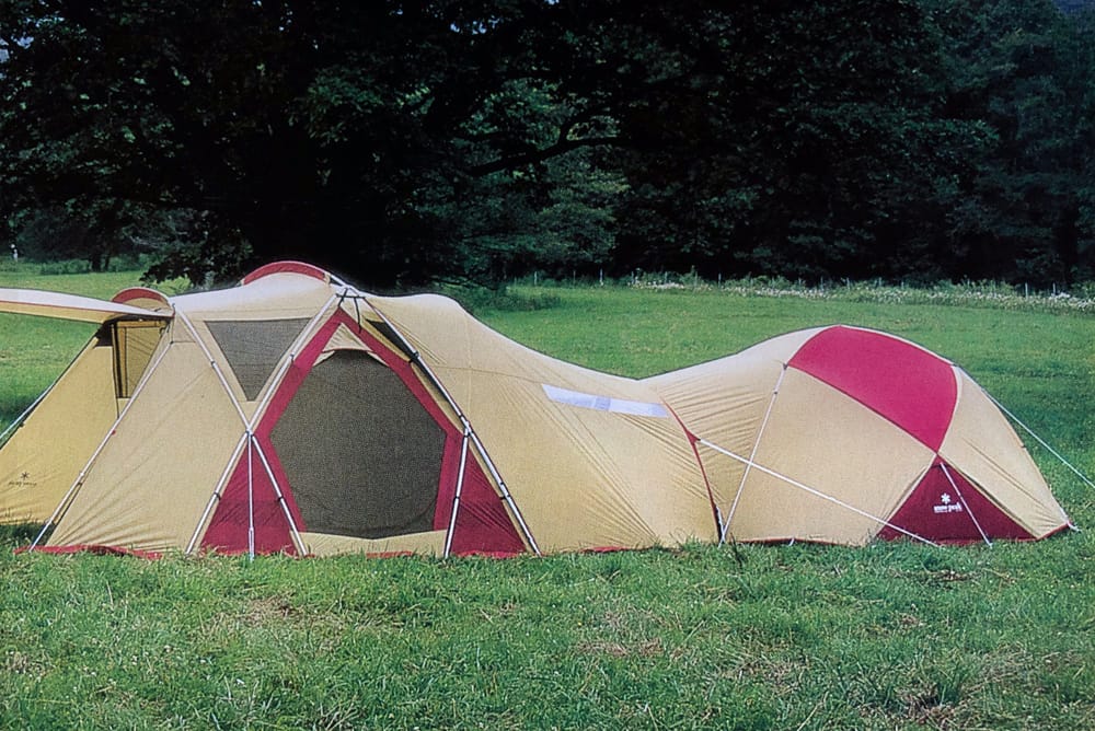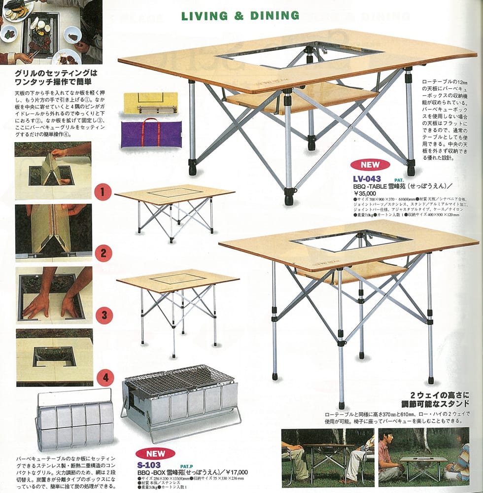 90年代に入ると、快適基準寸法という独自のサイジングを製品にデザインして、フィールドにおけるリビング・キッチン・ベッドルームというシステムを構築し、新しいライフスタイルの提案をしました。スノーピークはキャンピングギアのパイオニアメーカーとして日本のアウトドアシーンに完全に定着しました。ロゴマークは織ネームとしてタープやテントに付くだけでなく、テーブルの天板にも焼き印として刻まれました。