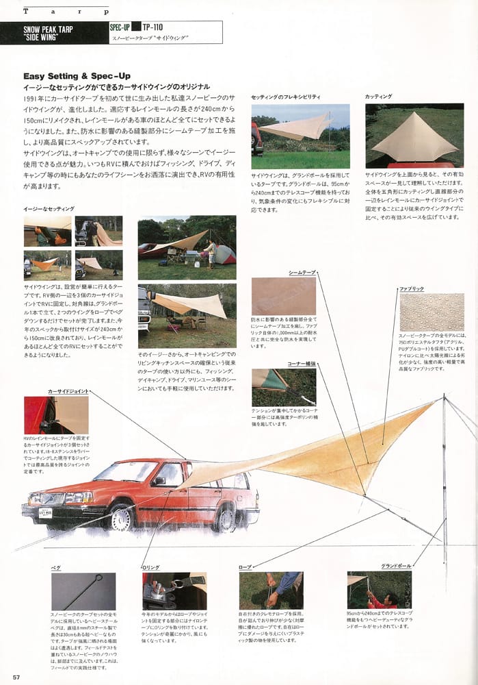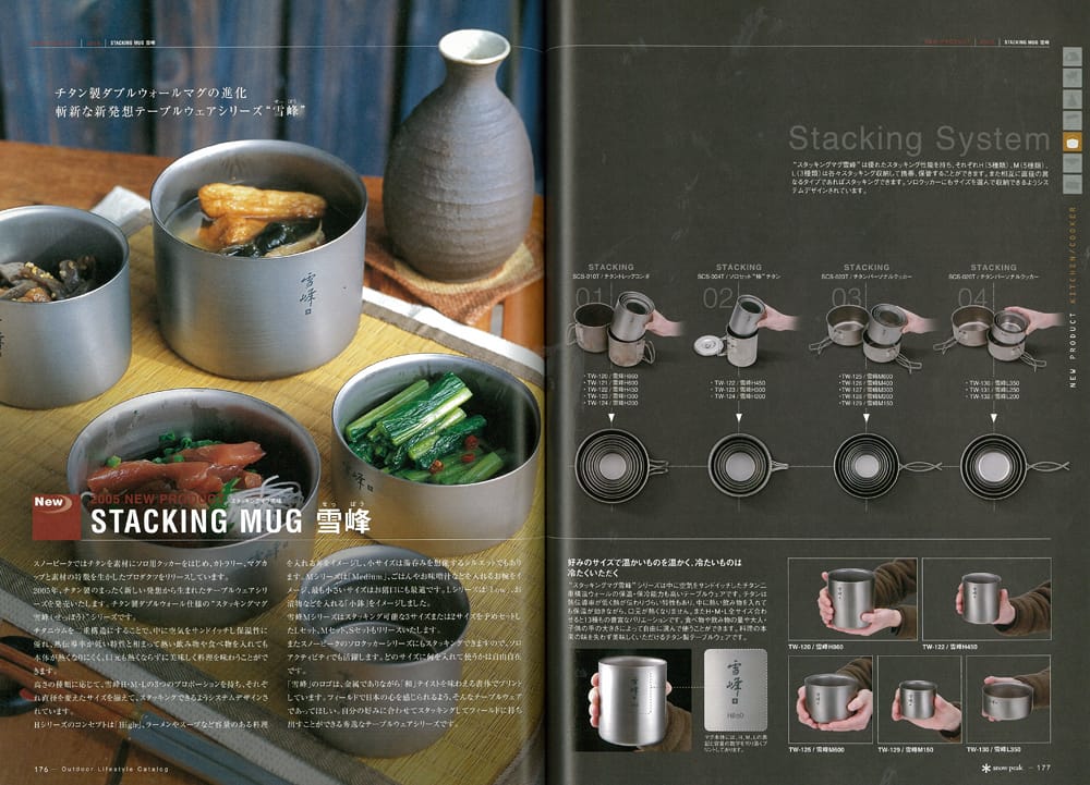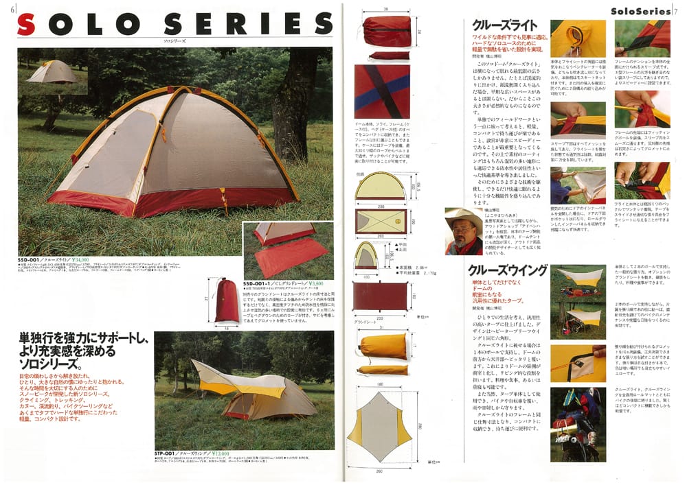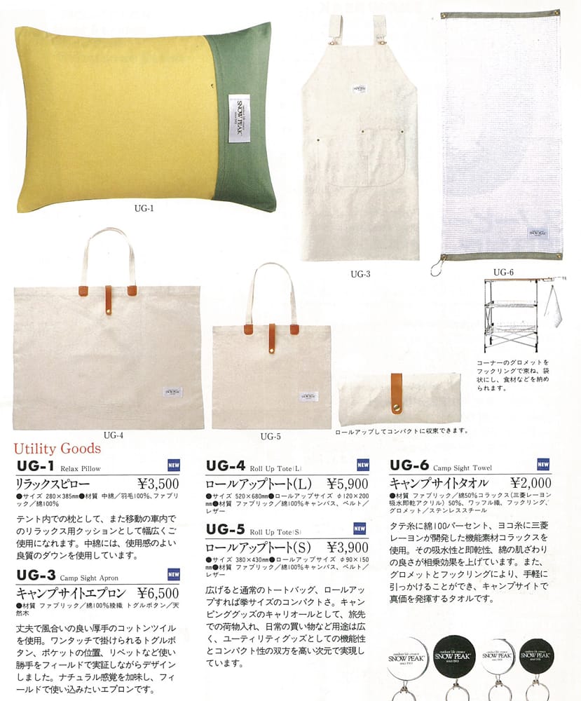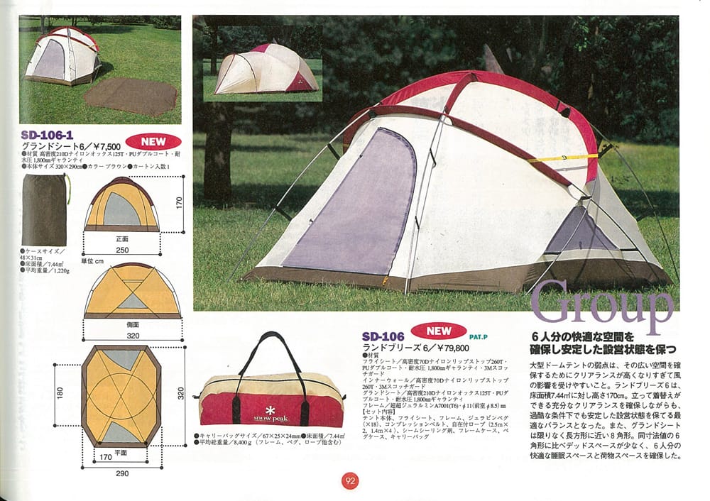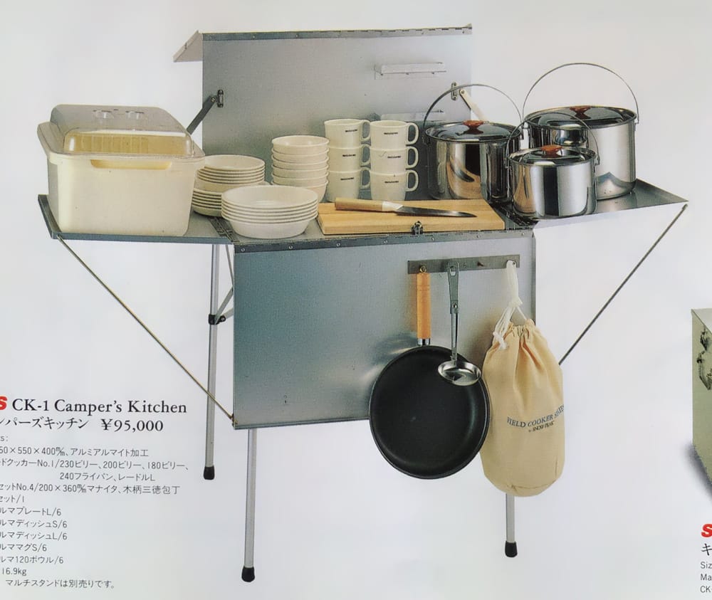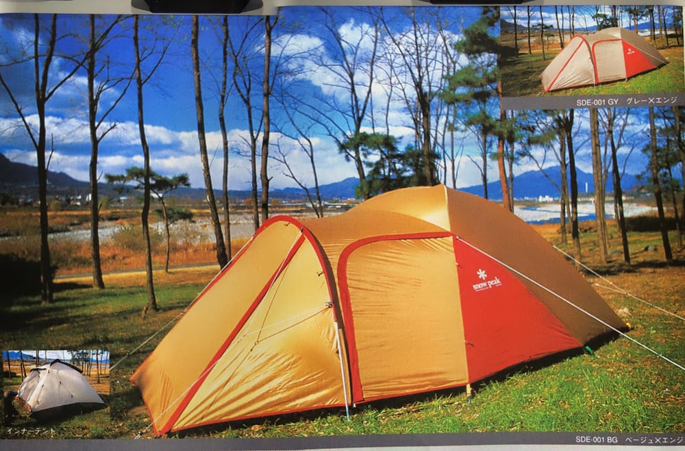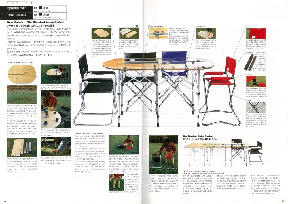 90年代に入ると、快適基準寸法という独自のサイジングを製品にデザインして、フィールドにおけるリビング・キッチン・ベッドルームというシステムを構築し、新しいライフスタイルの提案をしました。スノーピークはキャンピングギアのパイオニアメーカーとして日本のアウトドアシーンに完全に定着しました。ロゴマークは織ネームとしてタープやテントに付くだけでなく、テーブルの天板にも焼き印として刻まれました。